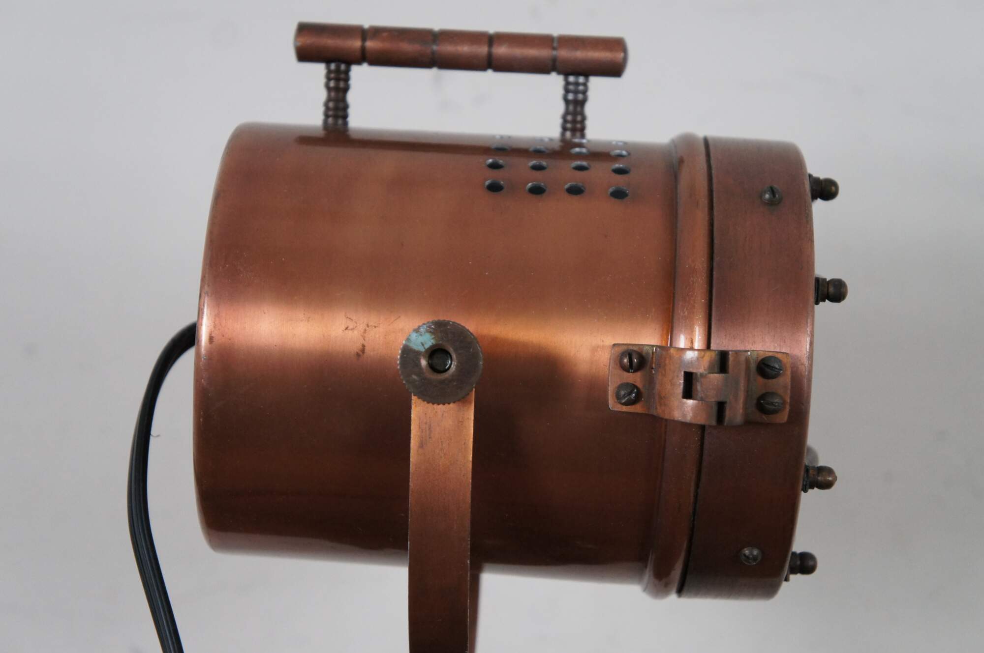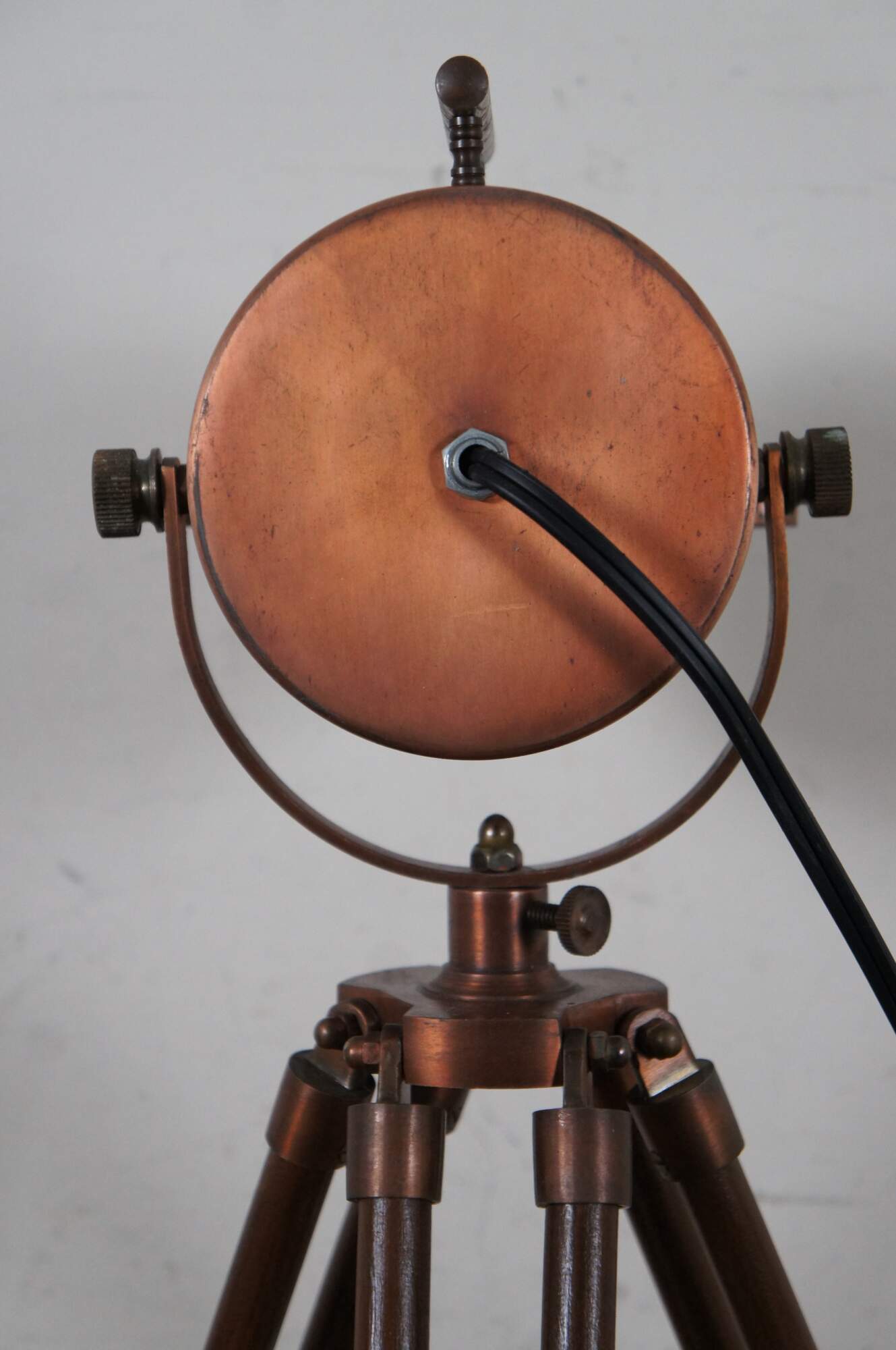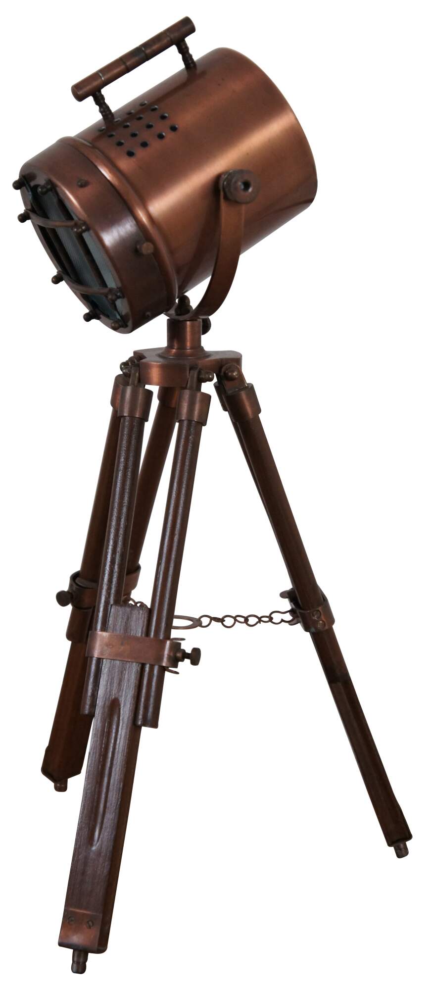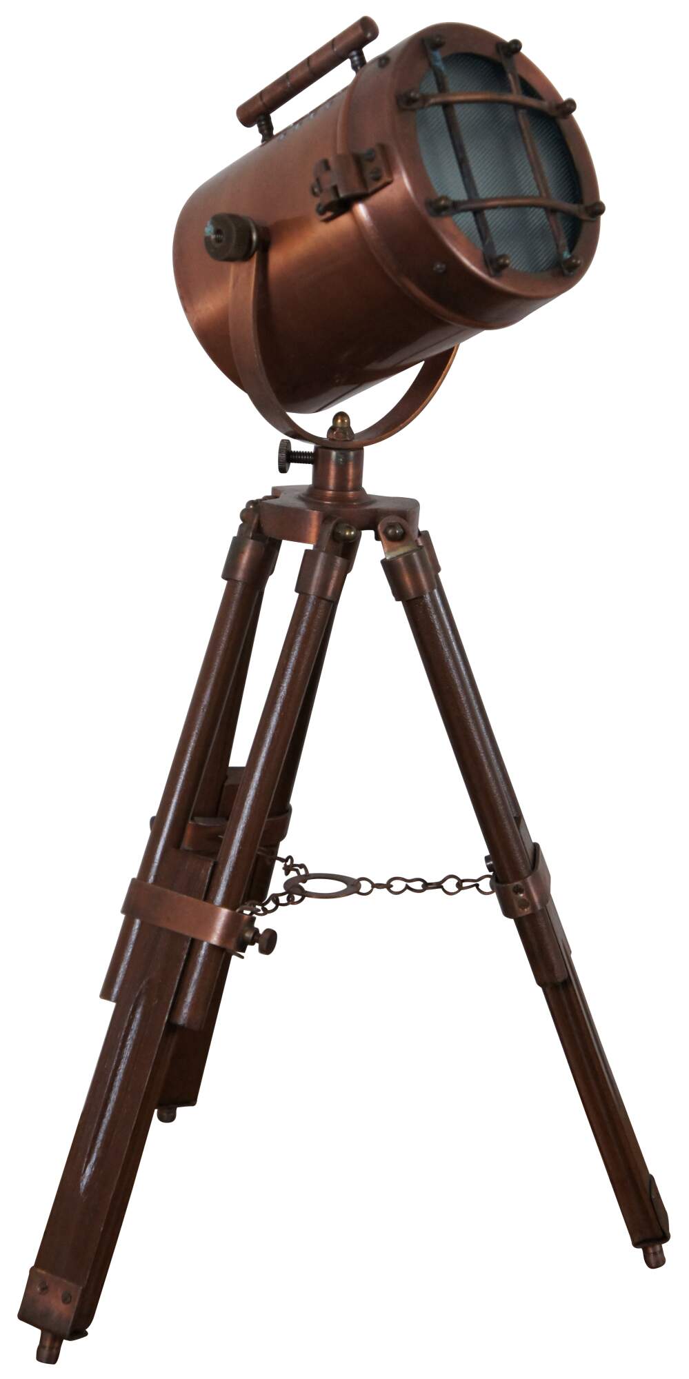 Vintage nautical style spotlight / searchlight / cinema desk or table lamp featuring a brushed copper finish, extendable tripod legs, and a fully rotating head.