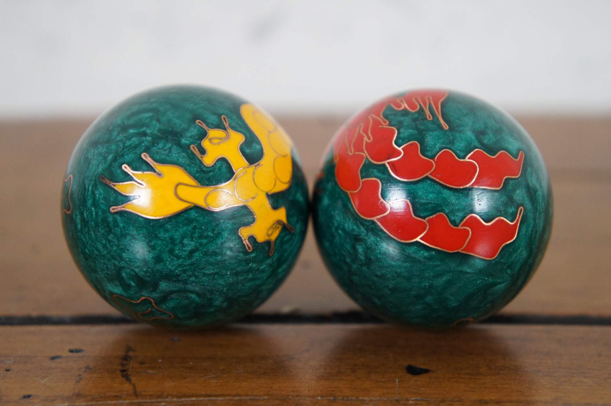 Pair of vintage Chinese cloisonne chiming baoding hand exercise / relaxation / therapy / stress / meditation balls and storage box, featuring a glittering, teal background with golden clouds, a yellow dragon, and a red pheonix.