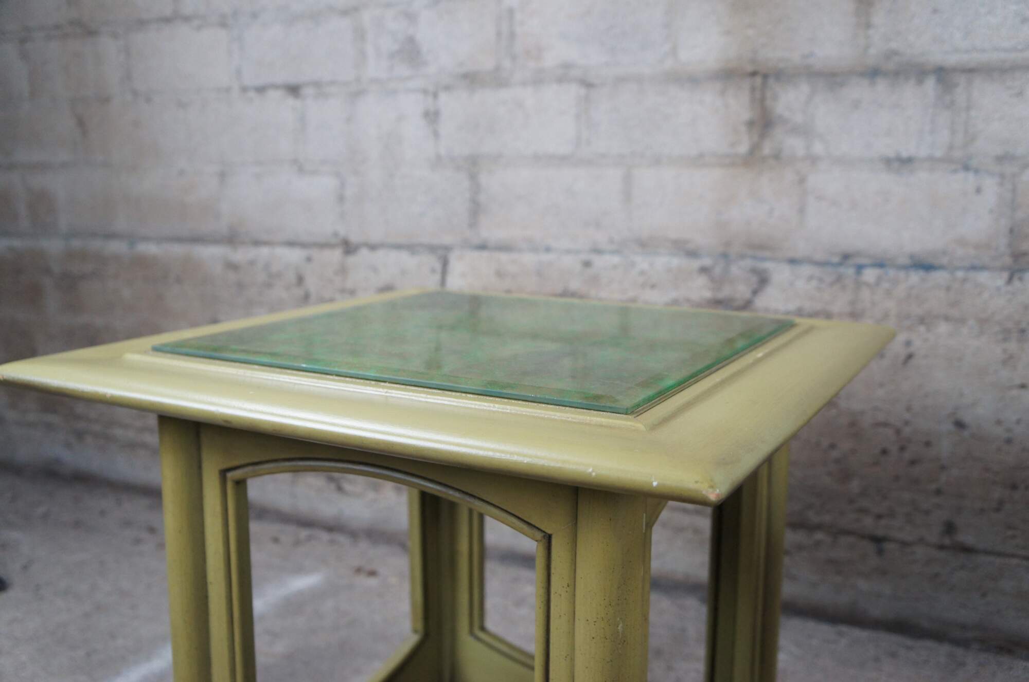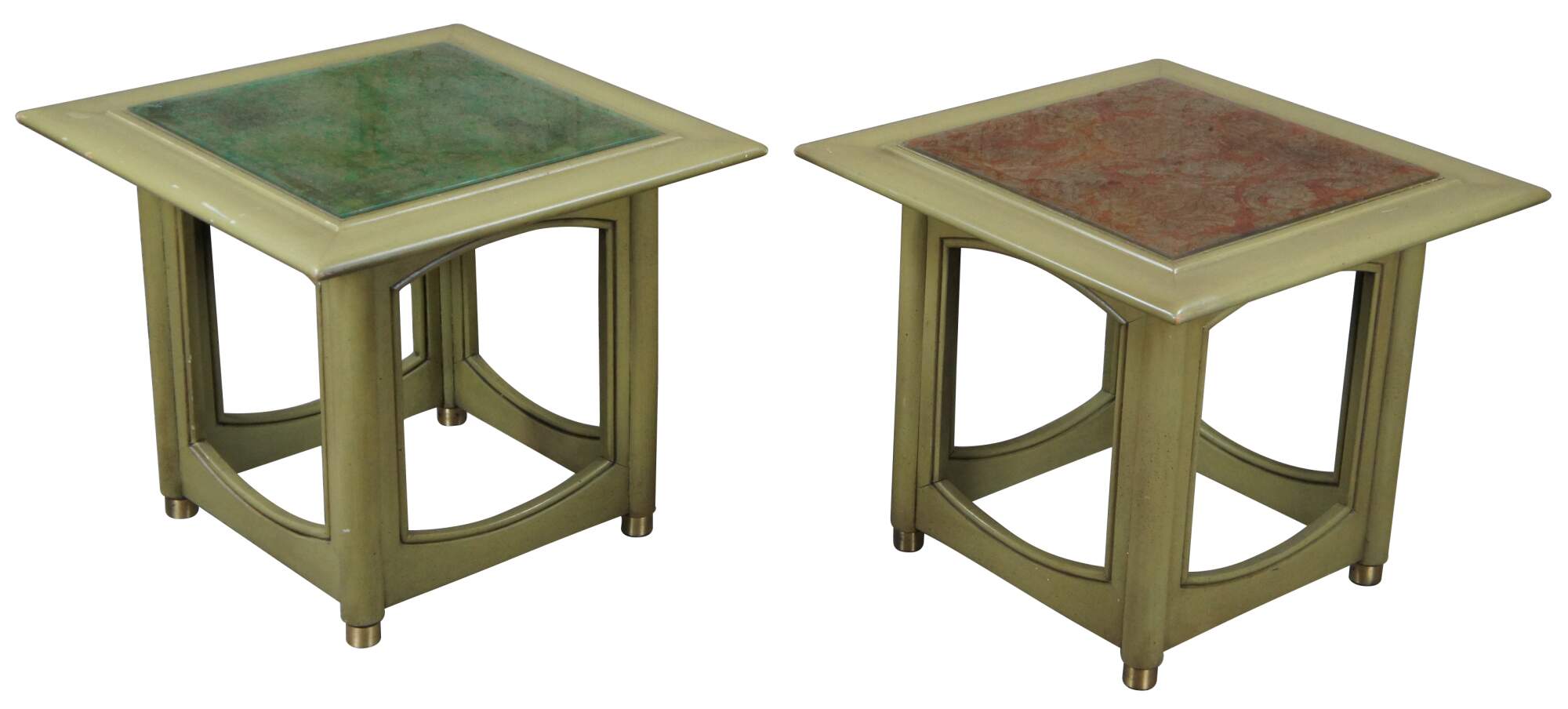 Pair of Hekman square accent tables. Made from wood with a distressed green finish. Features an open frame base with beveled glass tops. Each top is set over a french brocade. One is orange and the other is green. The glass is removeable and has the same green finish on the top.