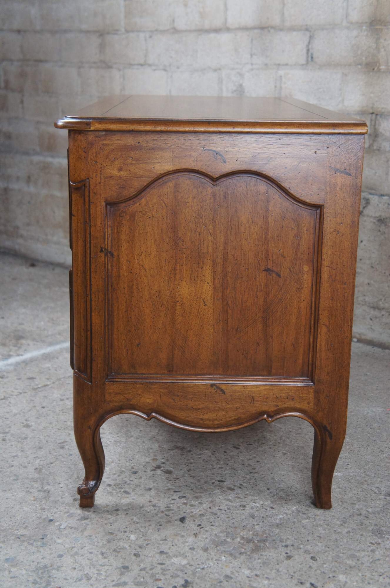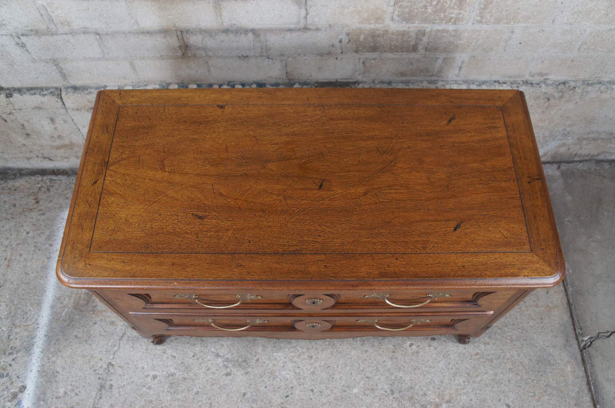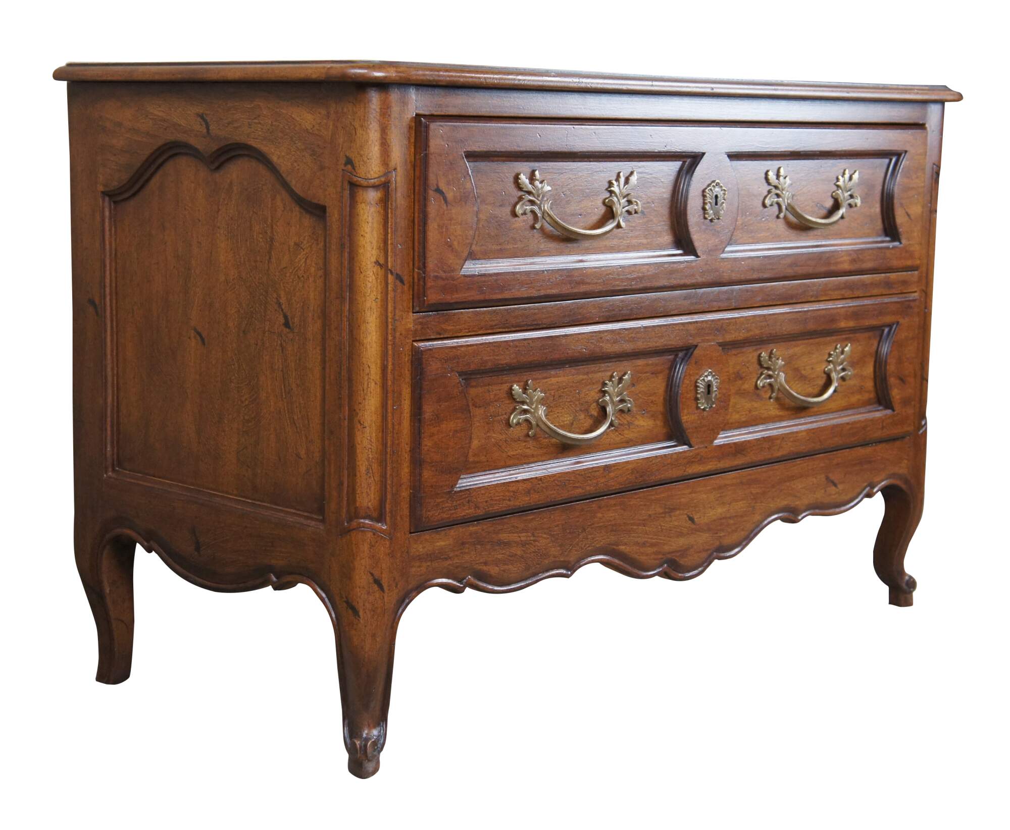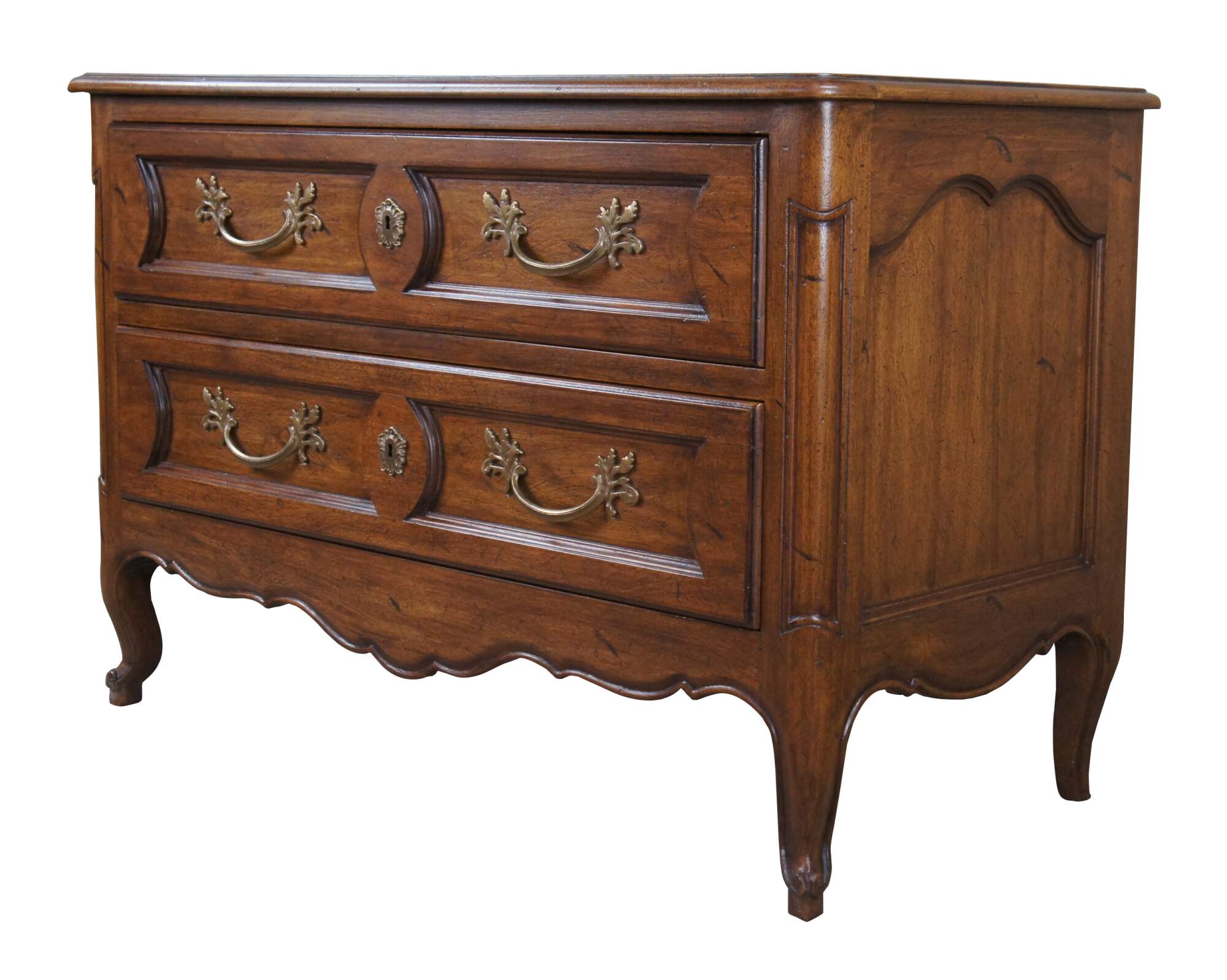 Vintage Mt. Airy walnut French Provincial / Country lowboy chest, dresser or stand featuring rectangular serpentine form with two drawers, brass hardware and cabriole legs. 2483.