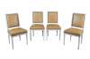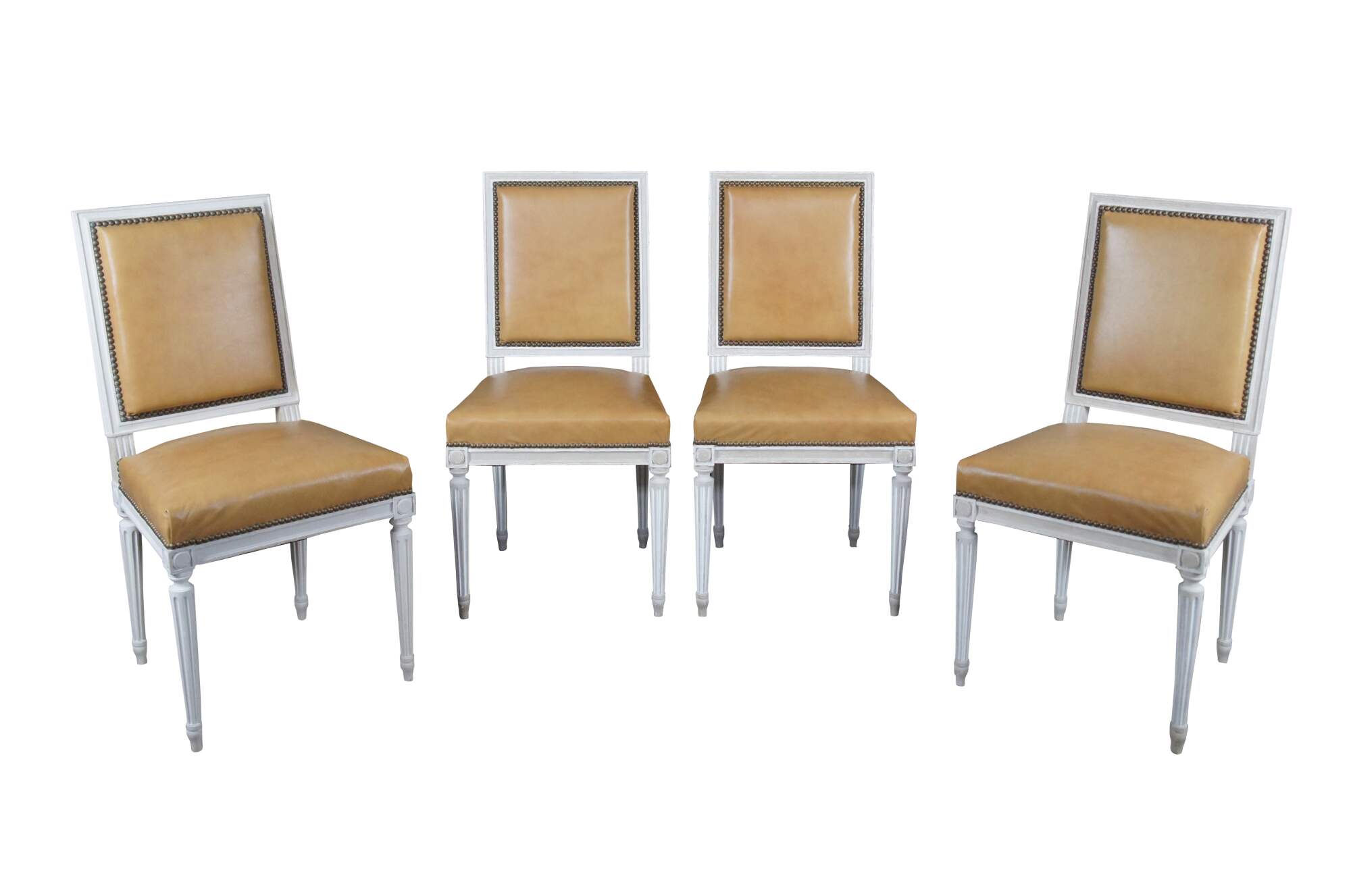 Baker Furniture French Louis XVI style Dining Side Chairs, circa 1960s. Features a square frame over turned and fluted legs leading to arrow feet. The chairs are upholstered in leather with nail head trim with a plaid backing. Provincial finish in gray and white