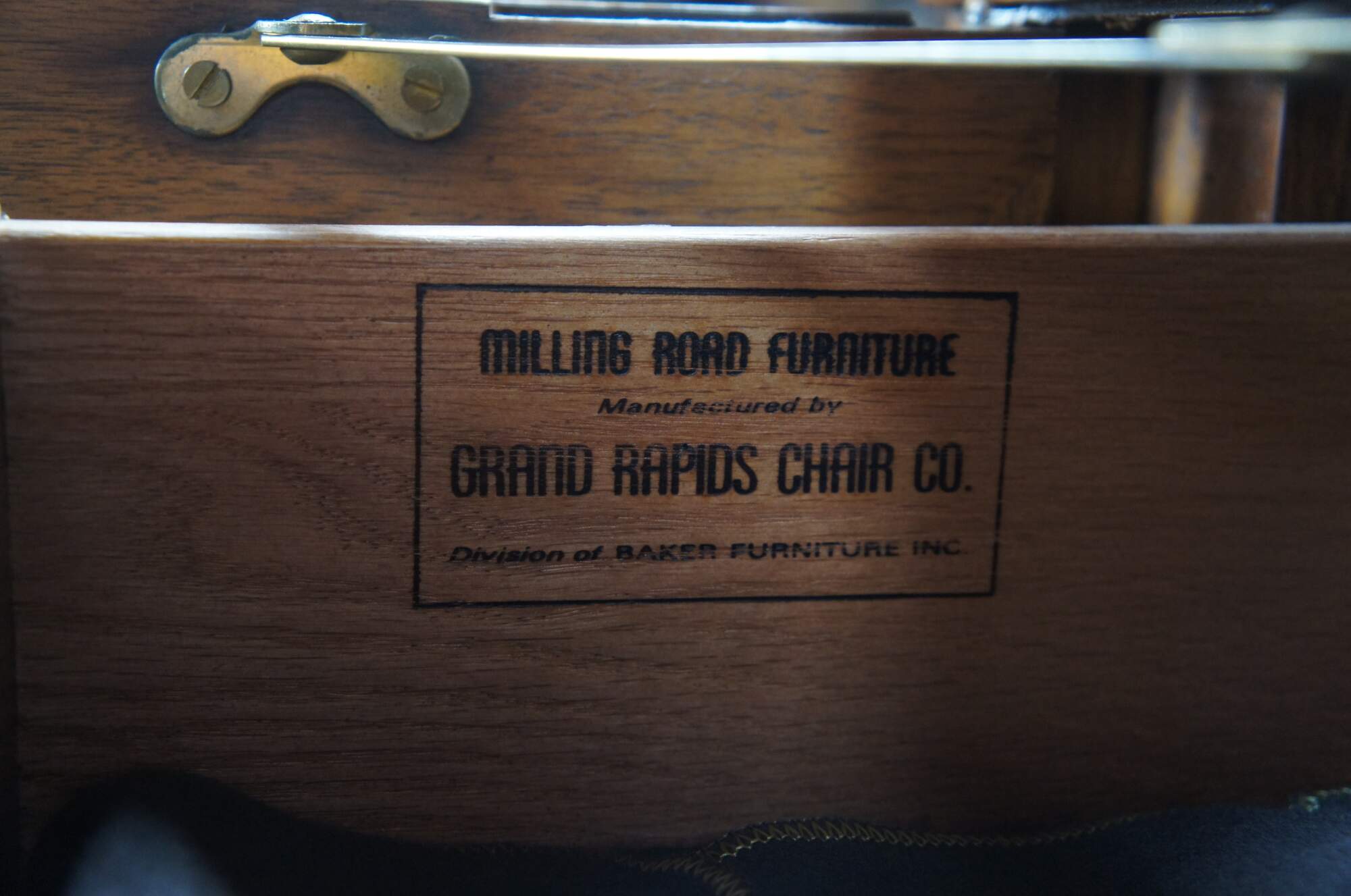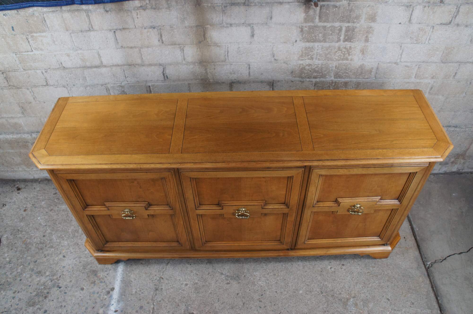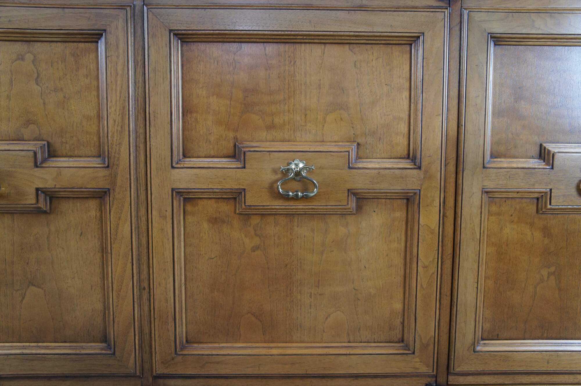 Baker Furniture Milling Road Sideboard, circa 1960s. A rectangular form made from walnut with chamfered corners. The case is fitted with 3 large doors having Italian Neoclassical and Tuscan style paneling. The cabinet opens via brass pulls to a large compartment with two fitted and dovetailed silver cloth lined drawers and one smaller cupboard with shelf. The case is supported by bracket feet. #3041