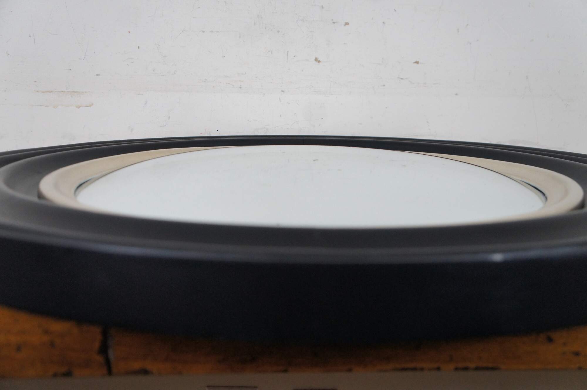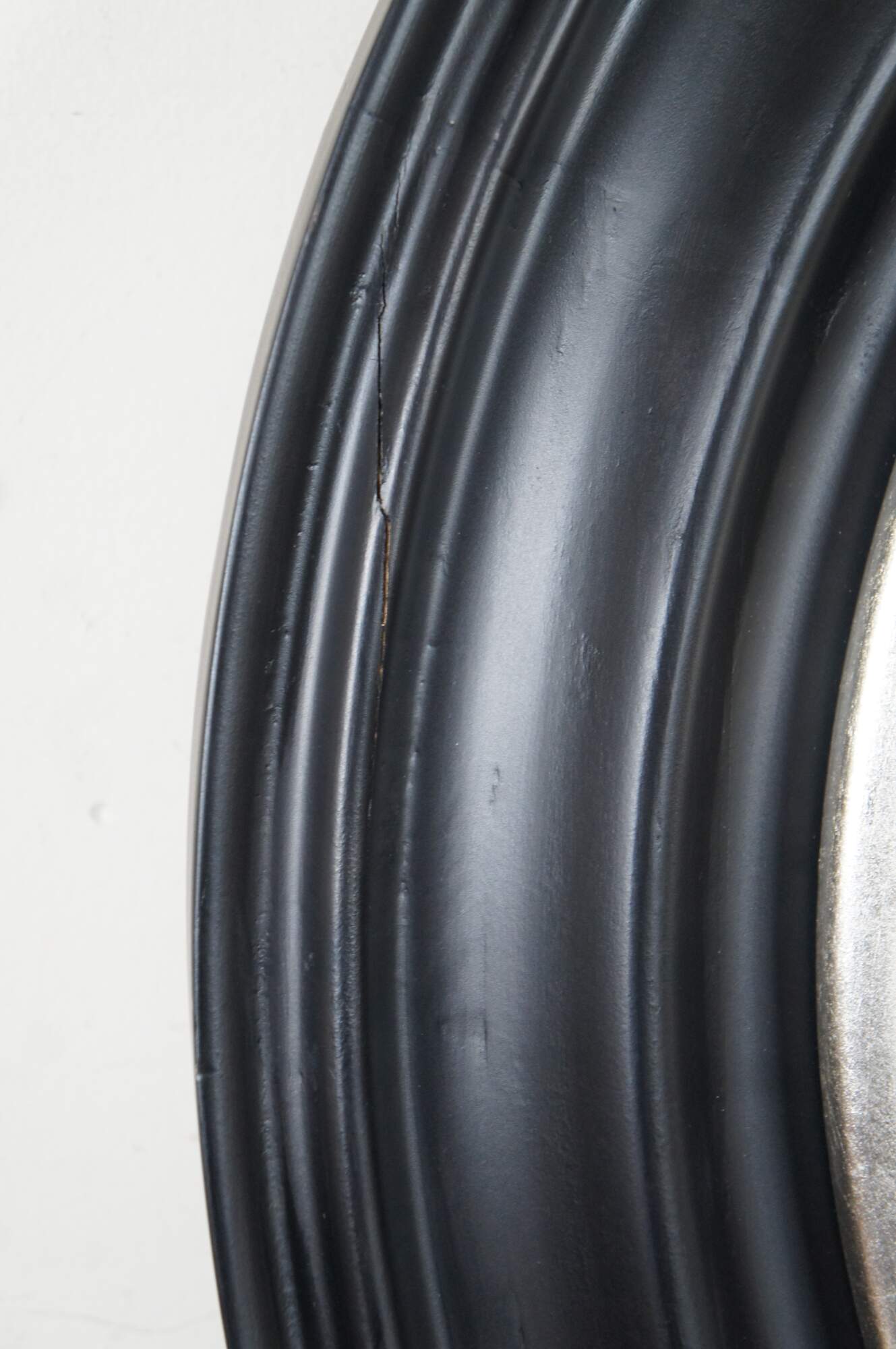Bullseye style convex wall mirror with a black beveled wood frame and champagne gilt trim.