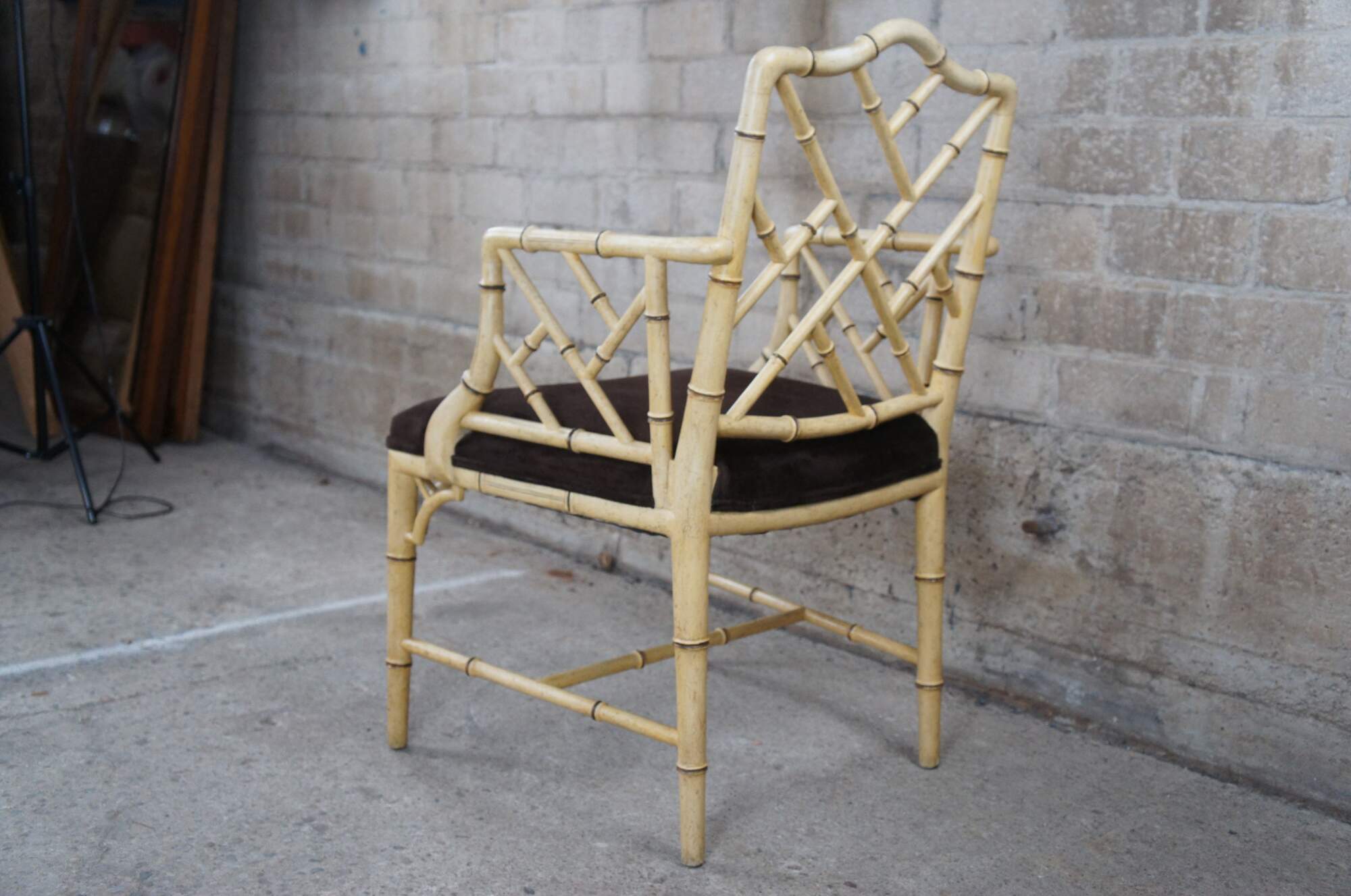Vintage Chinese Chippendale arm or desk chair by Hekman Furniture, circa 1960s. Faux bamboo form with interlaced arms and backing. Features open front corner brackets and an H stretcher. The chair seat is upholstered in a brown suede. Chair finish is Off-White Provincial.