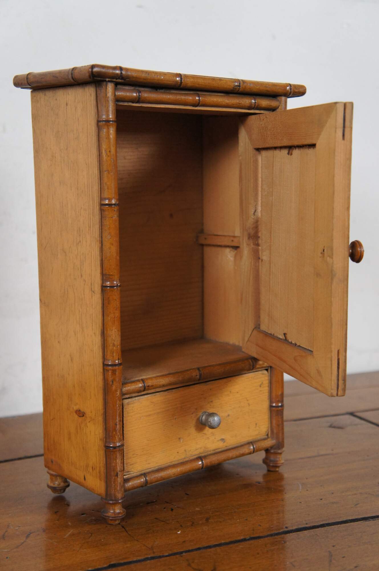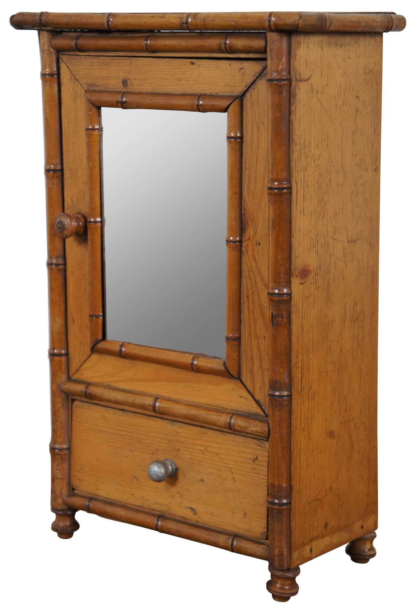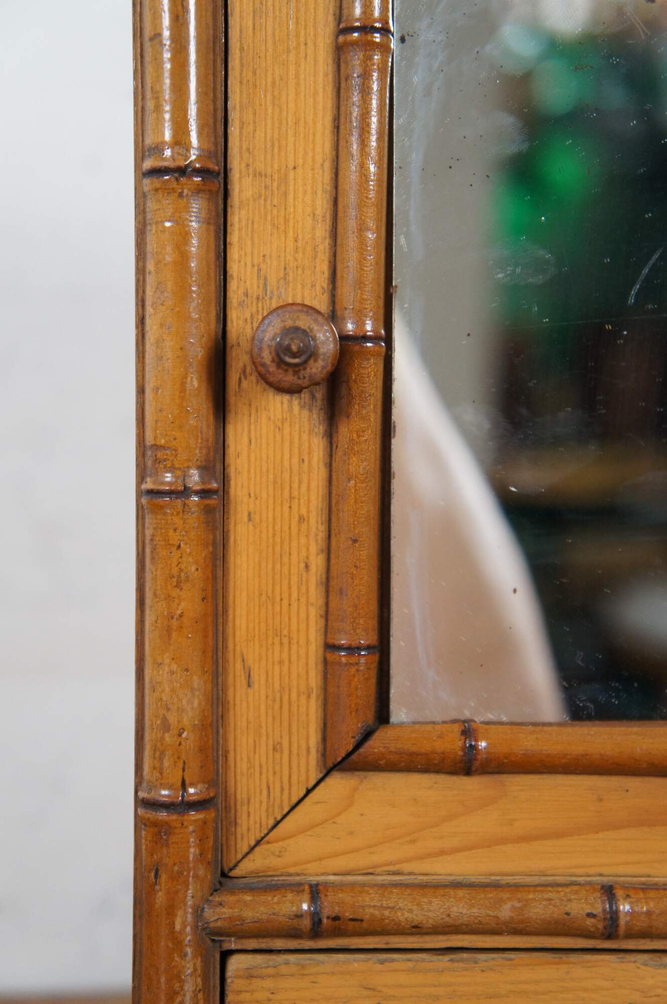Early 20th century doll furniture miniature wardrobe featuring a bamboo frame, mirrored door and lower drawer for accessories.