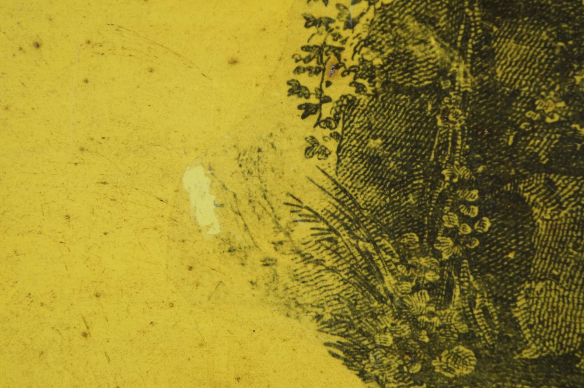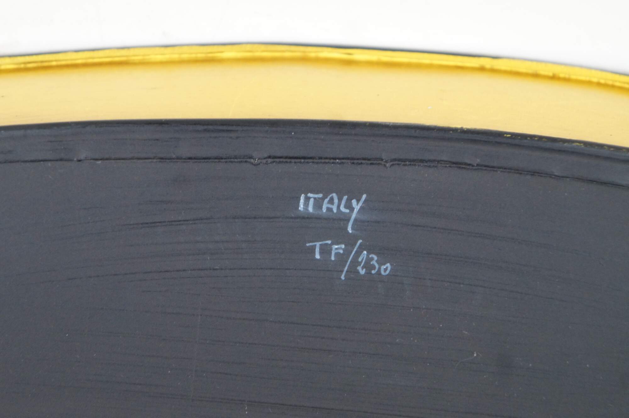 Early 20th century mustard yellow oval toleware serving tray with cut out handles, raised edge with stenciled trim, and French toile style transfer Provincial / Neoclassical scene surrounded by grape vine. Marked on back Italy TF/230.