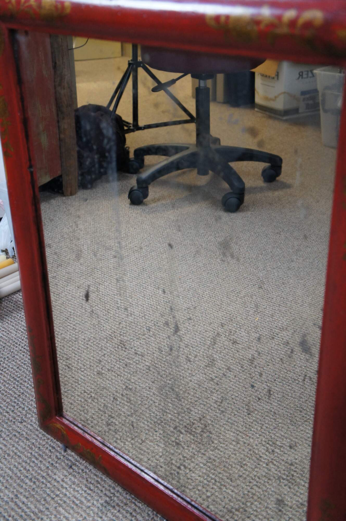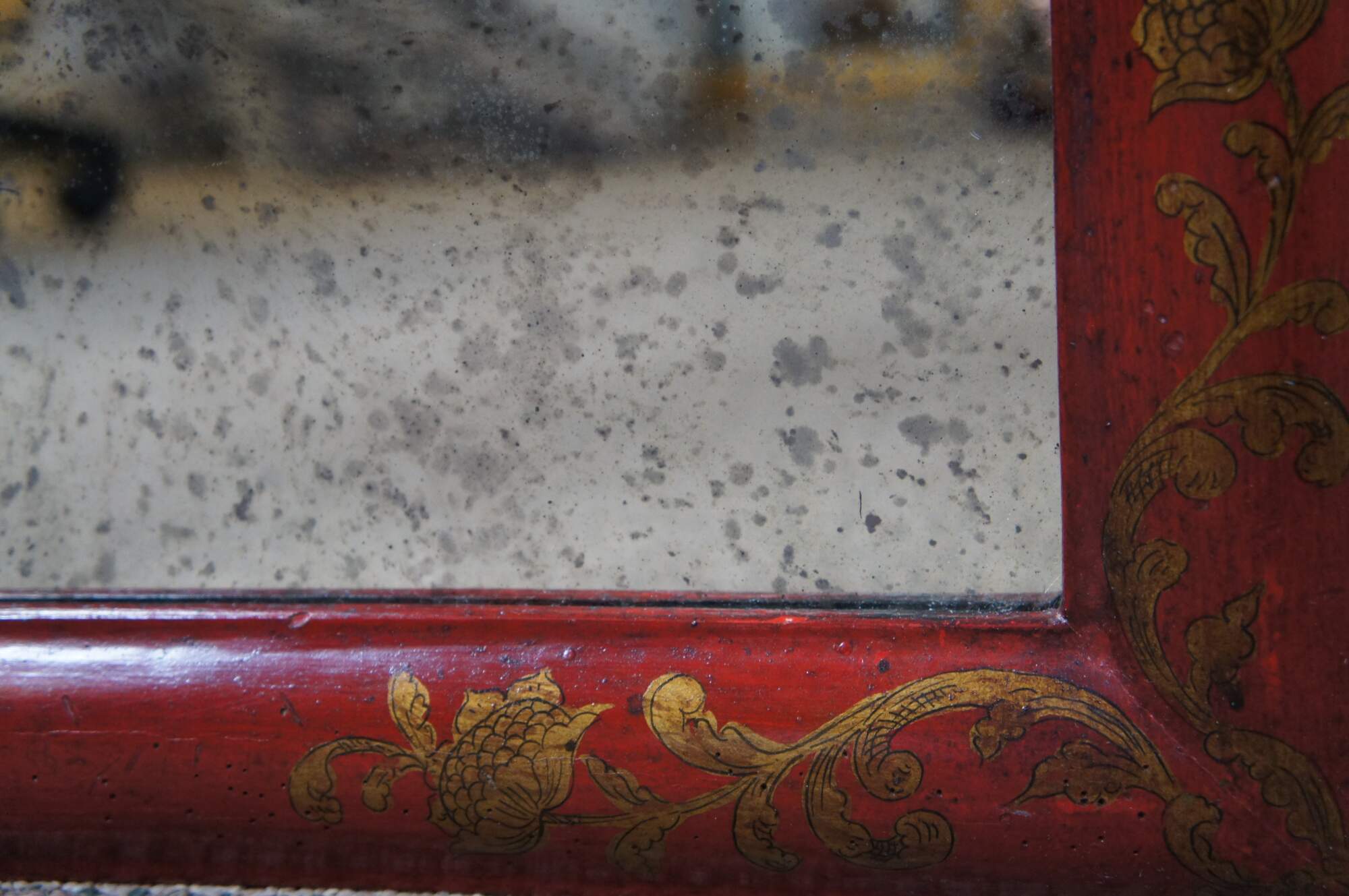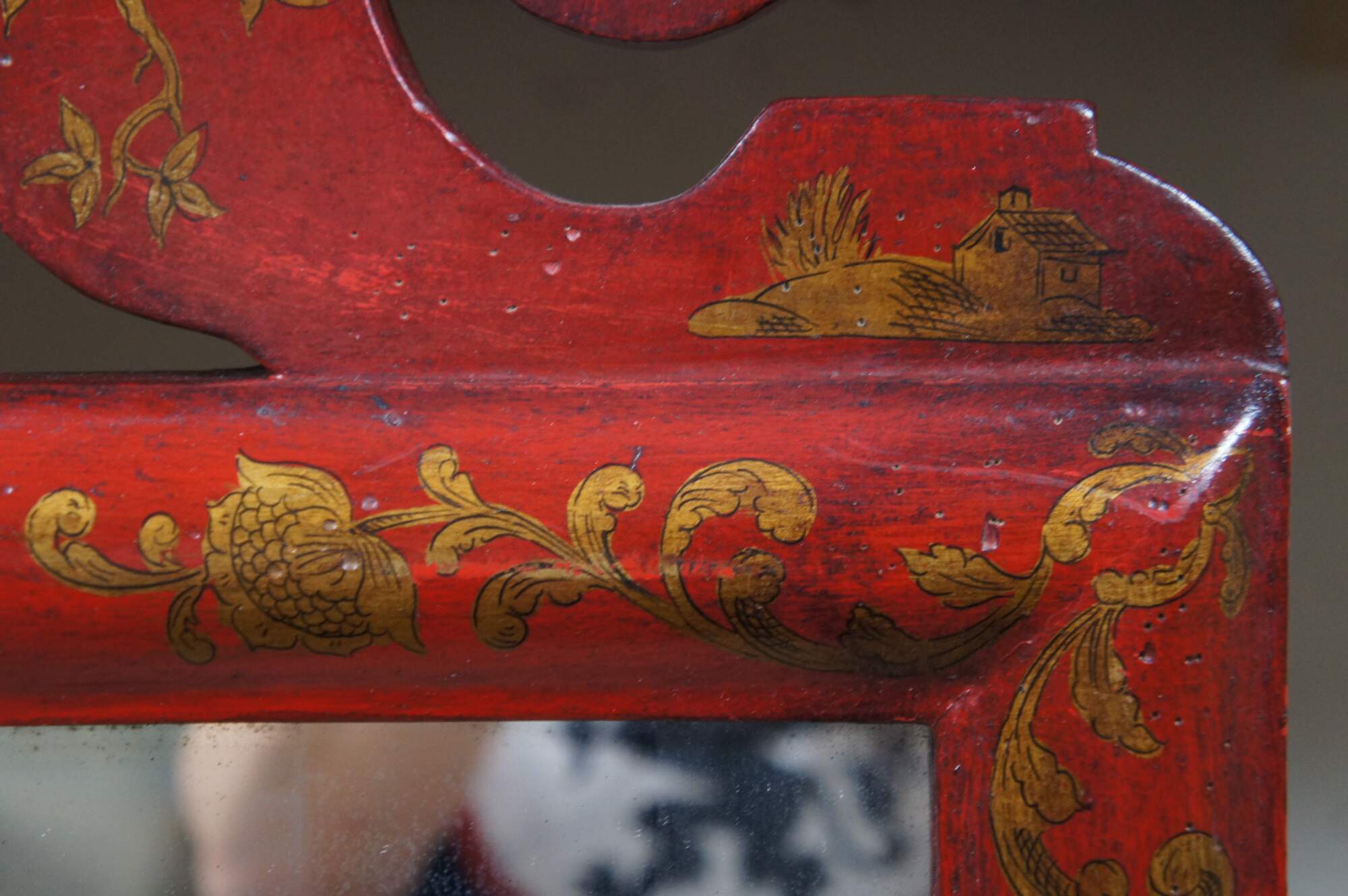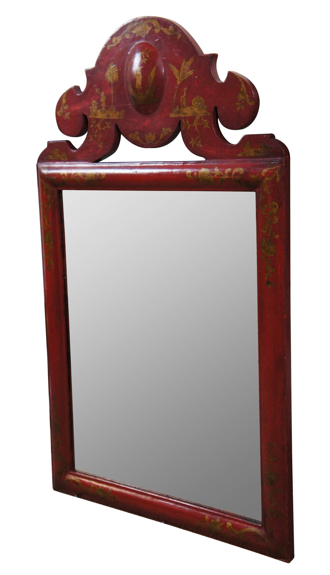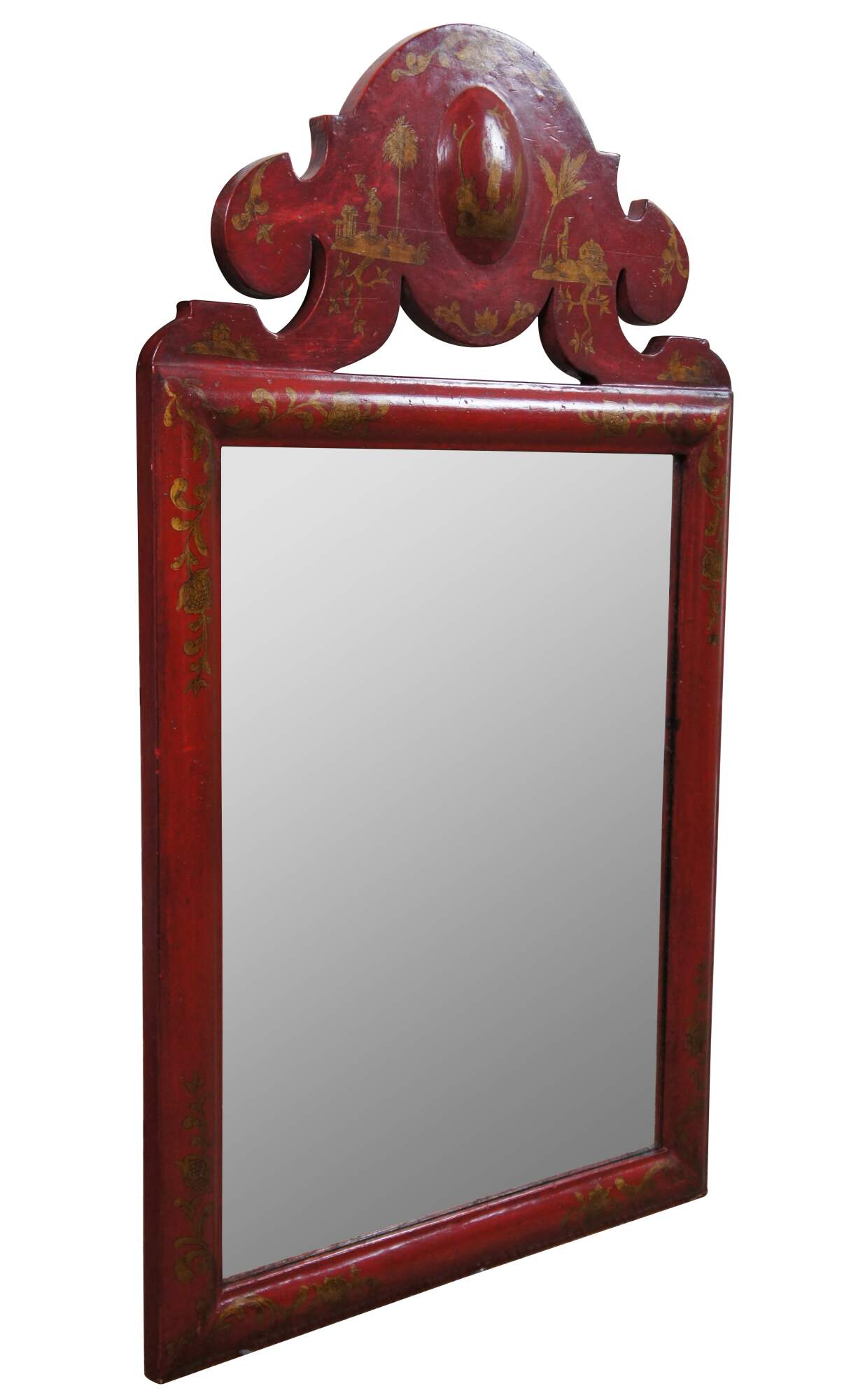 Vintage William & Mary / chinoiserie wall mirror japanned in scarlet with gold painted decoration, rectangular in shape with a pierced arched pediment. Marked Chapman Made in Spain on reverse.
