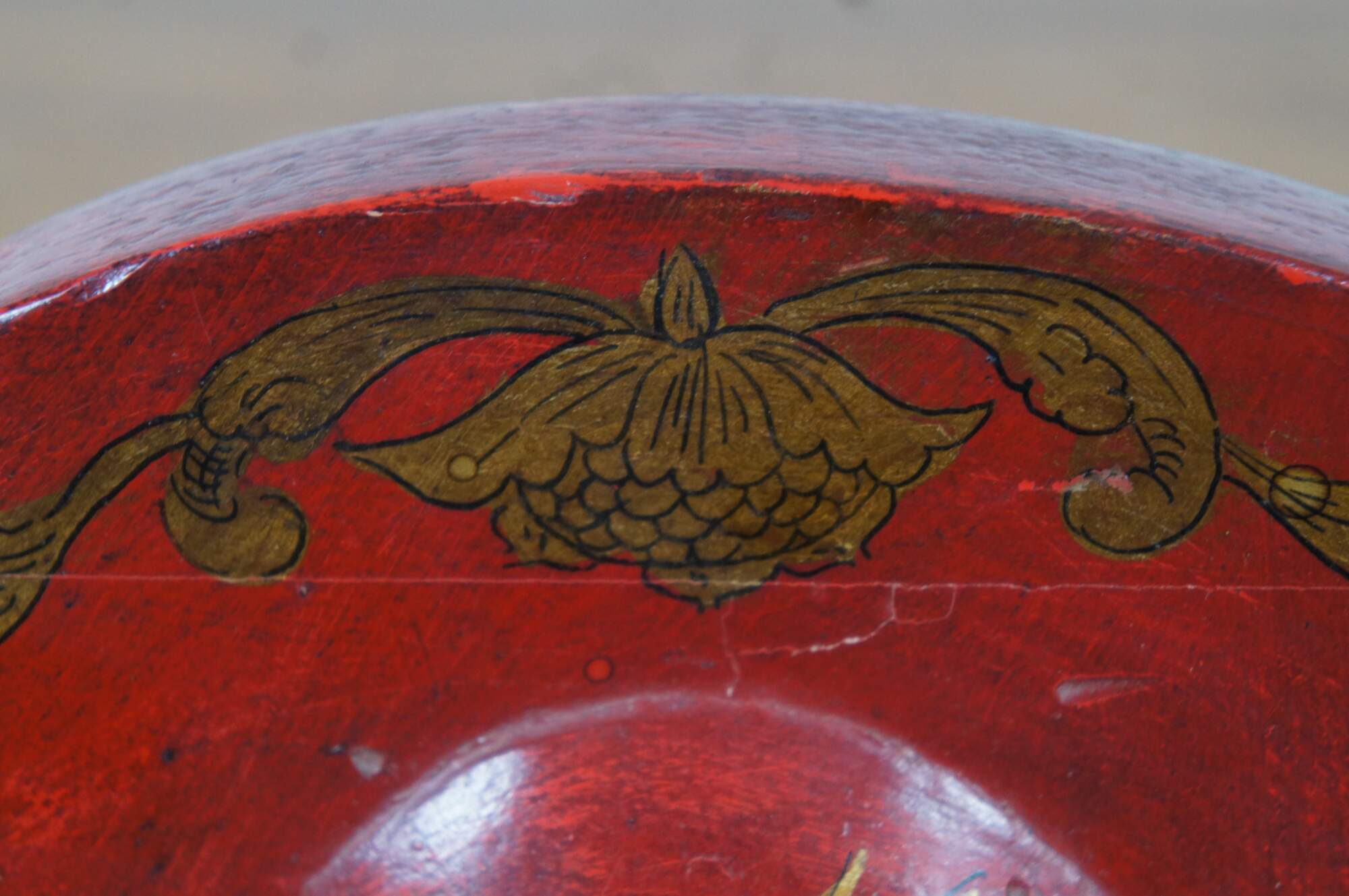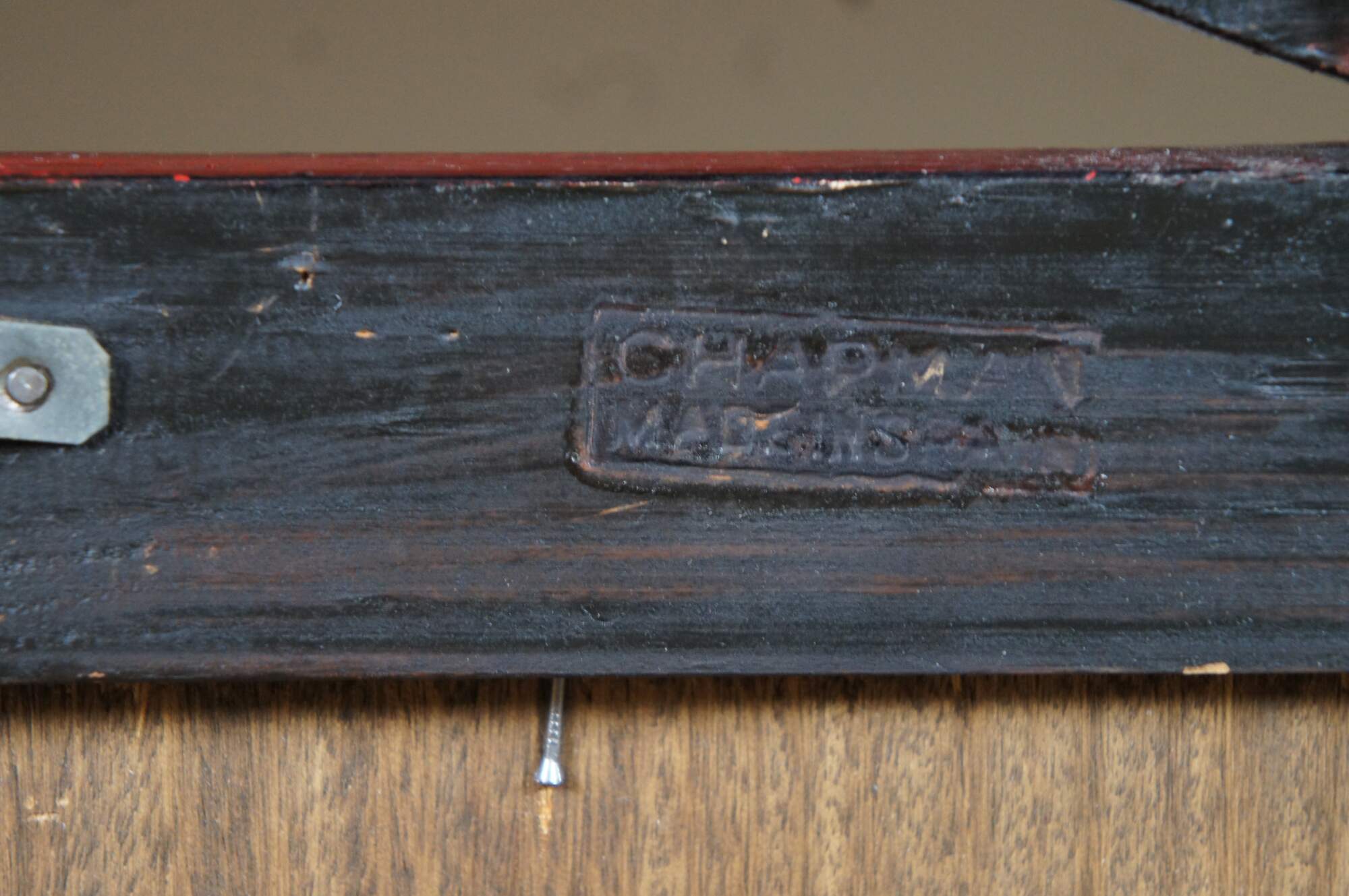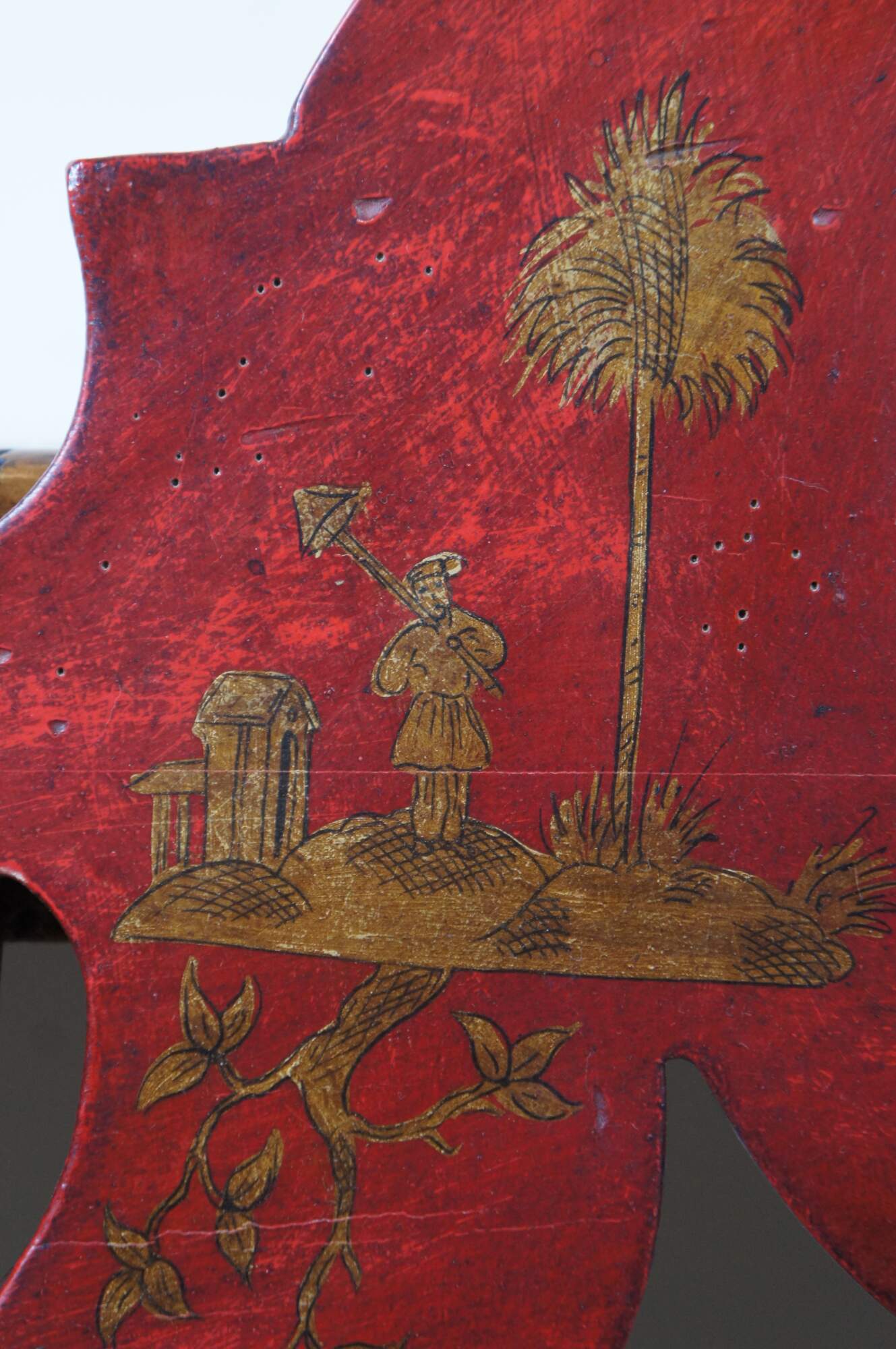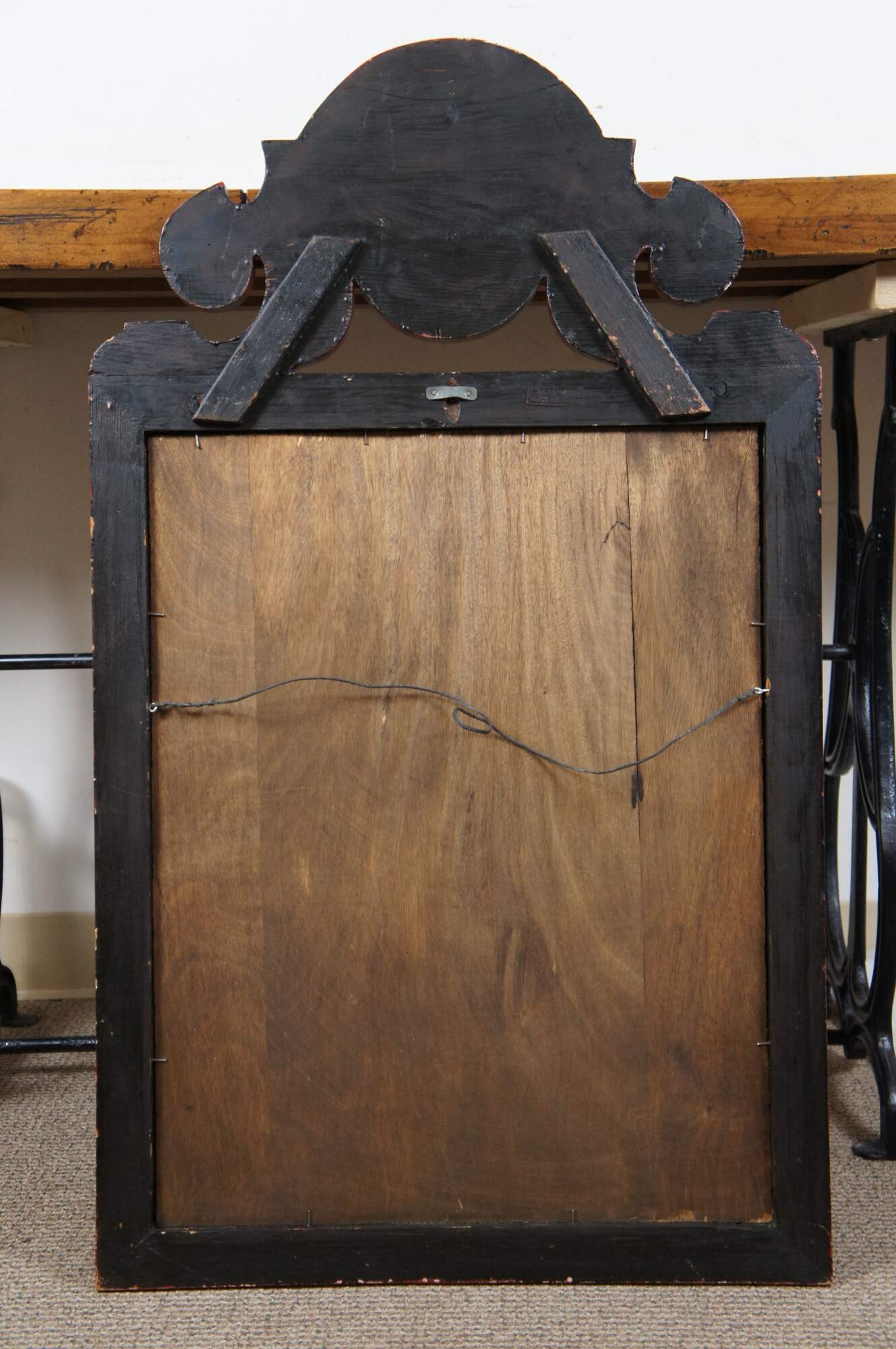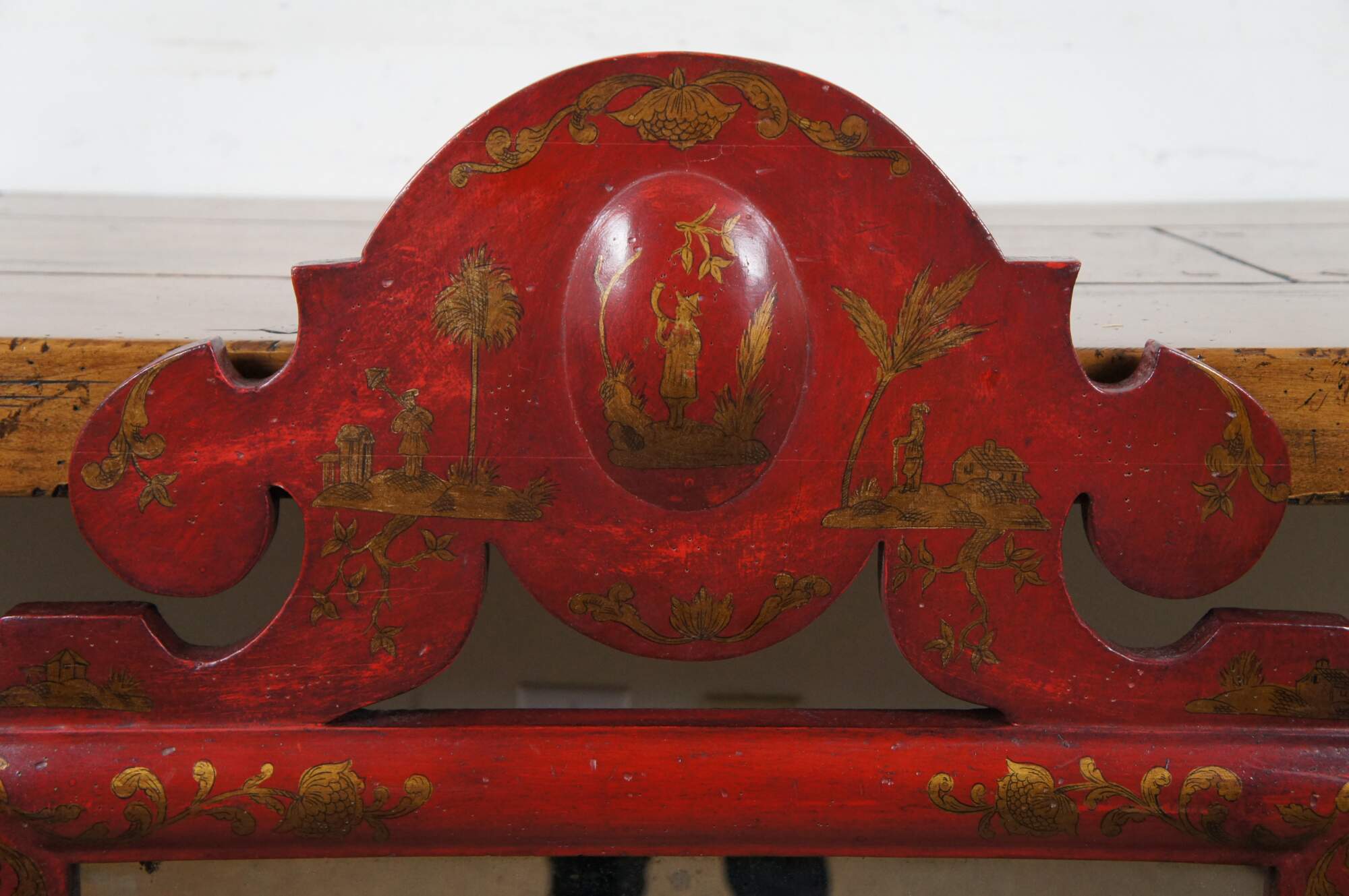Vintage William & Mary / chinoiserie wall mirror japanned in scarlet with gold painted decoration, rectangular in shape with a pierced arched pediment. Marked Chapman Made in Spain on reverse.