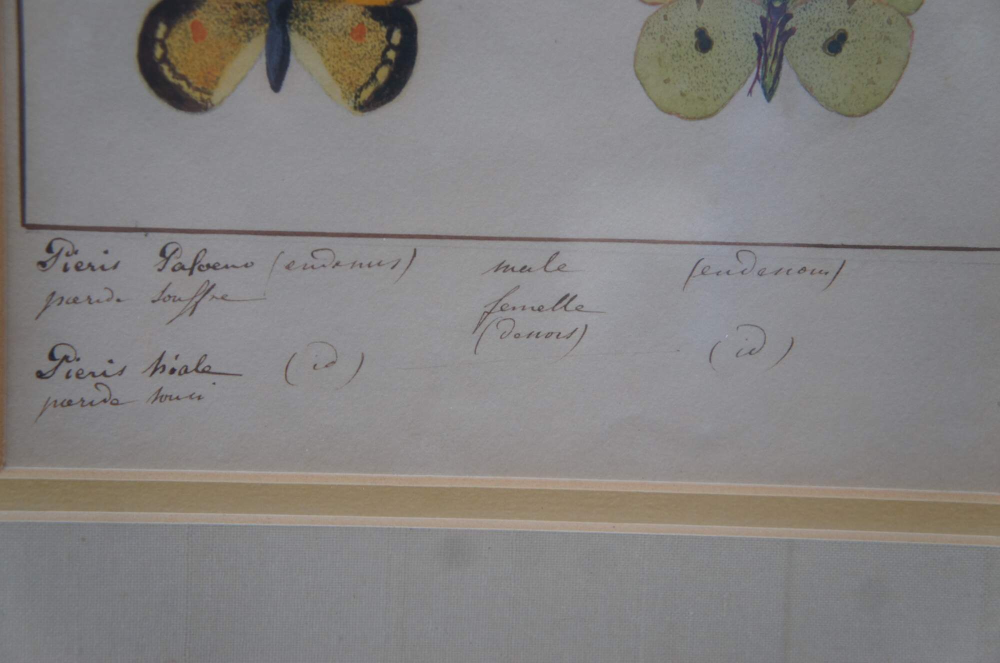 One hand-colored engraving is from Jacques Louis Engramelle's Papillons d'Europe. The work was published in Paris by Delaquette, Basan & Poignant between 1779 and 1792. The original hand-coloring and engraving were completed by Desfontainese, Juillet and others. Ernst is mentioned as the illustrator for the work, though most of the illustrations were after the work of Mara Eleon Hochecker. The engravings were printed on chain-linked, watermarked paper.