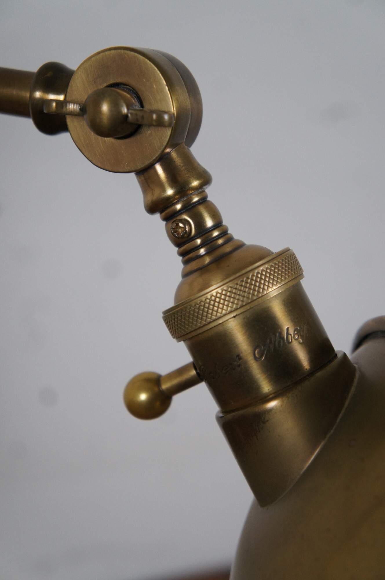 Robert Abbey Ant Bee articulated swing arm table / library desk pharmacy style lamp in antique brass finish. Circa 2003.