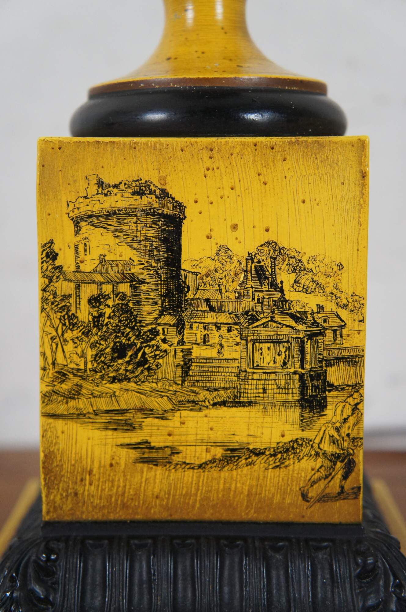 Vintage 20th century black and mustard yellow tole table lamp in the shape of a French Empire style urn on a pedestal, decorated with toile style Provincial scenes and landscapes, overlaid with an artistically aged finish. Plaque on front reads: Lampe a Moderateur par Brevet d’Invention et De Perfectionnement (Loosely translated: Moderator Lamp by Patent of Invention and Perfection). Includes white shade.