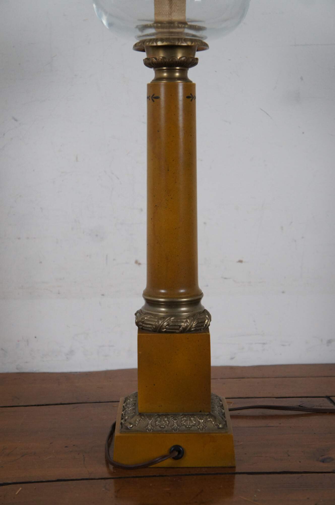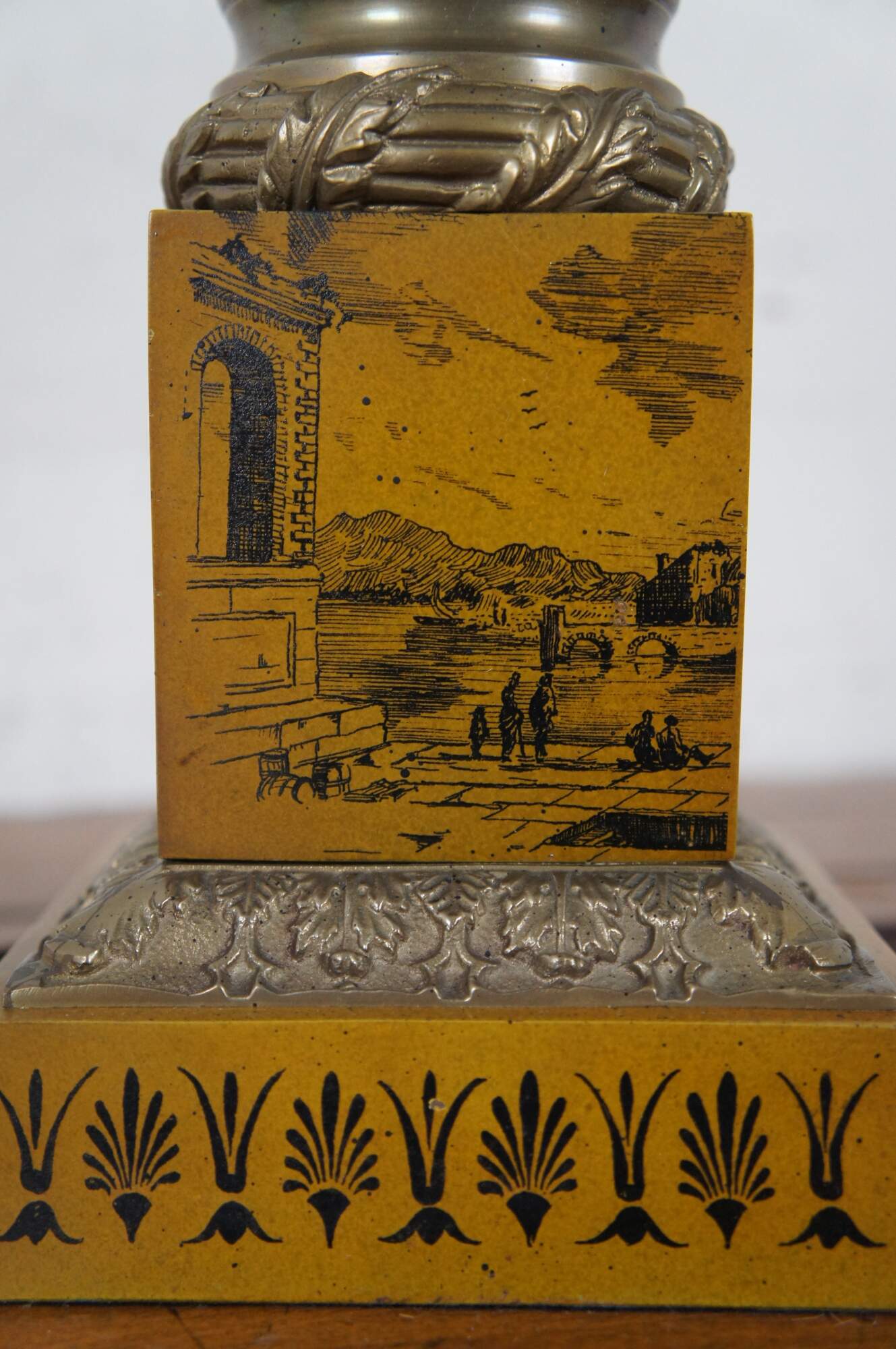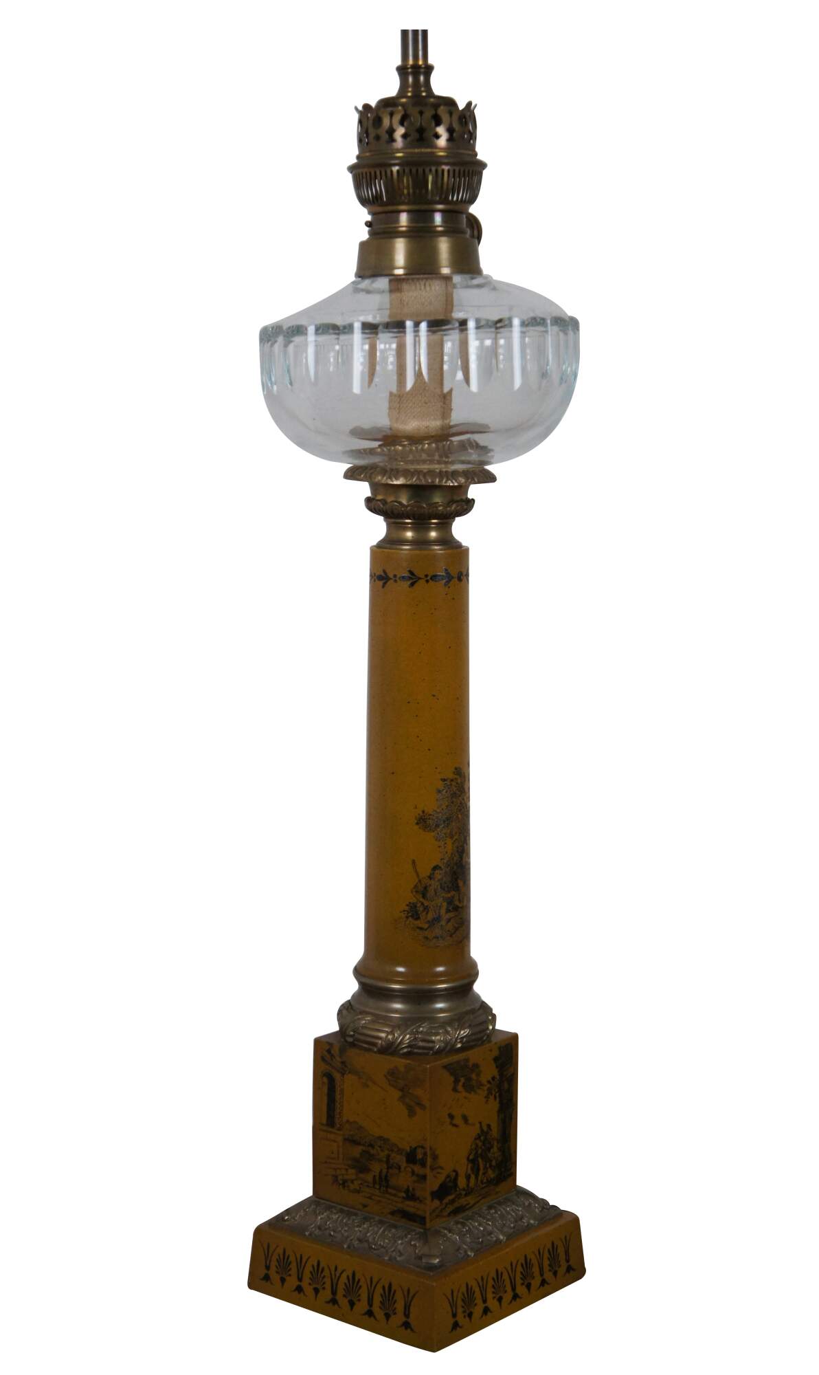 Vintage 20th century converted oil table lamp in the shape of a Italian Neoclassical tole column painted in mustard yellow with toile Provincial scenes / landscapes, trimmed in brass and topped with a clear glass reservoir below the two light sockets and acorn finial.