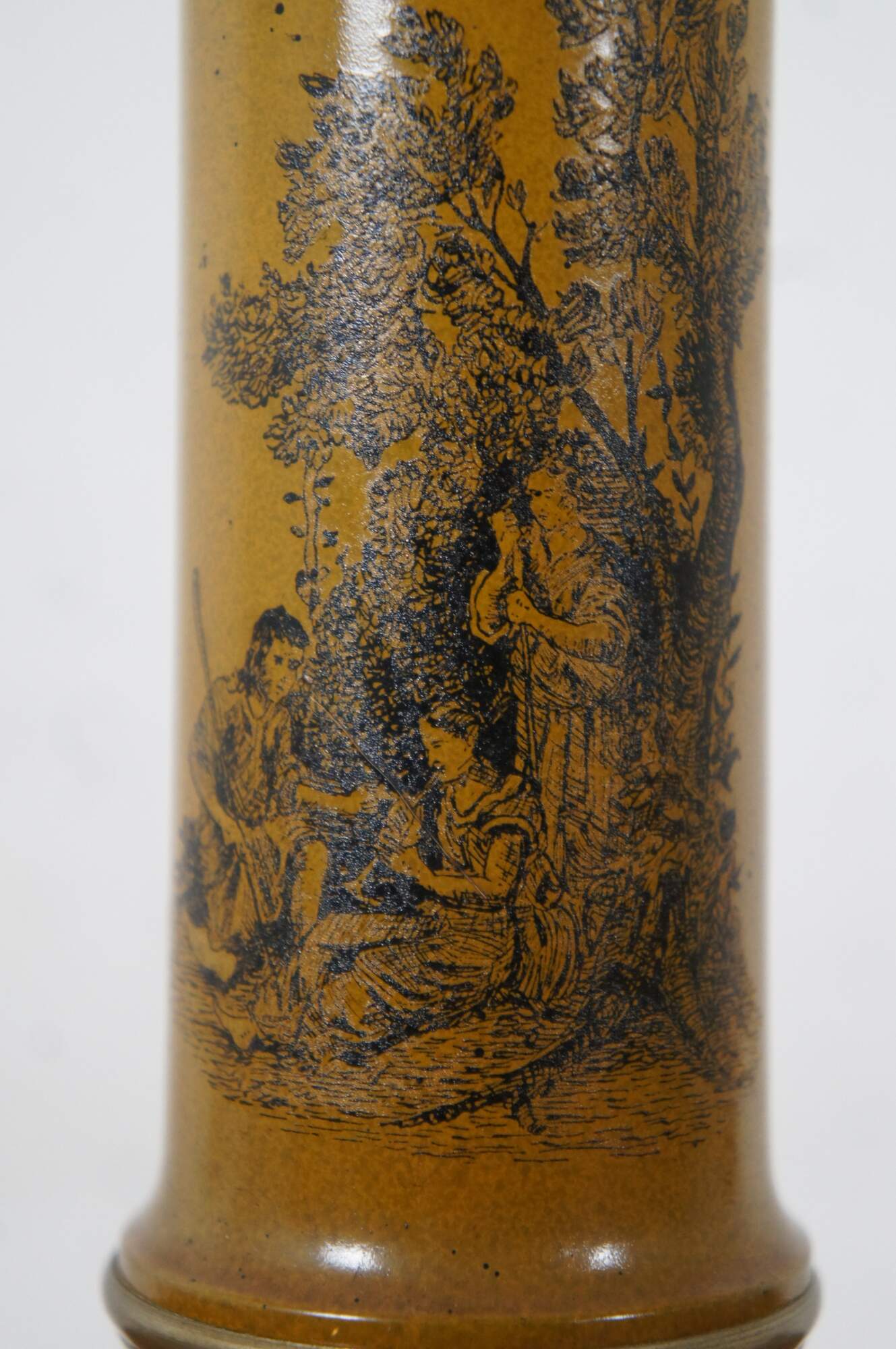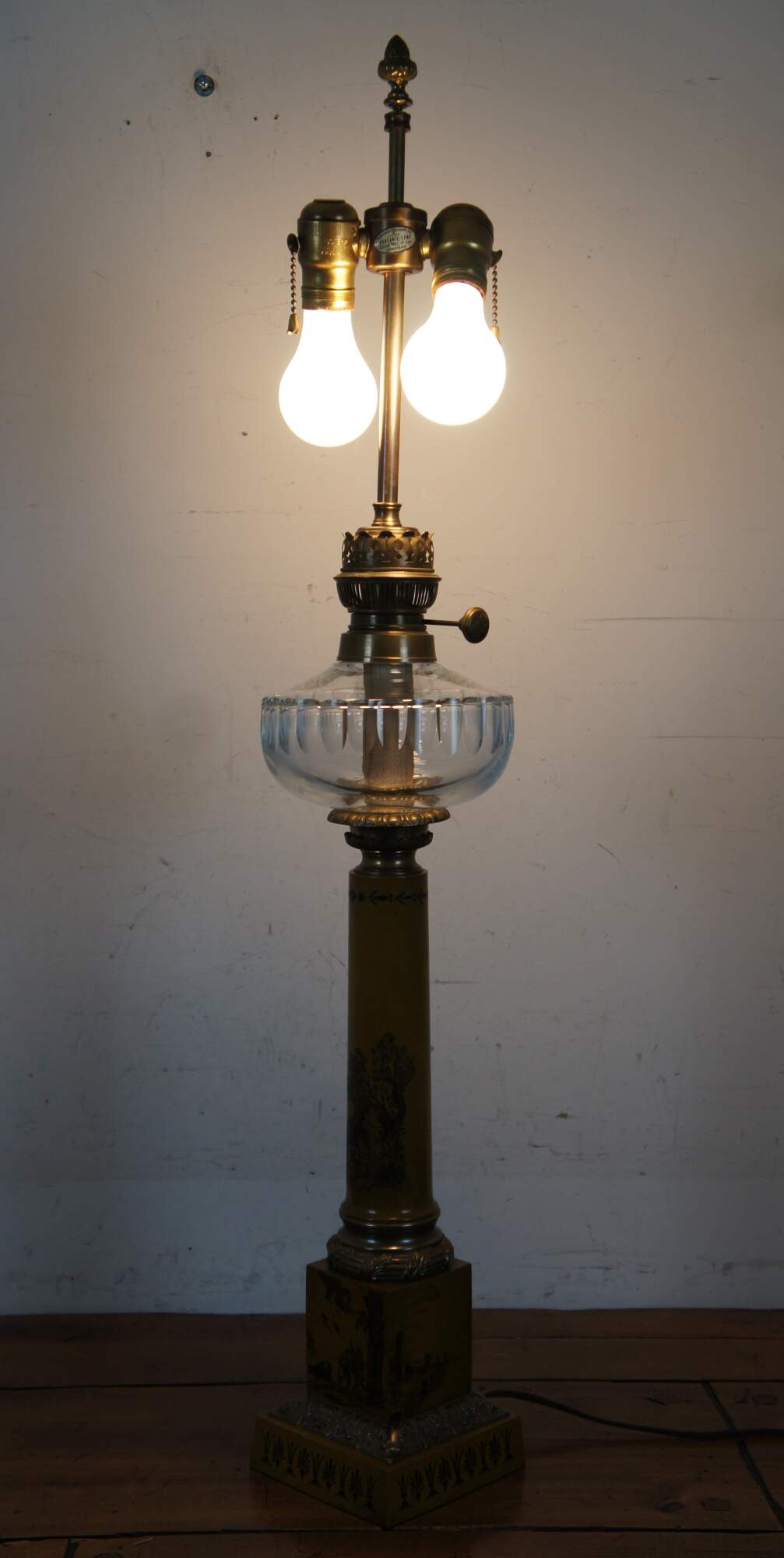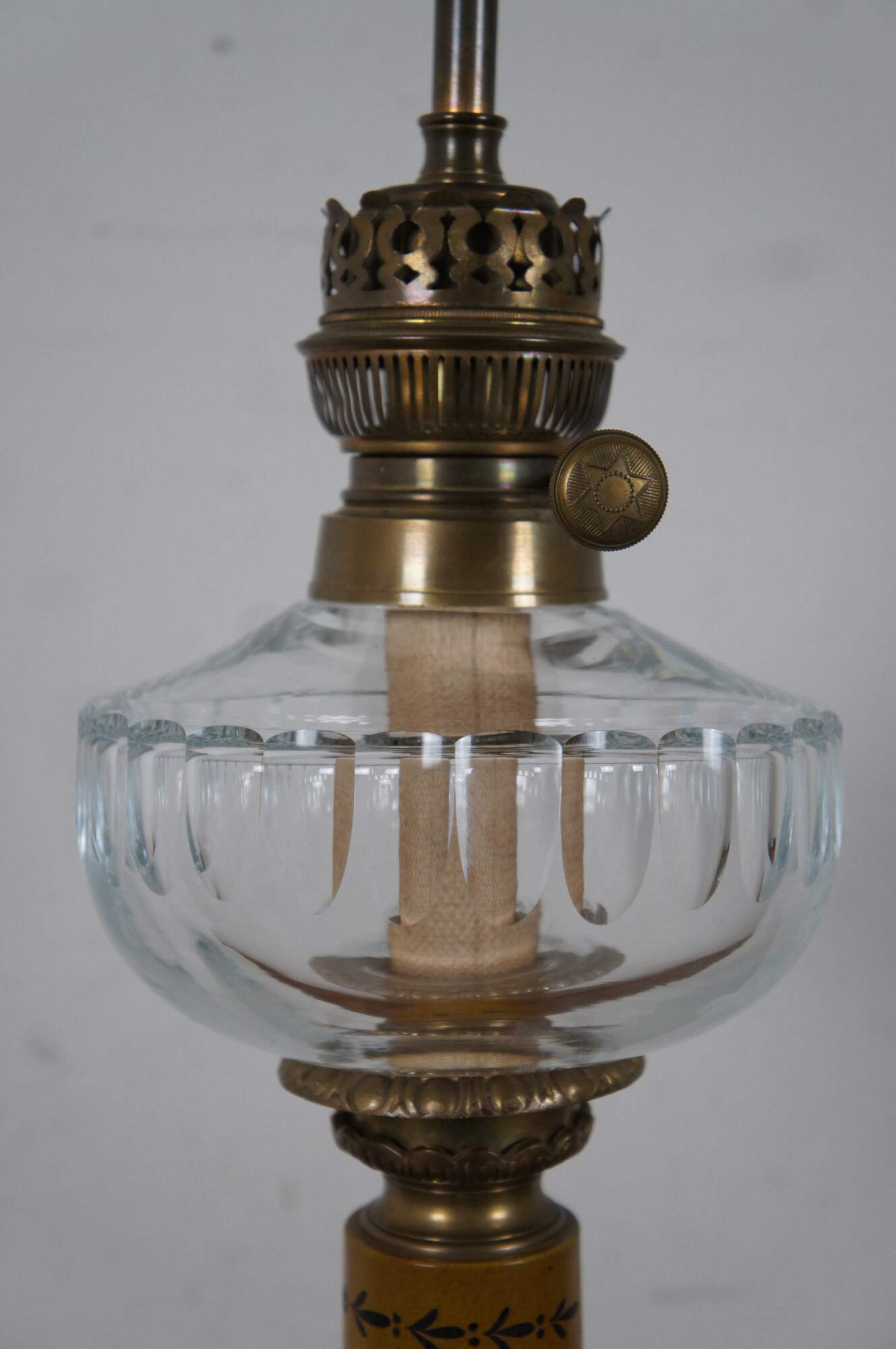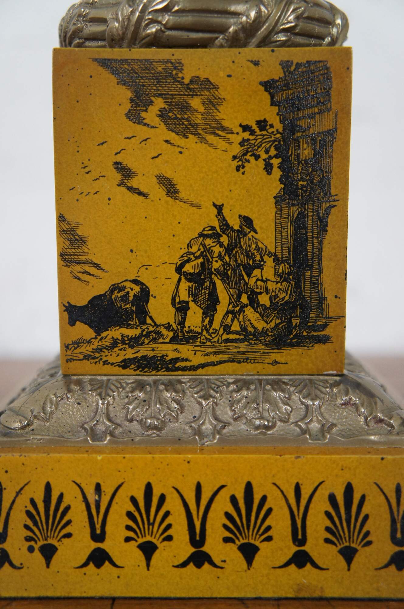 Vintage 20th century converted oil table lamp in the shape of a Italian Neoclassical tole column painted in mustard yellow with toile Provincial scenes / landscapes, trimmed in brass and topped with a clear glass reservoir below the two light sockets and acorn finial.