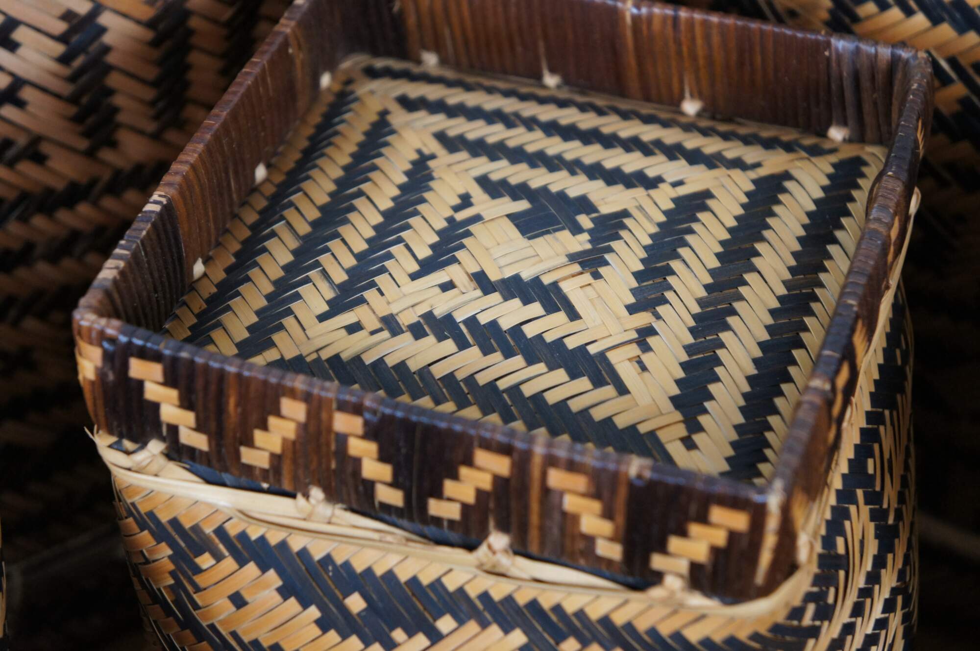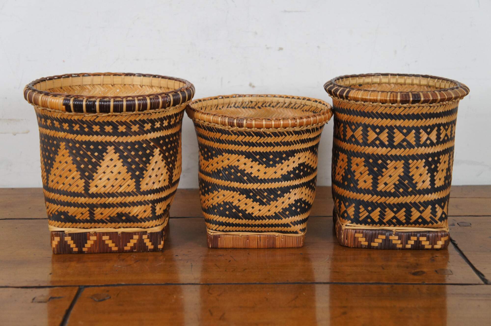 Set of five hand woven two tone, geometric, South American folk art baskets in a variety of sizes for a variety of potential uses from harvest / storage to cachepot / planter. One specifically marked Made in Brazil.