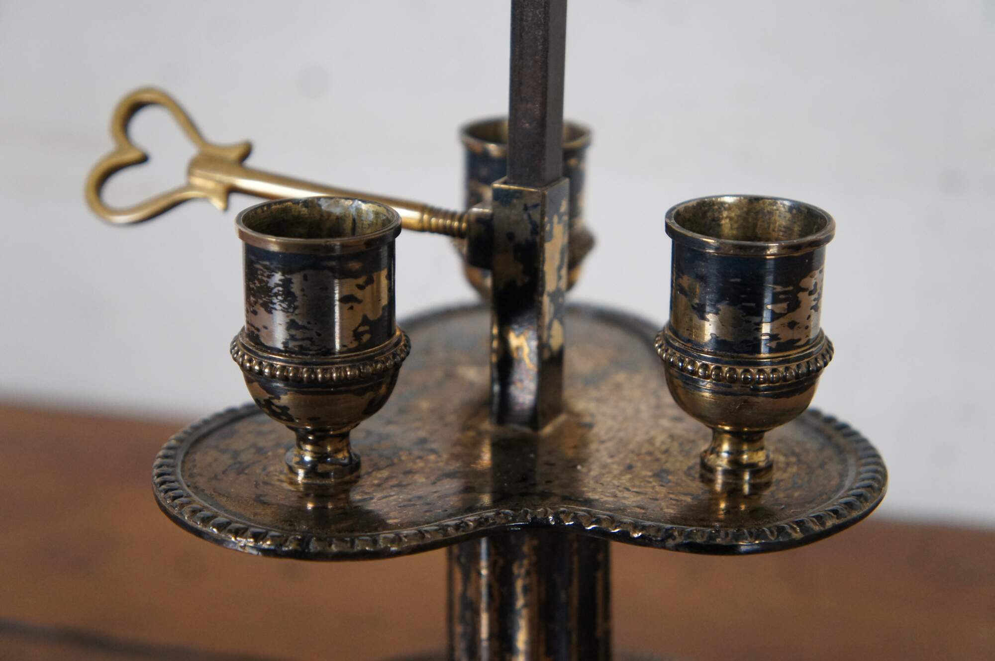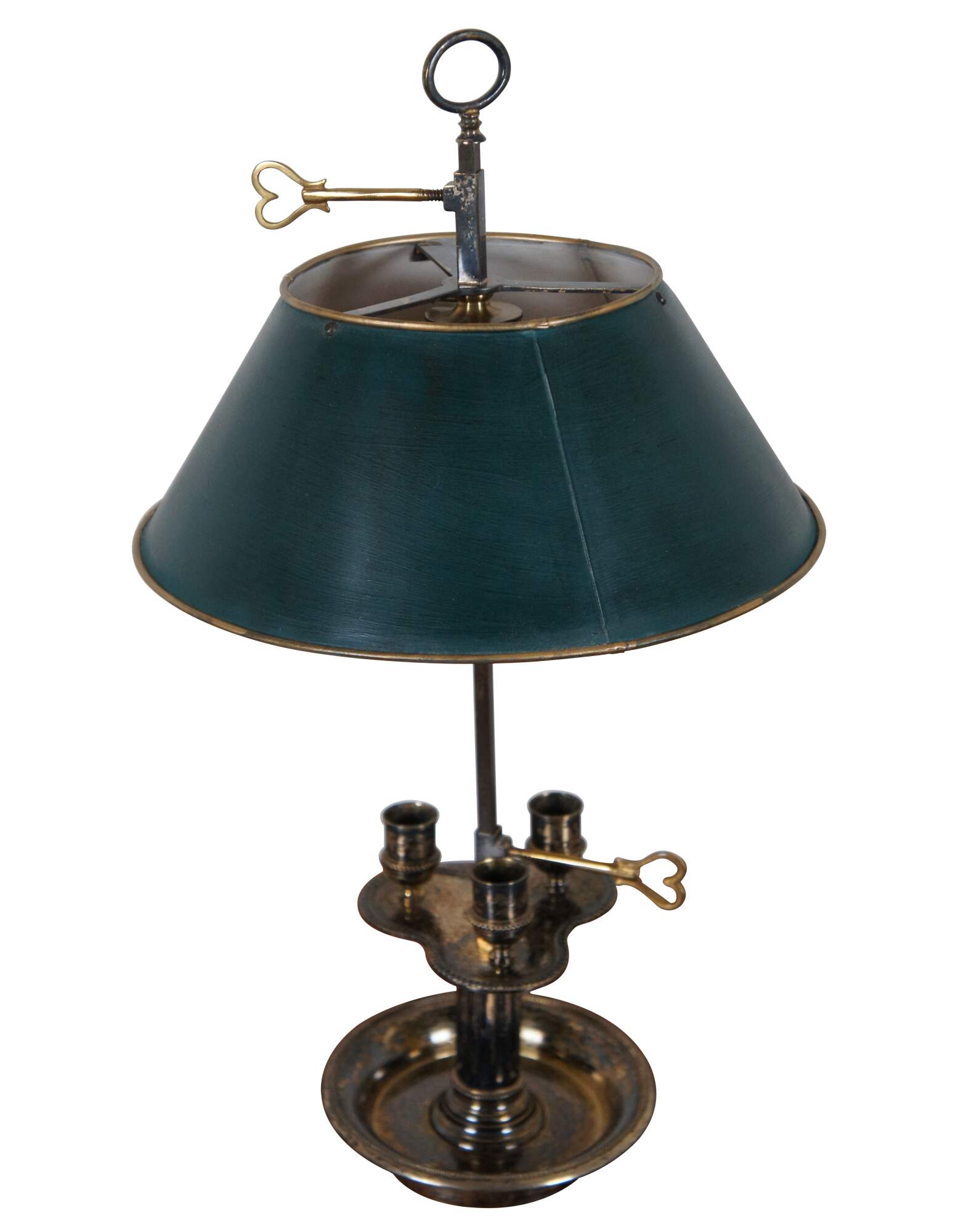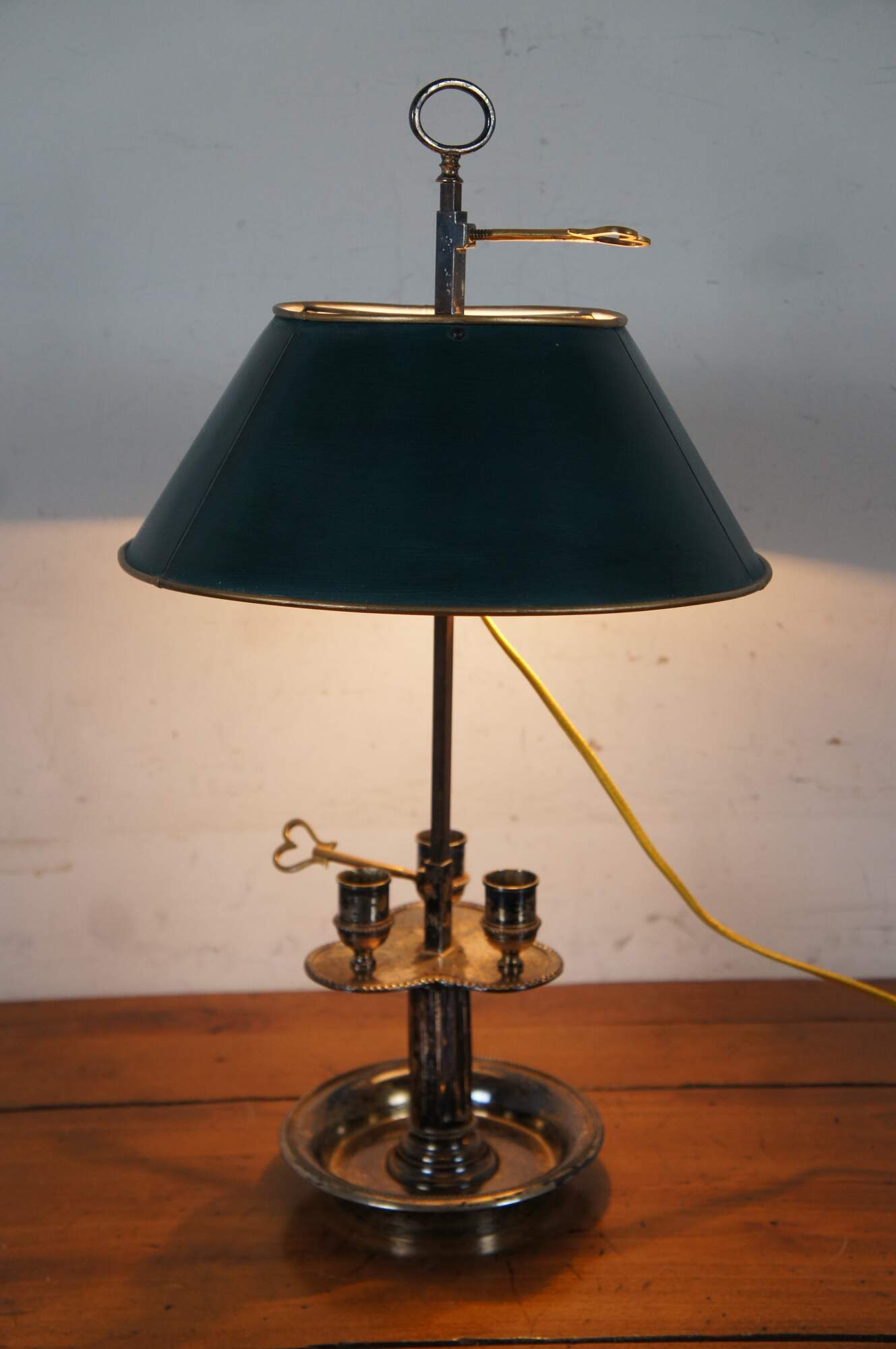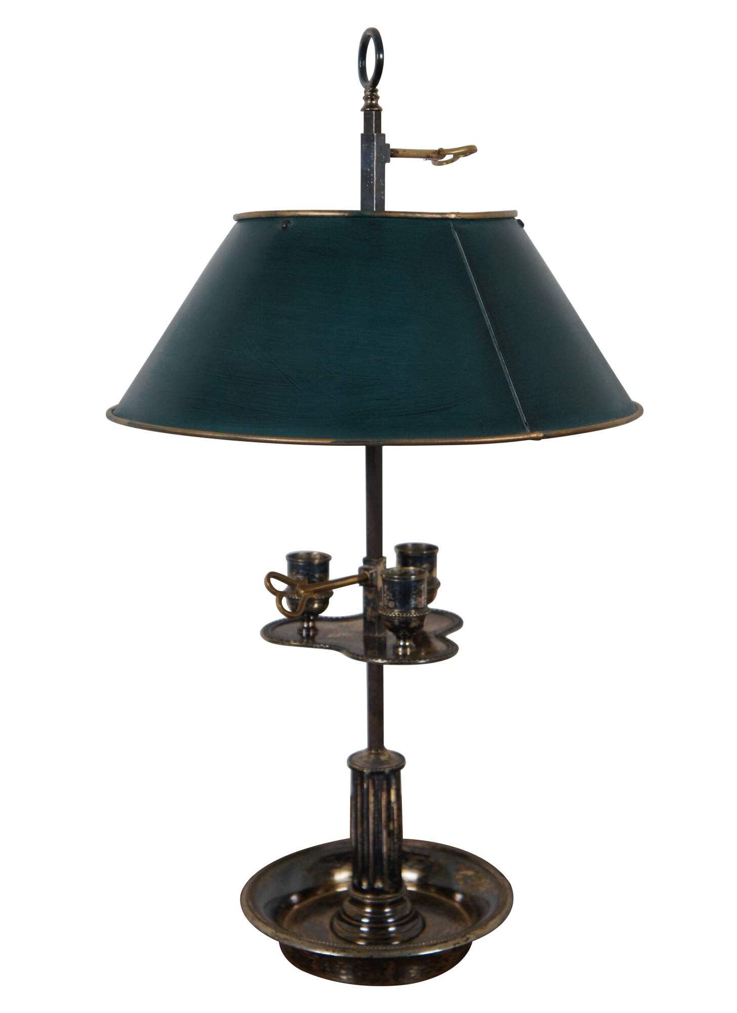 Antique French Neoclassical Bouillotte / Directoire / Hot Water Bottle silver plate three light table lamp, featuring a fluted column with round dish base supporting a three candle tray (height adjustable), with ring finial and heart shaped screw keys and a green and gold painted tole shade.