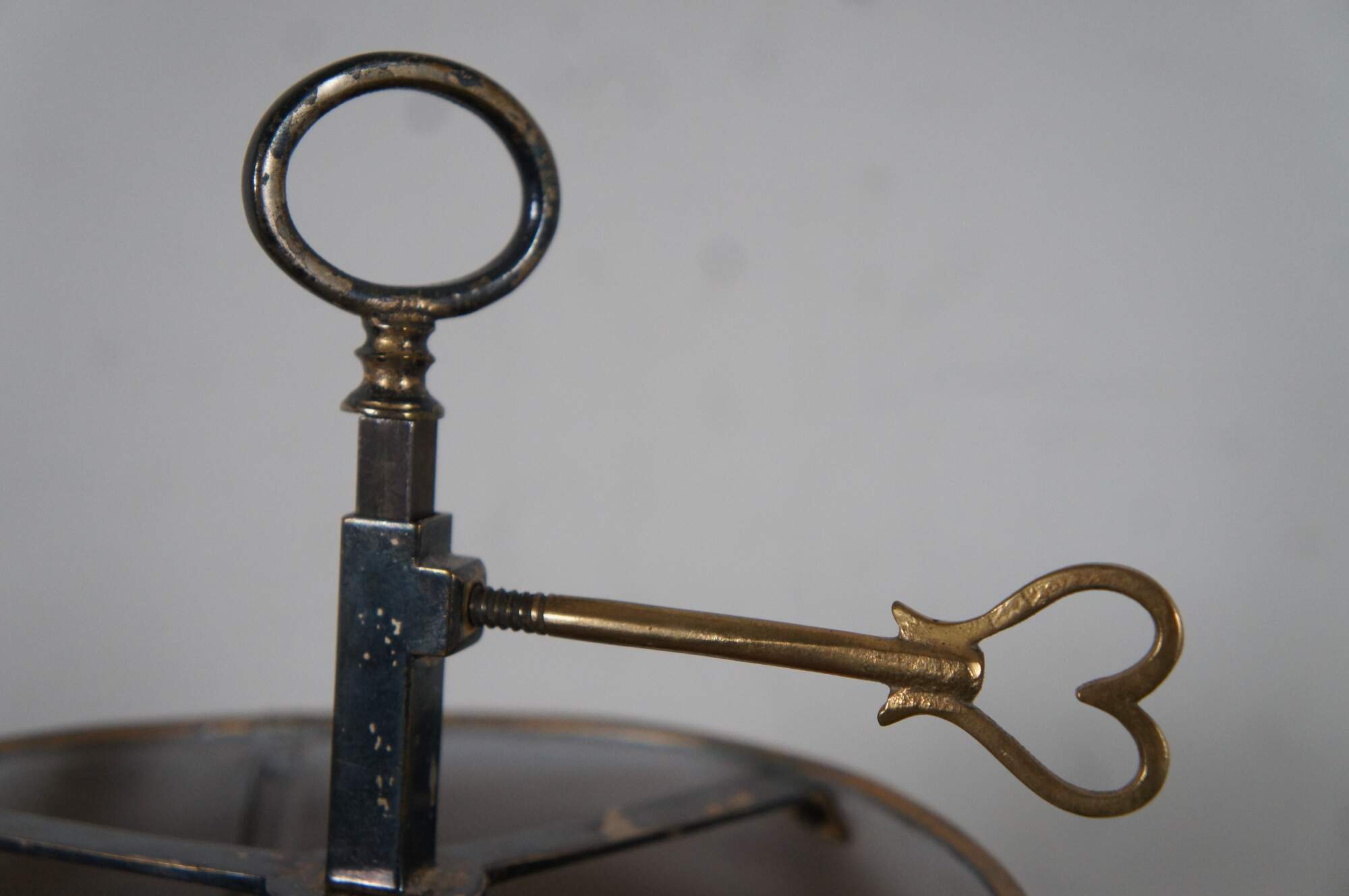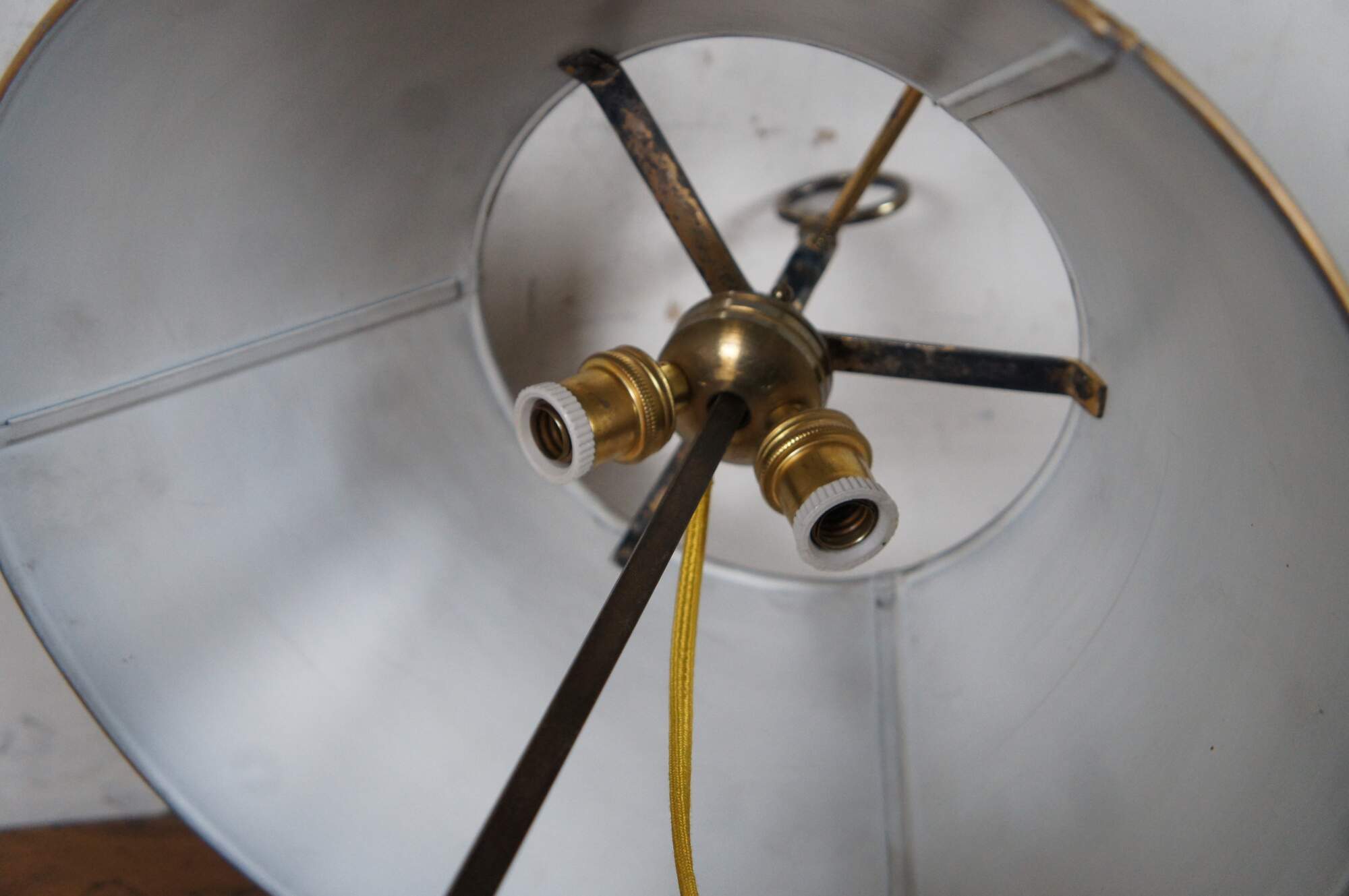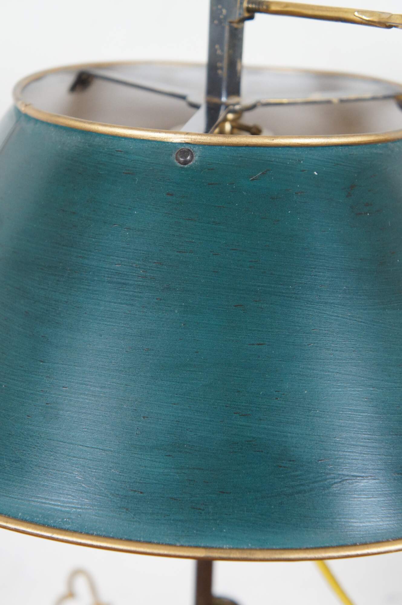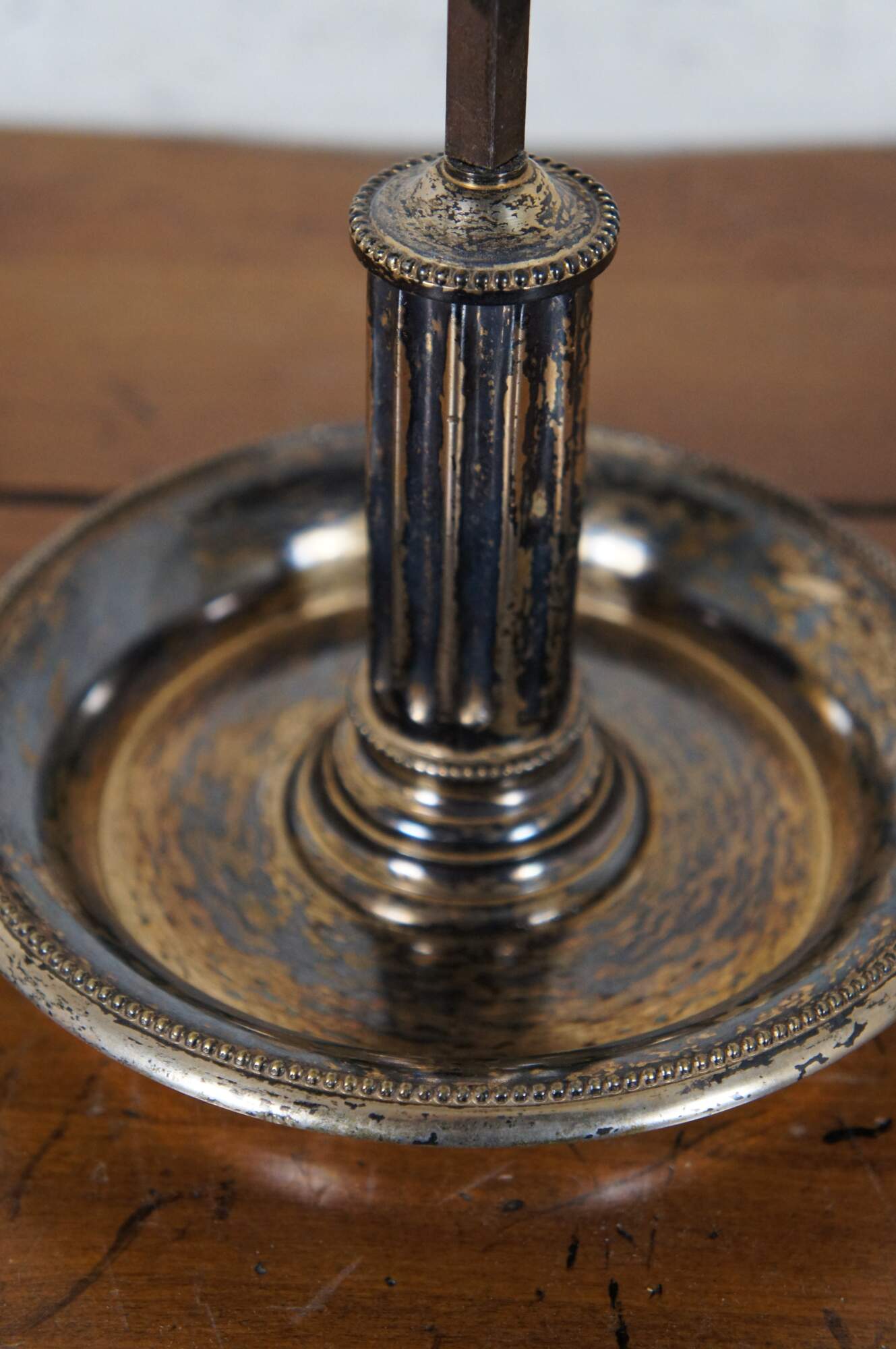 Antique French Neoclassical Bouillotte / Directoire / Hot Water Bottle silver plate three light table lamp, featuring a fluted column with round dish base supporting a three candle tray (height adjustable), with ring finial and heart shaped screw keys and a green and gold painted tole shade.