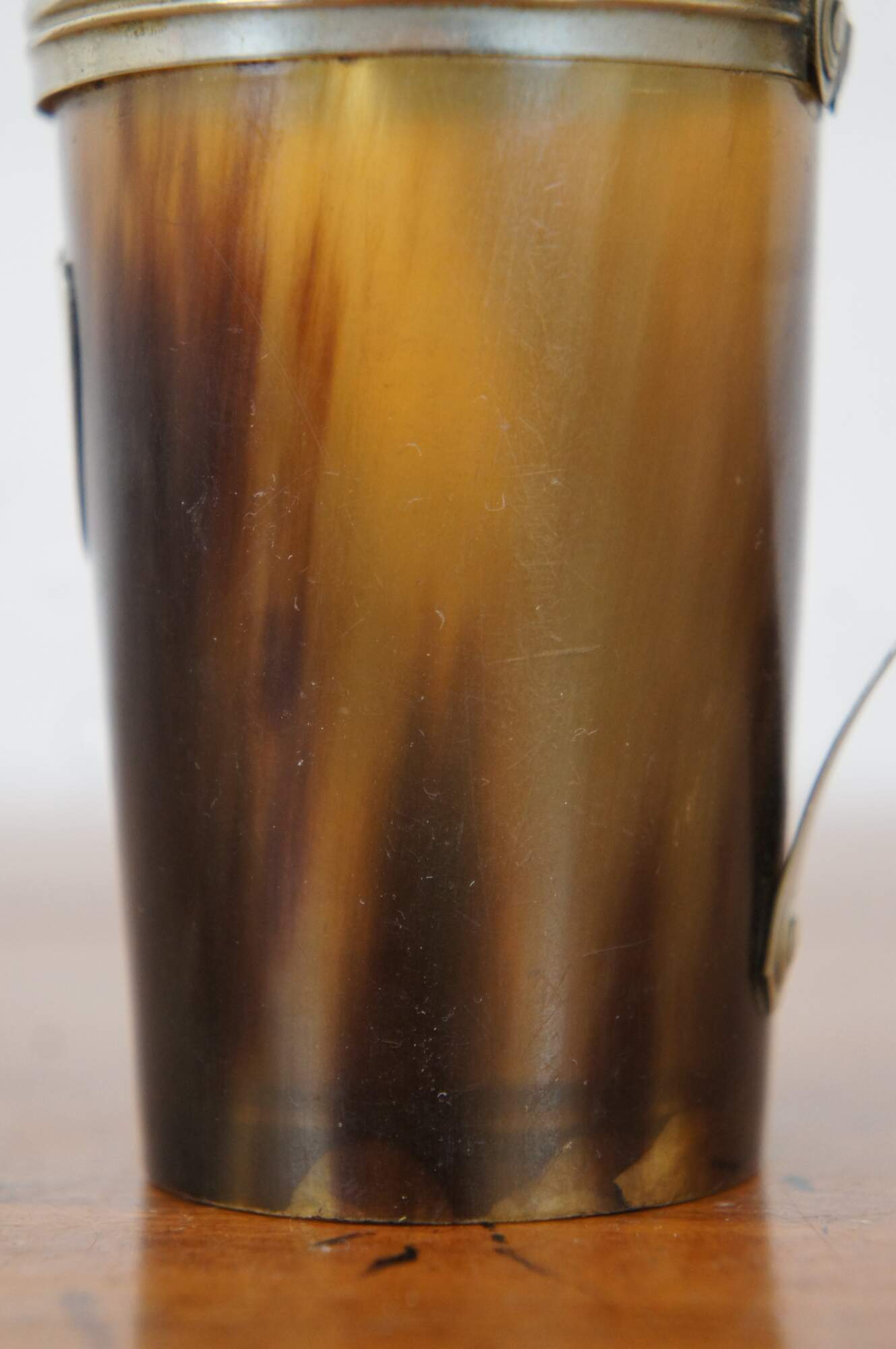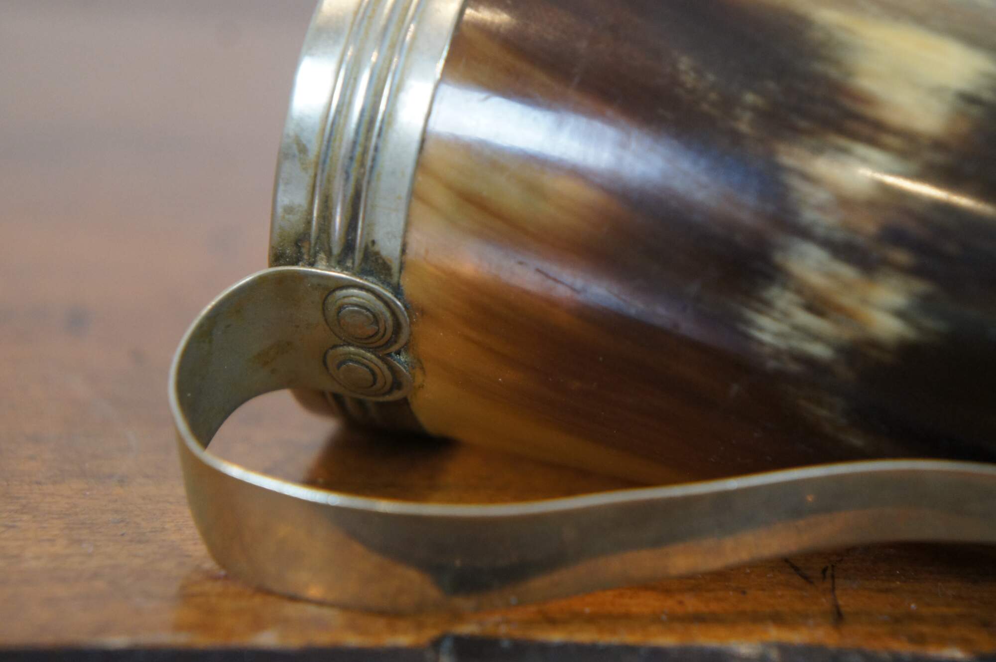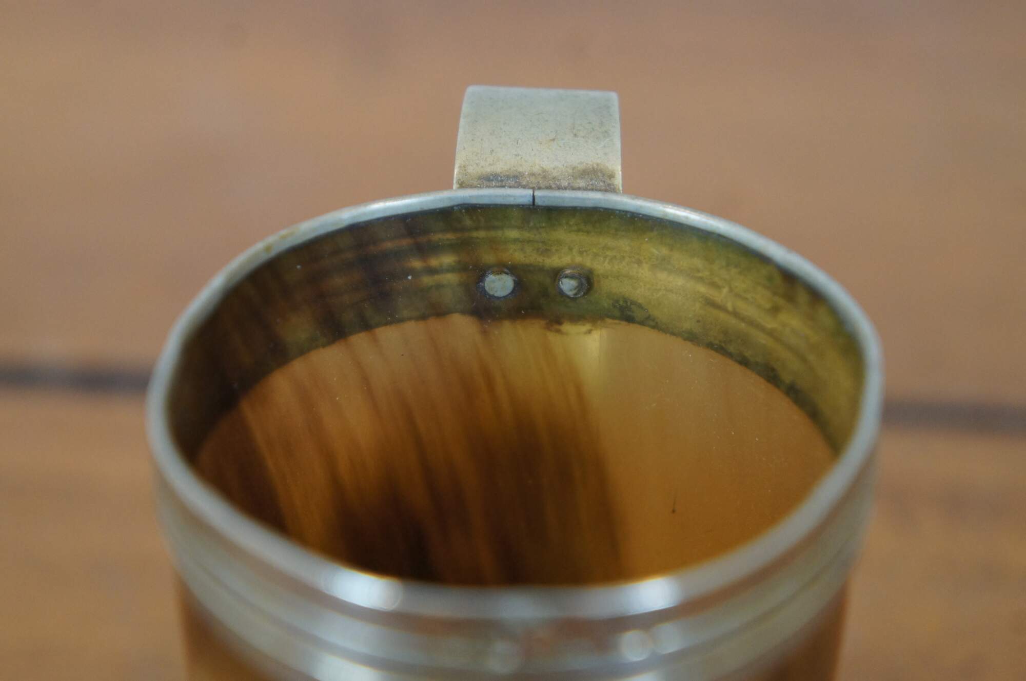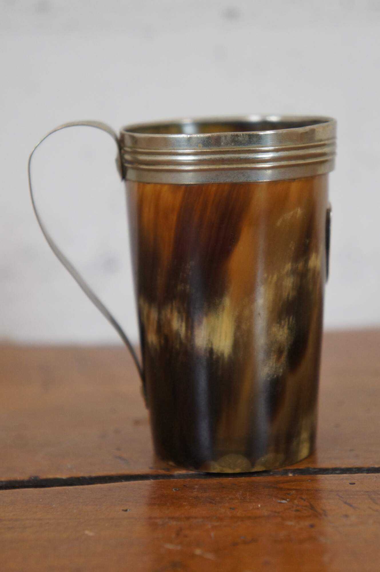 Antique 19th century English Victorian mounted bovine cow horn beaker / goblet / handled cup with grooved sterling silver rim and heraldic shield accent.