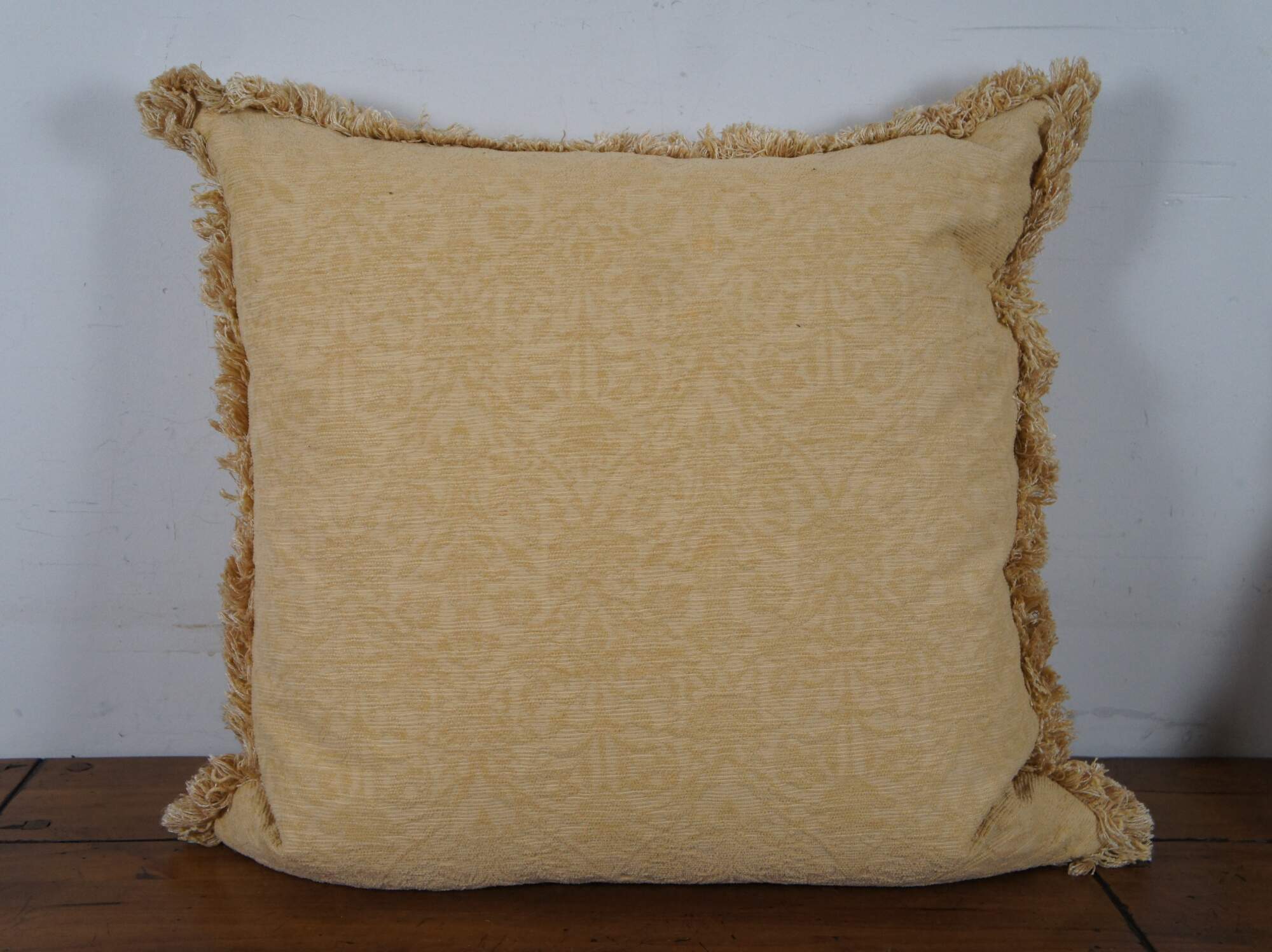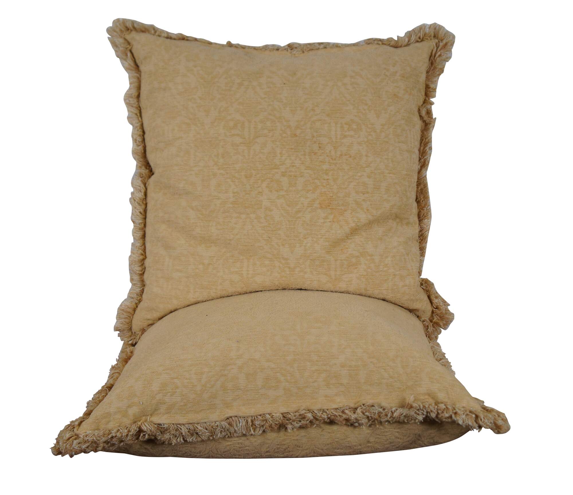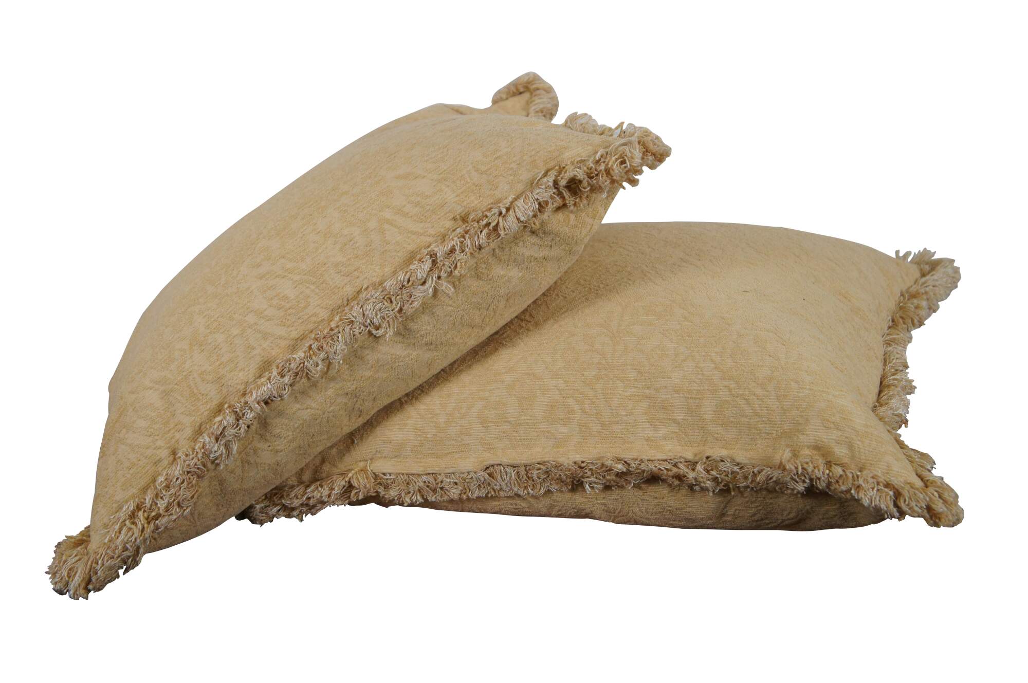Pair of vintage down filled throw pillows covered in yellow brocade with fringe.