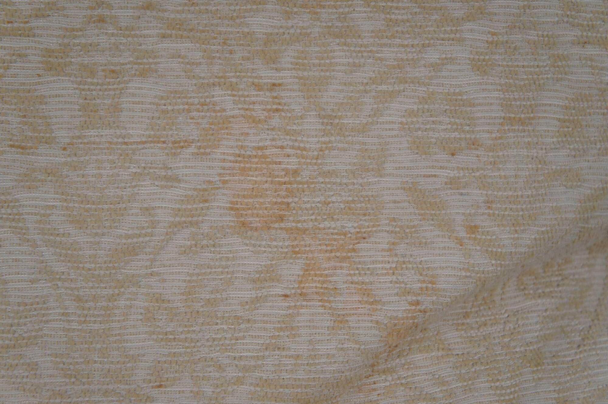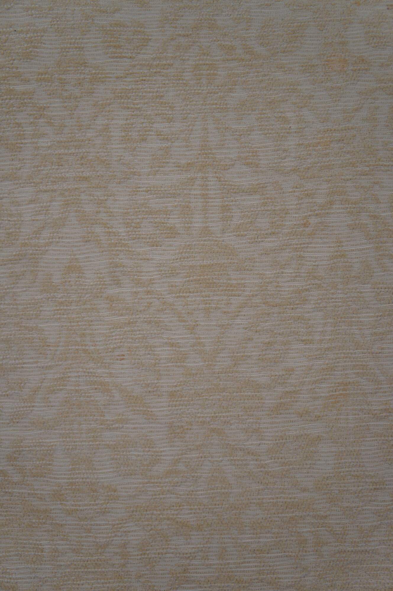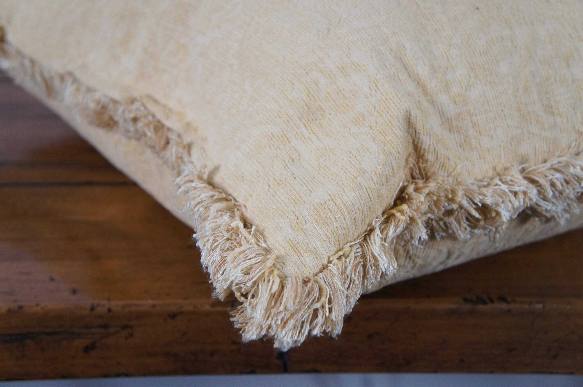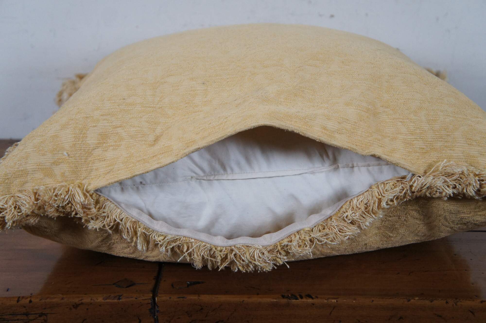 Pair of vintage down filled throw pillows covered in yellow brocade with fringe.