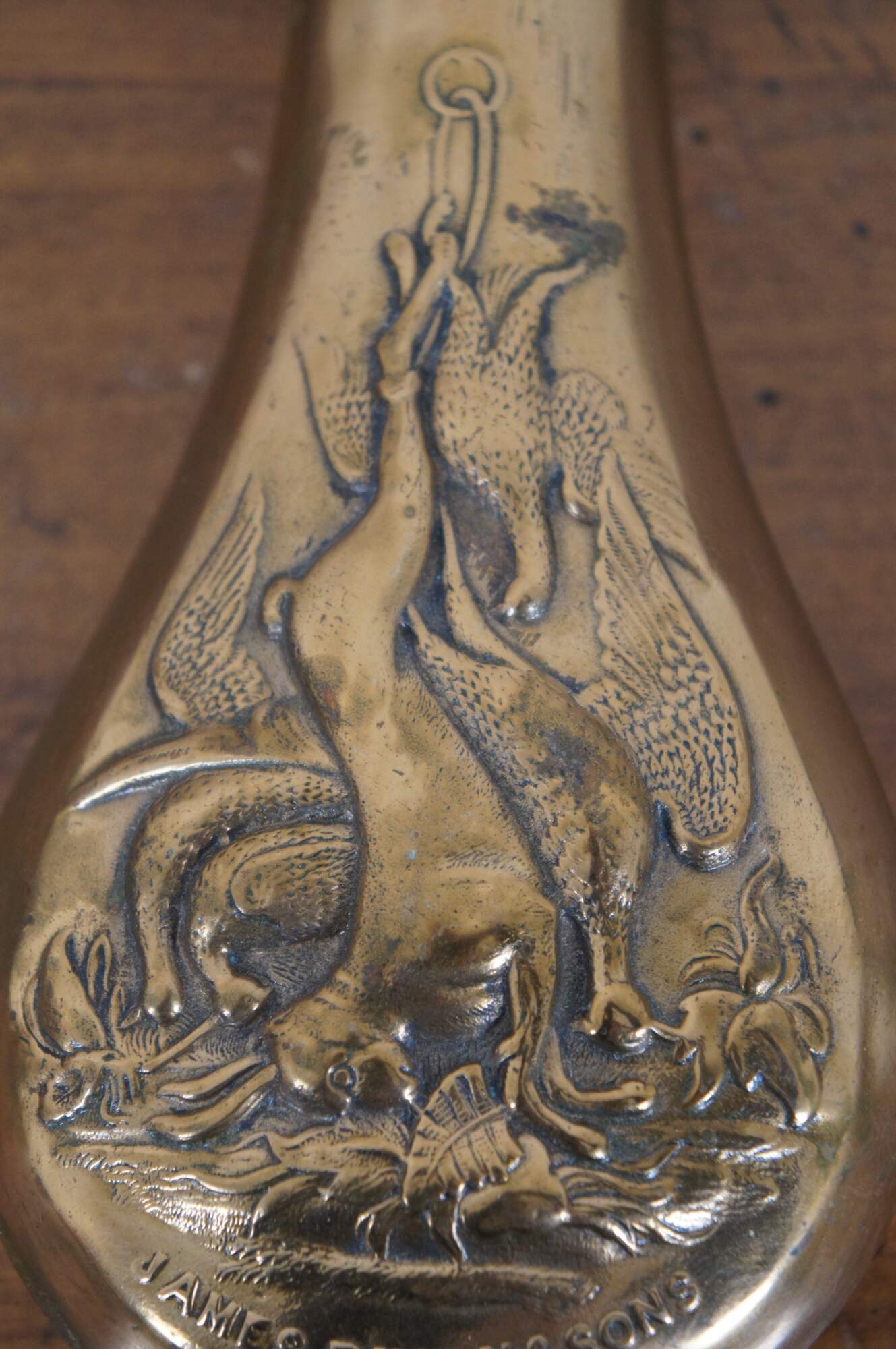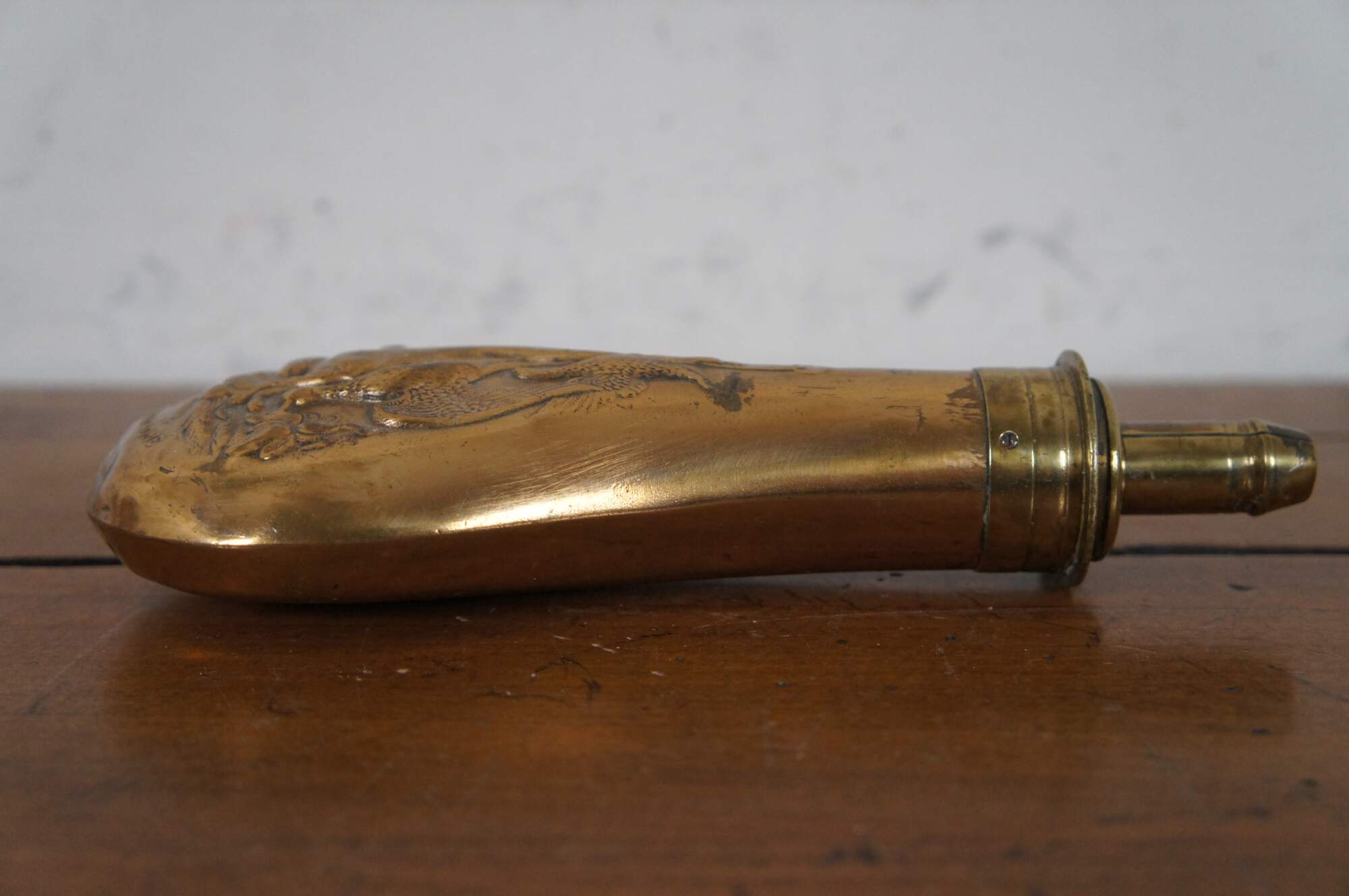 Antique English circa 1850’s copper and brass powder flask horn by James Dixon & Sons, featuring a molded motif of hanging game (rabbin / pheasant / duck / birds) and an adjustable dram measure at the top indicating 2, 2 ¼ and 2 ½ drams.