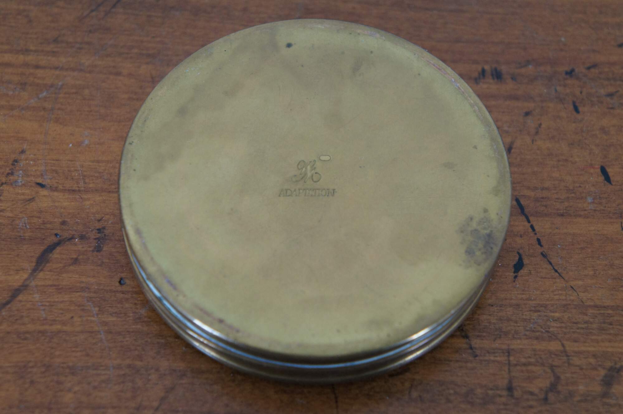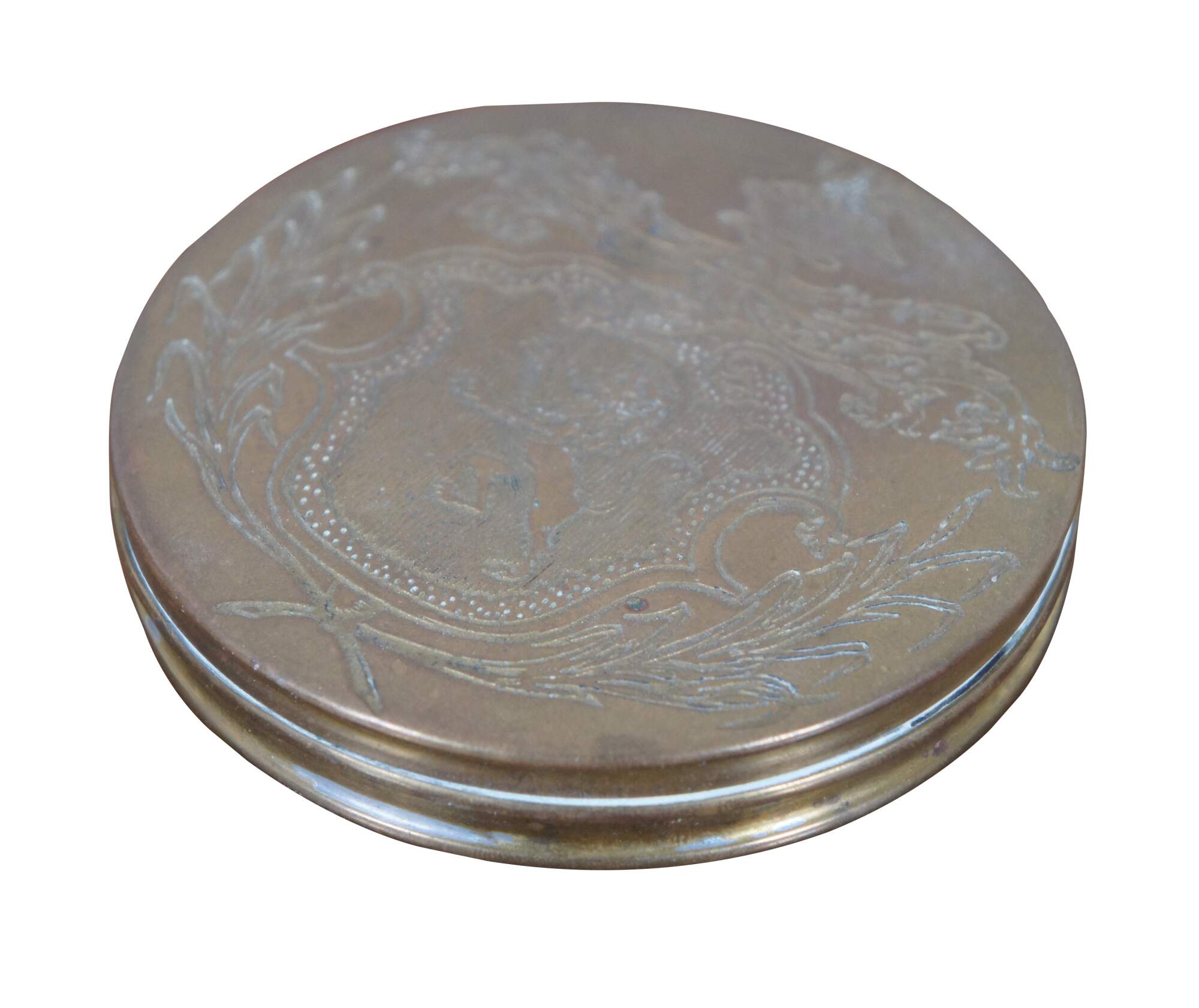 Vintage reproduction brass snuff / trinket / pill box engraved with a coat of arms featuring a lion passant rearing on a shield or crest, surrounded by wheat sheaves, foliate leaves, and a swan on a nest; marked WM Adaptation.