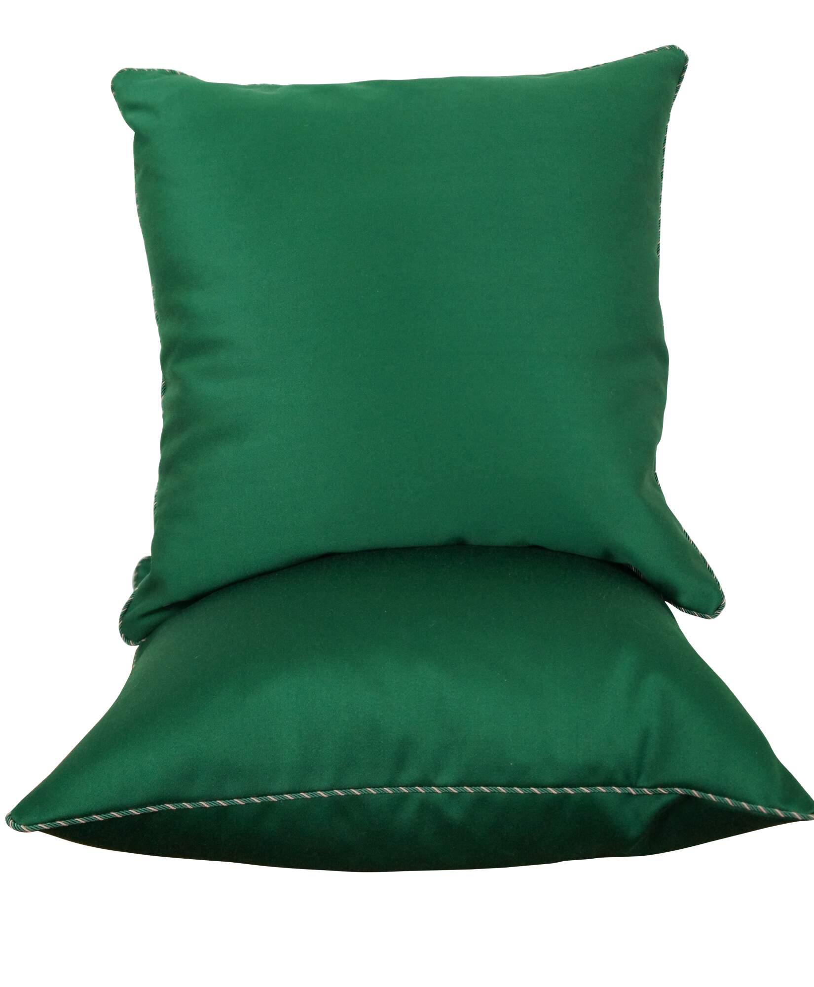 Pair of vintage emerald green silk, down filled throw pillows with green and gold French welting / piping around the edge.