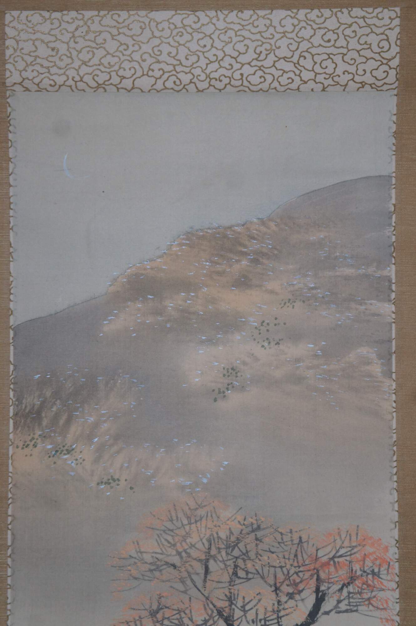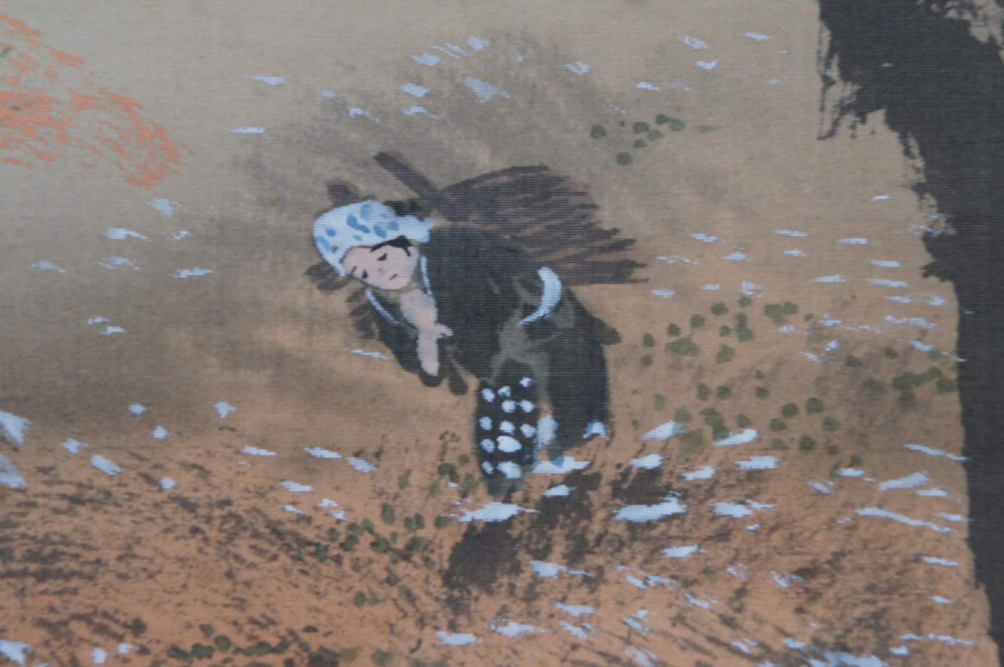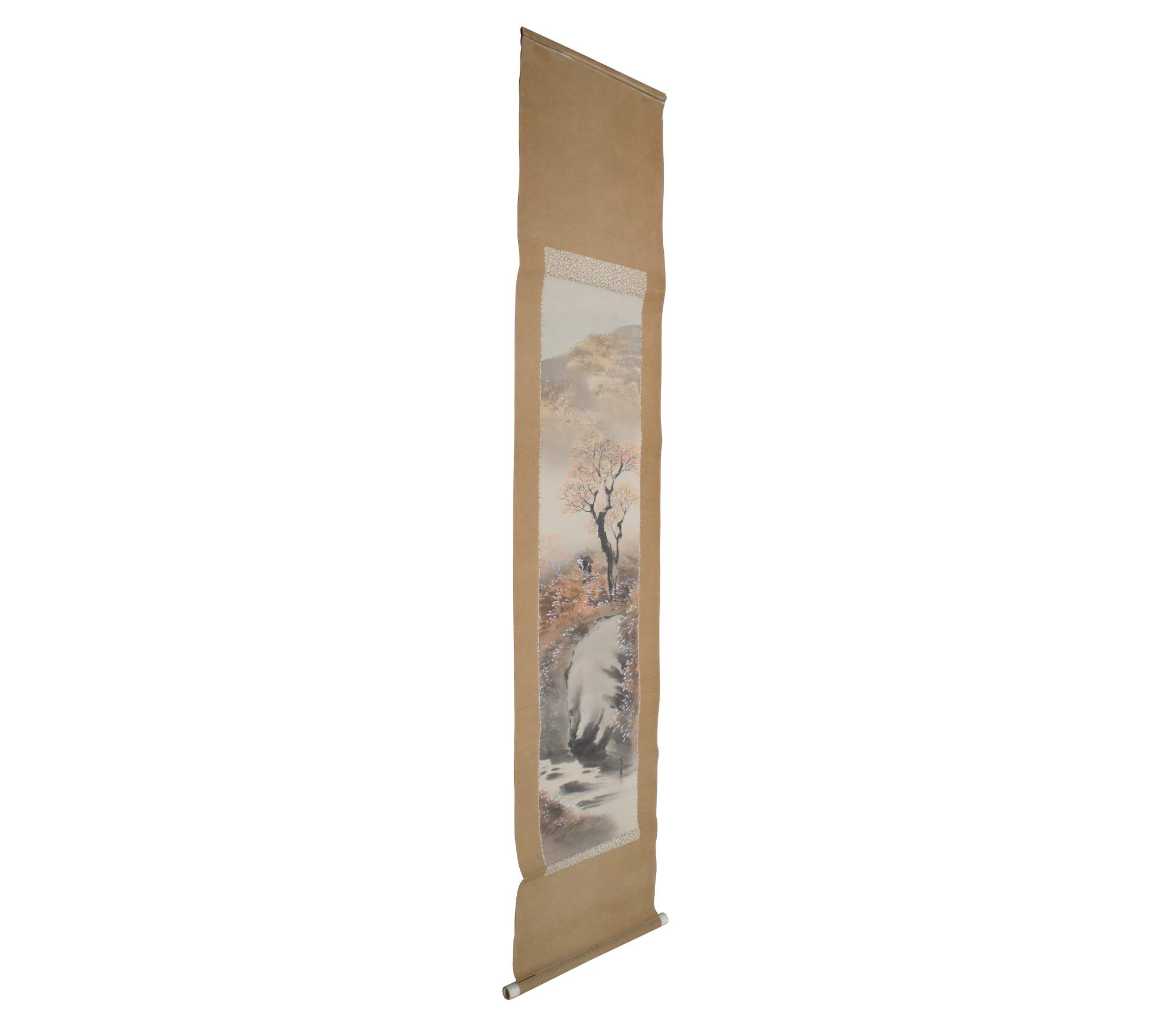 Signed antique Asian watercolor on silk landscape painting showing a small waterfall over a creek, topped with a tree and a woman carrying a bundle of wood with a mountain in the background. Mounted on a beige wall hanging scroll.
