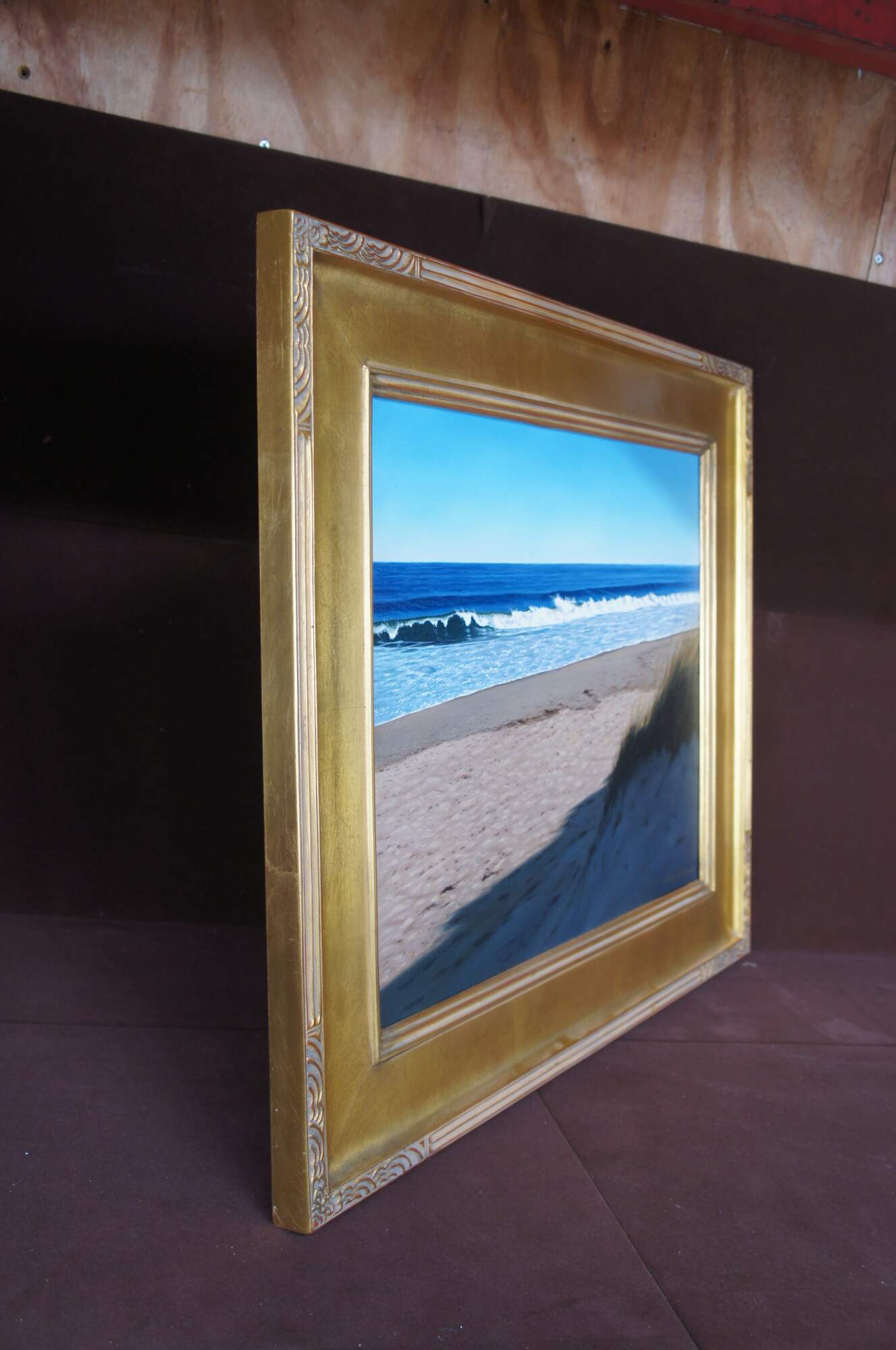 Vintage Michael McGovern ""Shorebreak"" seascape oil painting on canvas featuring Nantuckets Shorebreak beach, dunes and crashing waves. Circa 2000.
