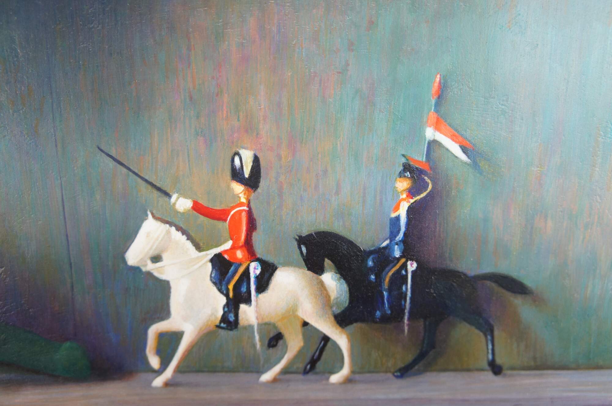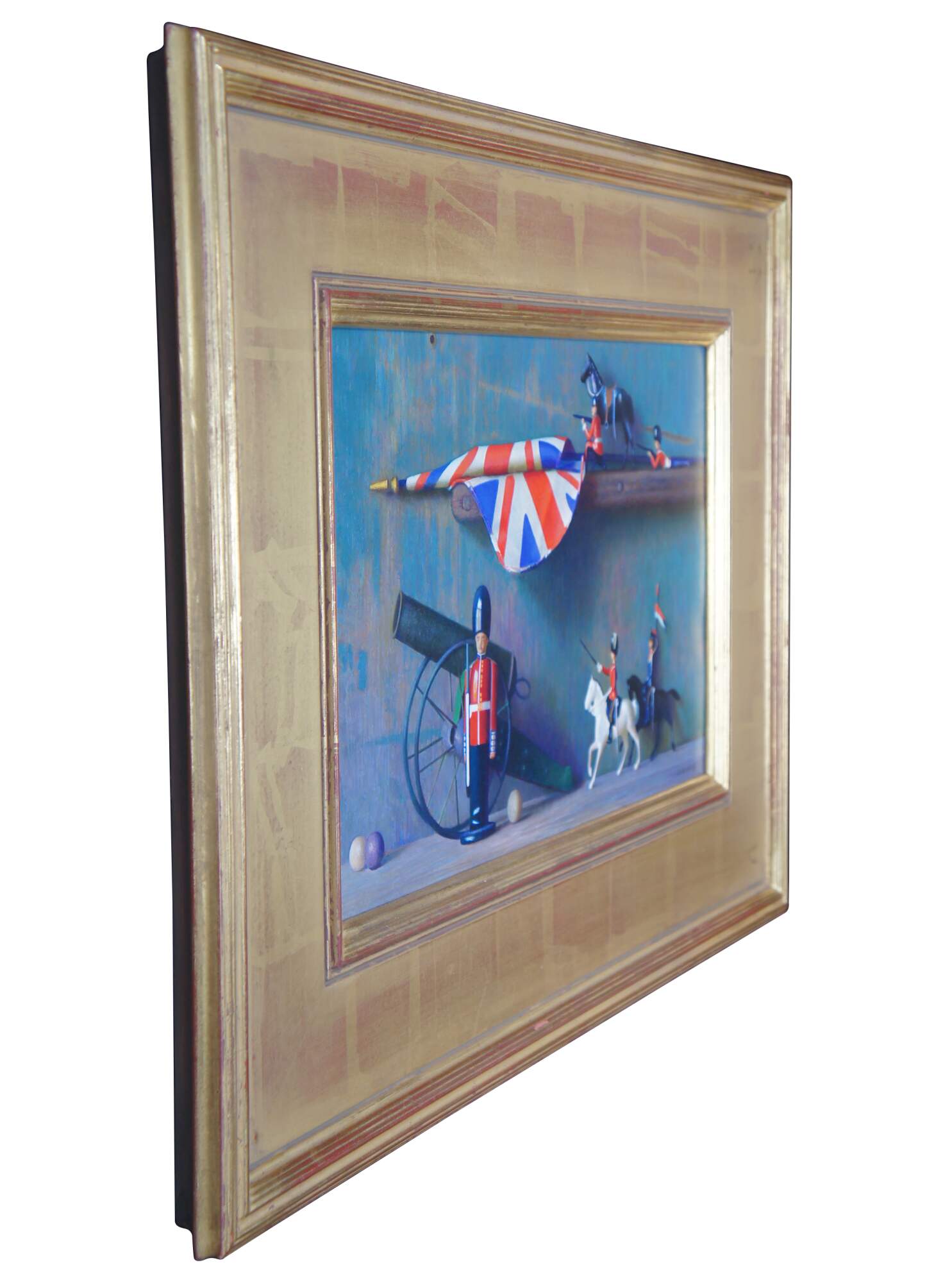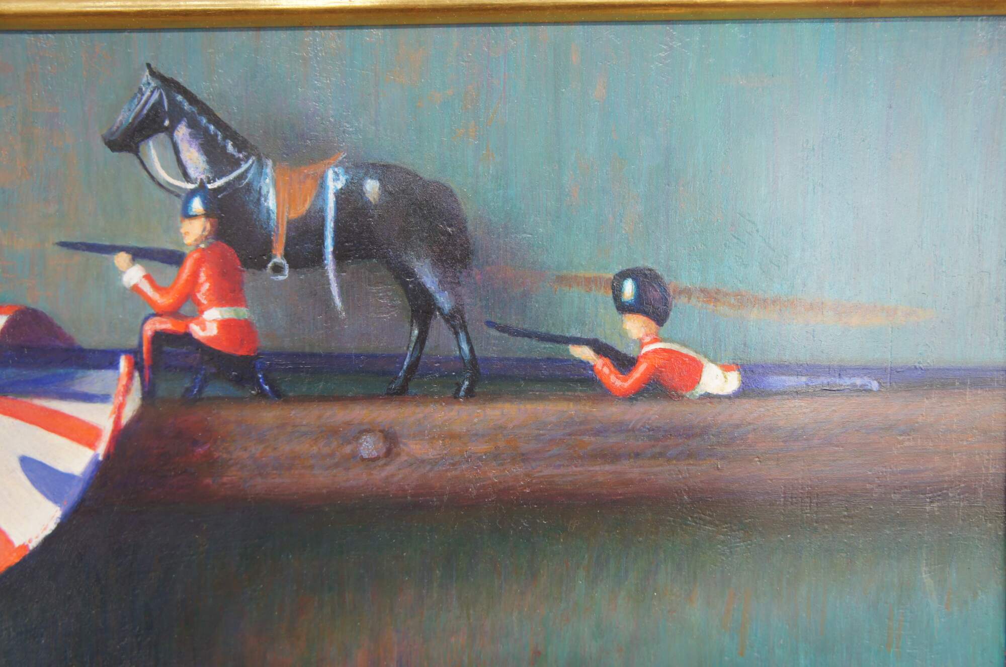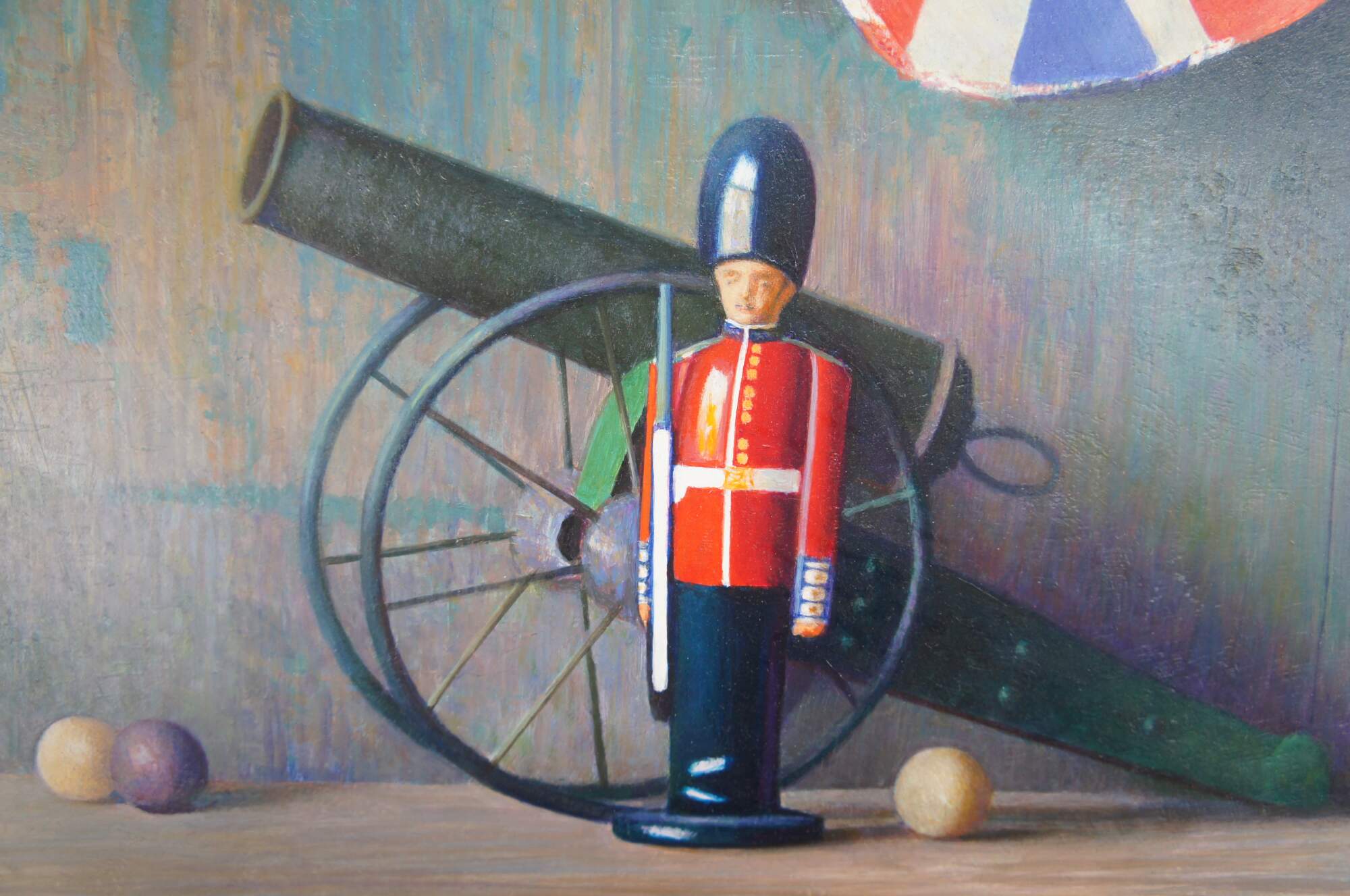 Vintage Sidney Willis (aka Sid, b.1930), still life oil painting featuring a toy solider scene or theme with British flag, horses / equestrian riders, gunmen, a cannon and nutcracker soldier. Purchased Robert William Galleries, Nantucket circa 2000.