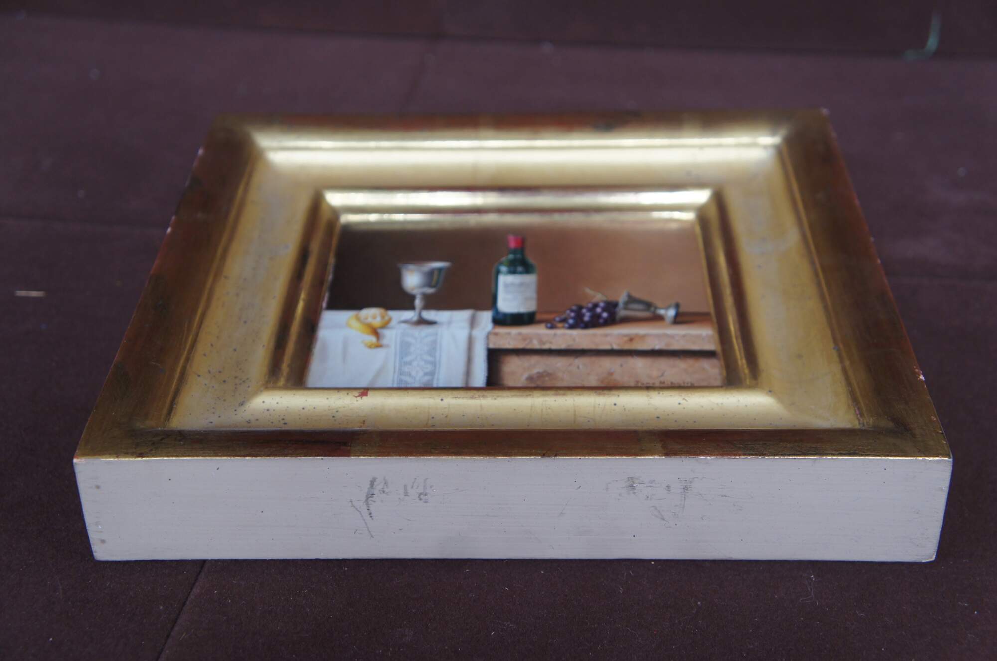 Vintage oil on board still life painting titled “French Bordeaux"" by Jane Mihalik, featuring a bottle of 1962 Grand Cru Saint Emilion Bordeaux, Chateau Haut-Veyrac wine. Next to it lays a compote with grapes, a silver goblet and half peeled lemon atop a crochet table cloth. Circa 2000.
