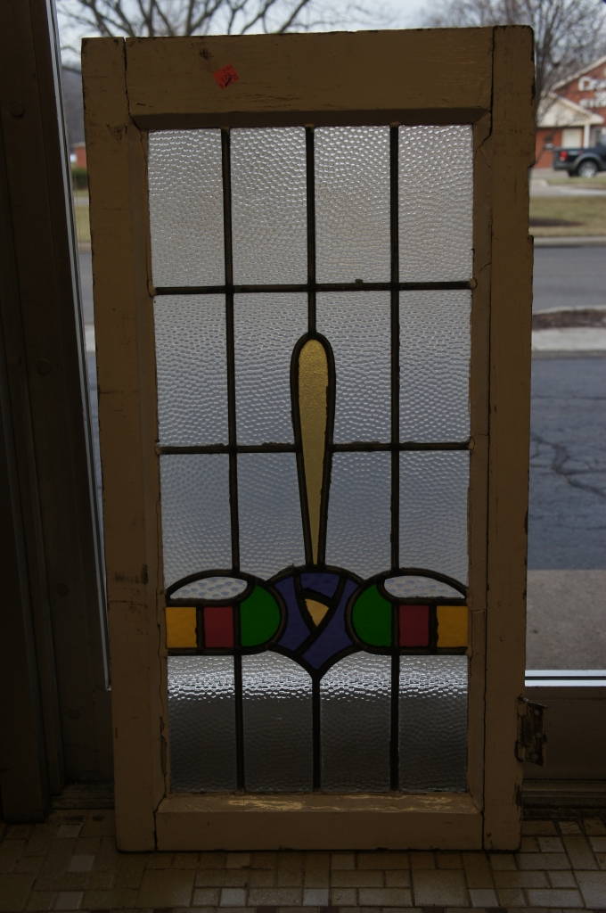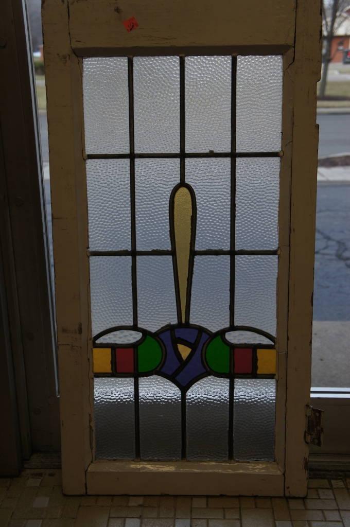Here is a colorful stained glass panel. A leaded criss-cross pattern with a colorful design.