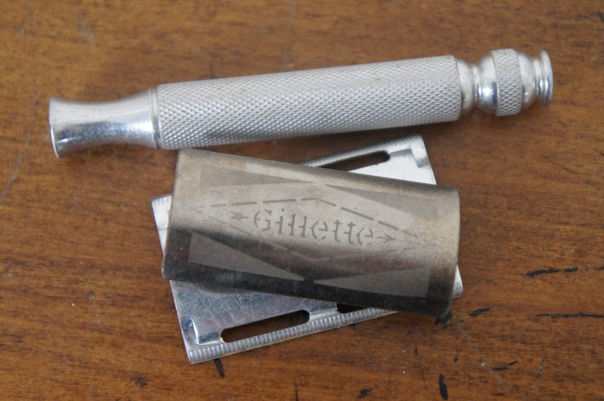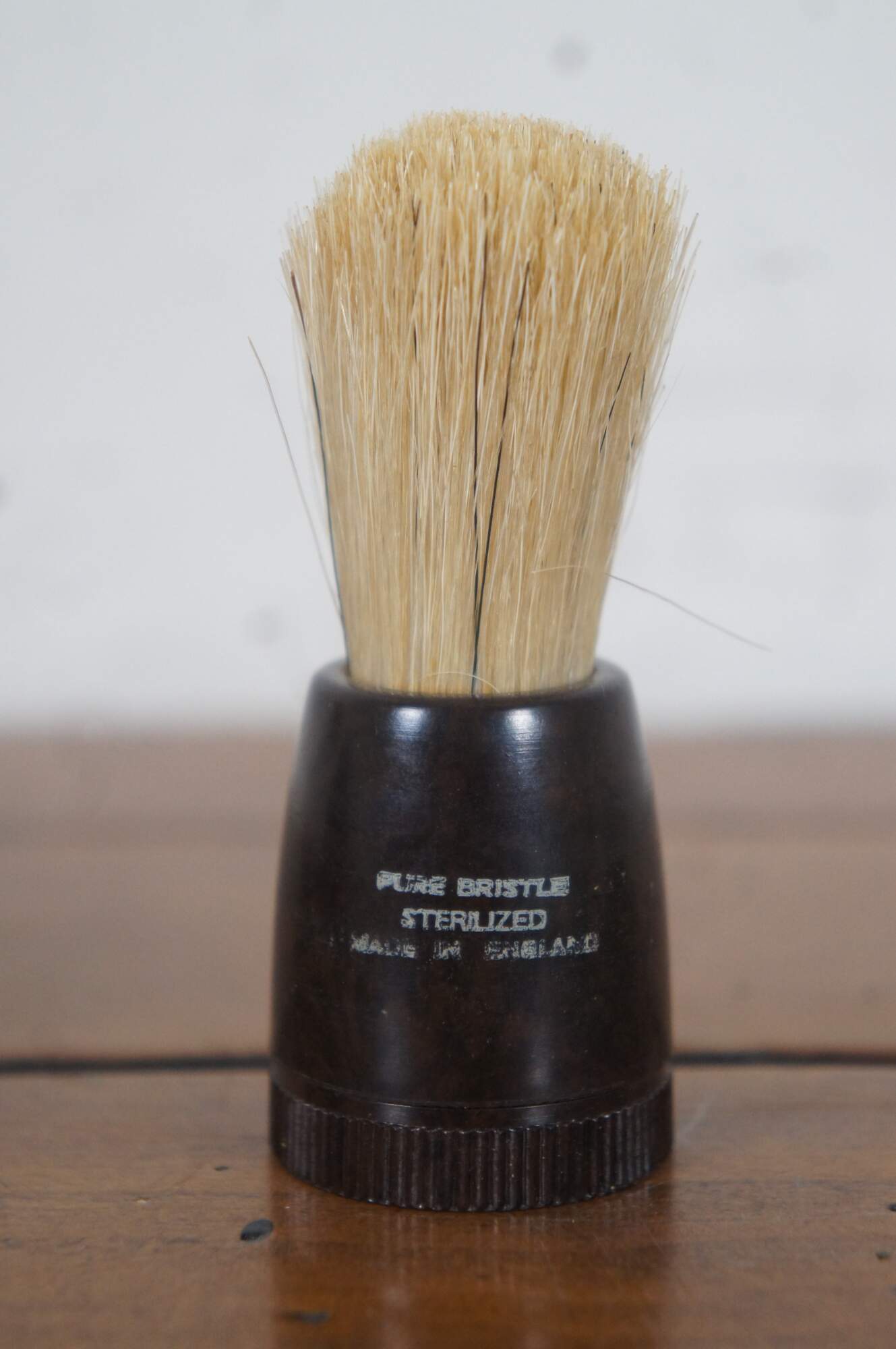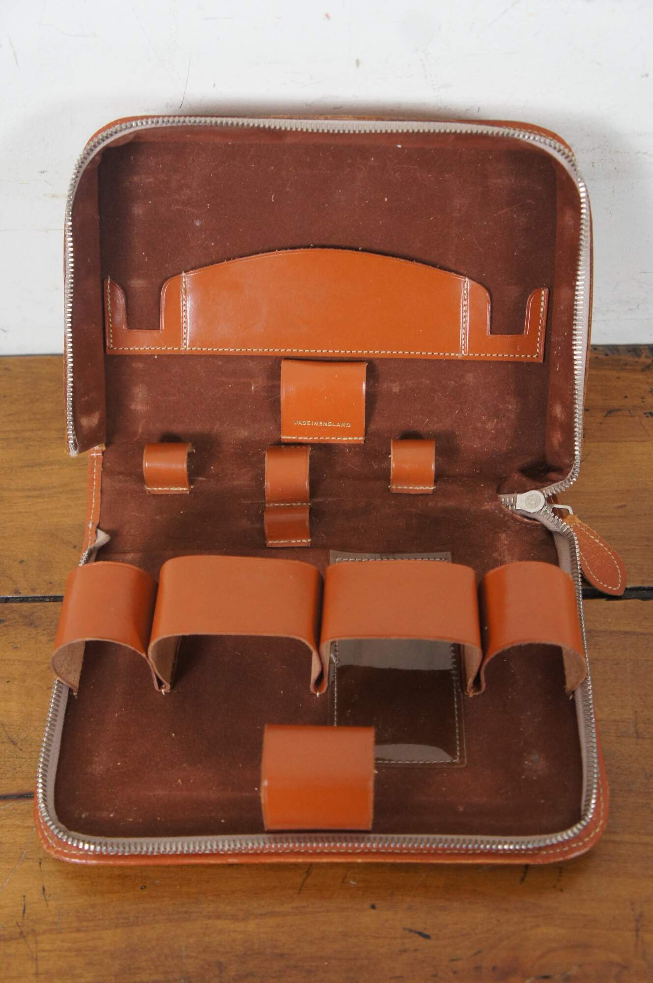 Mid 20th century men’s travel kit, Made in England of peanut butter brown leather with zippered sides. Contains chromium plated hand mirror, toothbrush holder, soap box, and two storage canisters with brown plastic lids - one of which contains a natural bristle shaving brush, two brown plastic tubes – one empty/missing top and one containing a styptic stick, one wooden handled palm sized brush with nylon bristles, and Gillette brand safety razor.