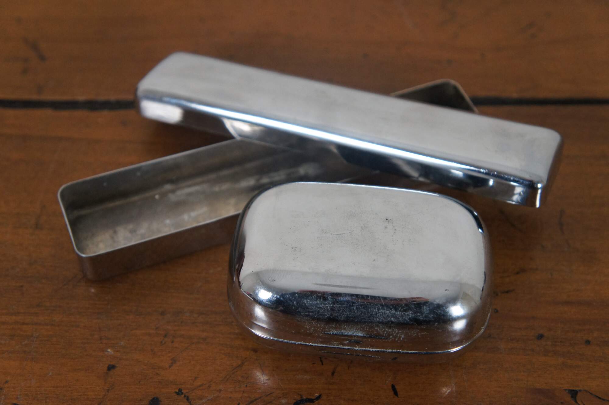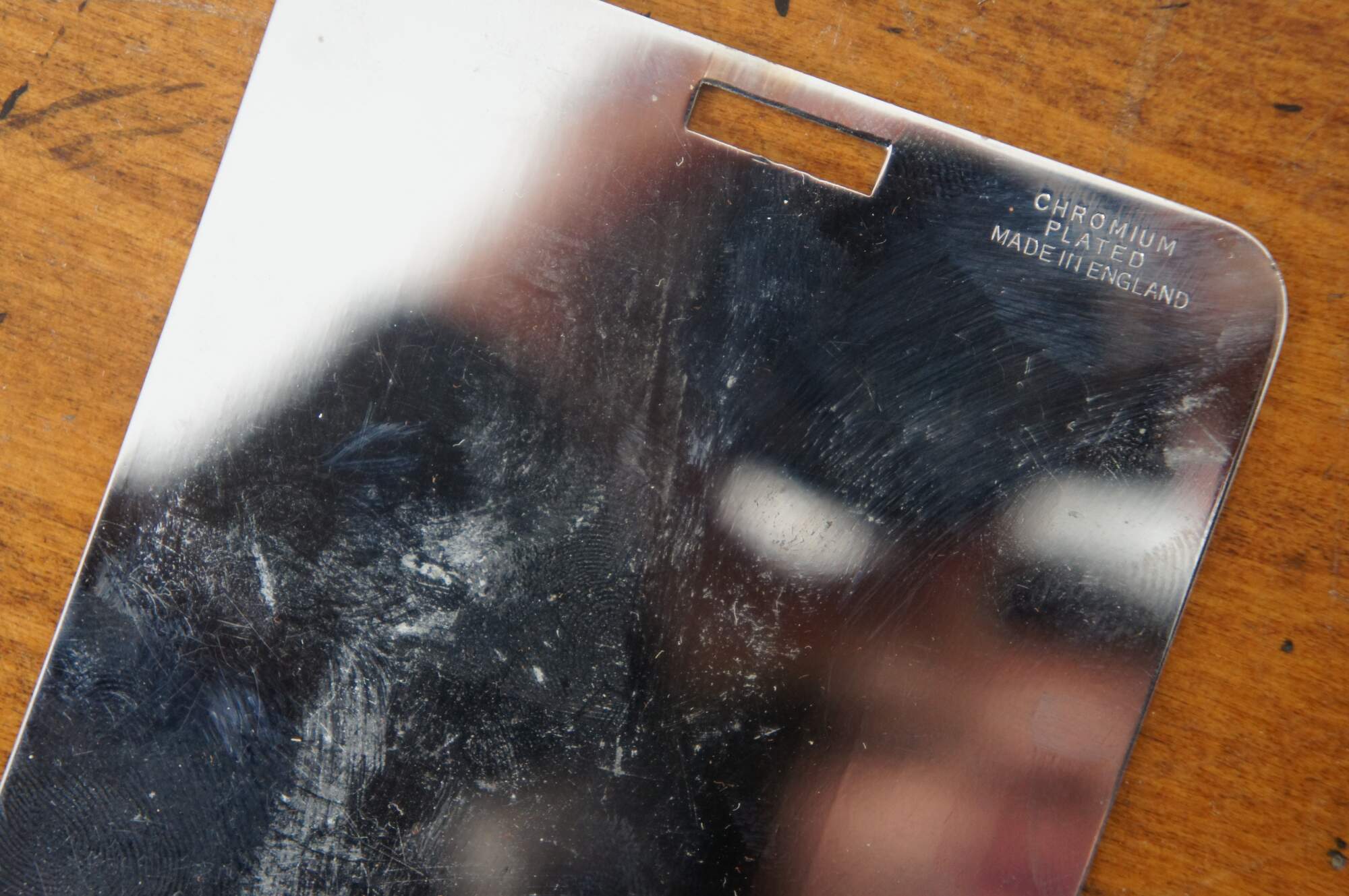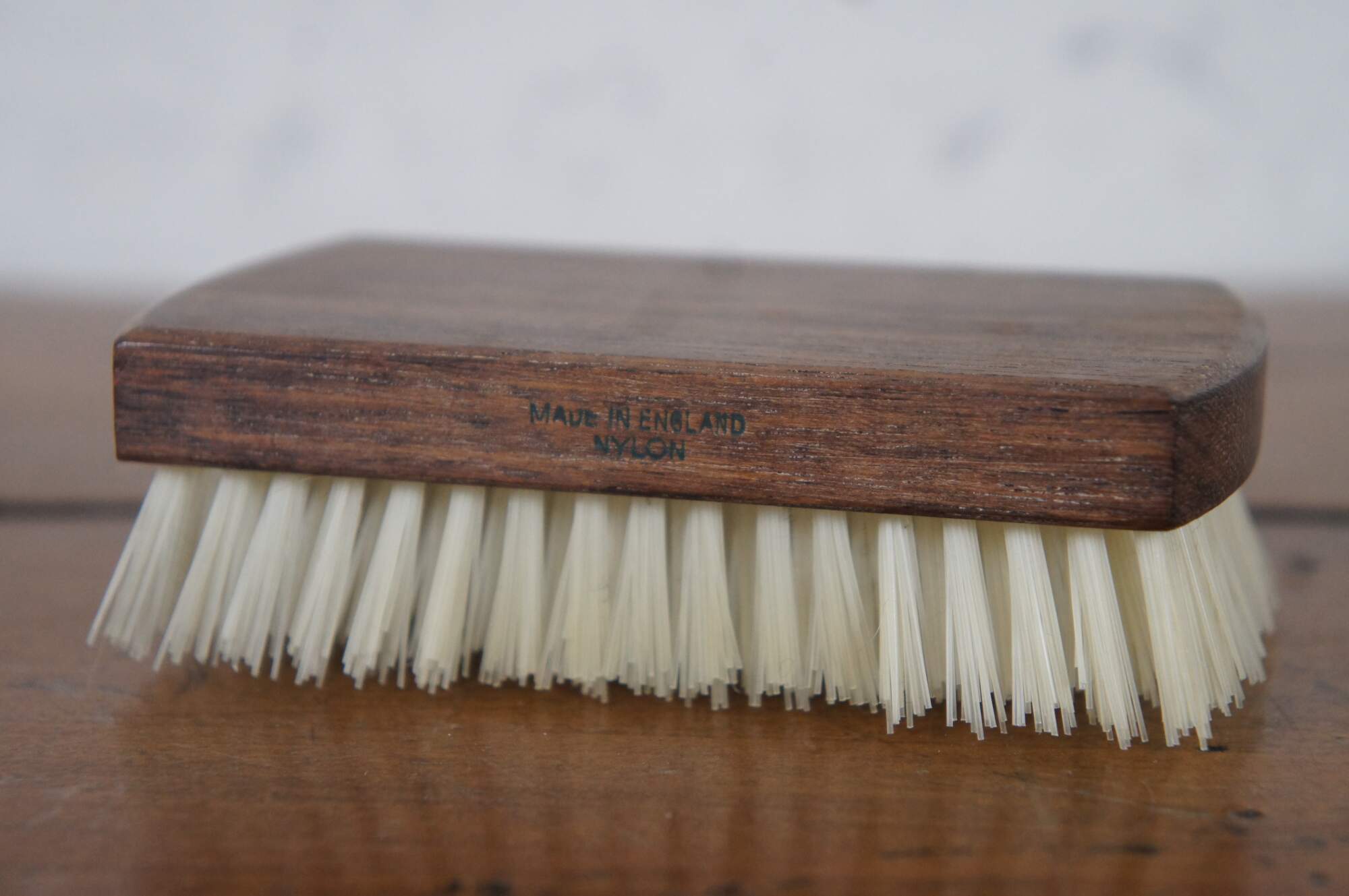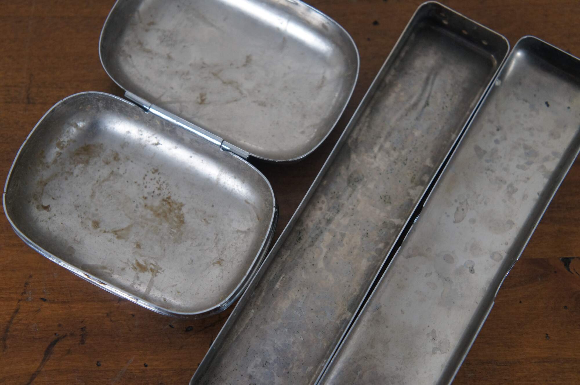 Mid 20th century men’s travel kit, Made in England of peanut butter brown leather with zippered sides. Contains chromium plated hand mirror, toothbrush holder, soap box, and two storage canisters with brown plastic lids - one of which contains a natural bristle shaving brush, two brown plastic tubes – one empty/missing top and one containing a styptic stick, one wooden handled palm sized brush with nylon bristles, and Gillette brand safety razor.