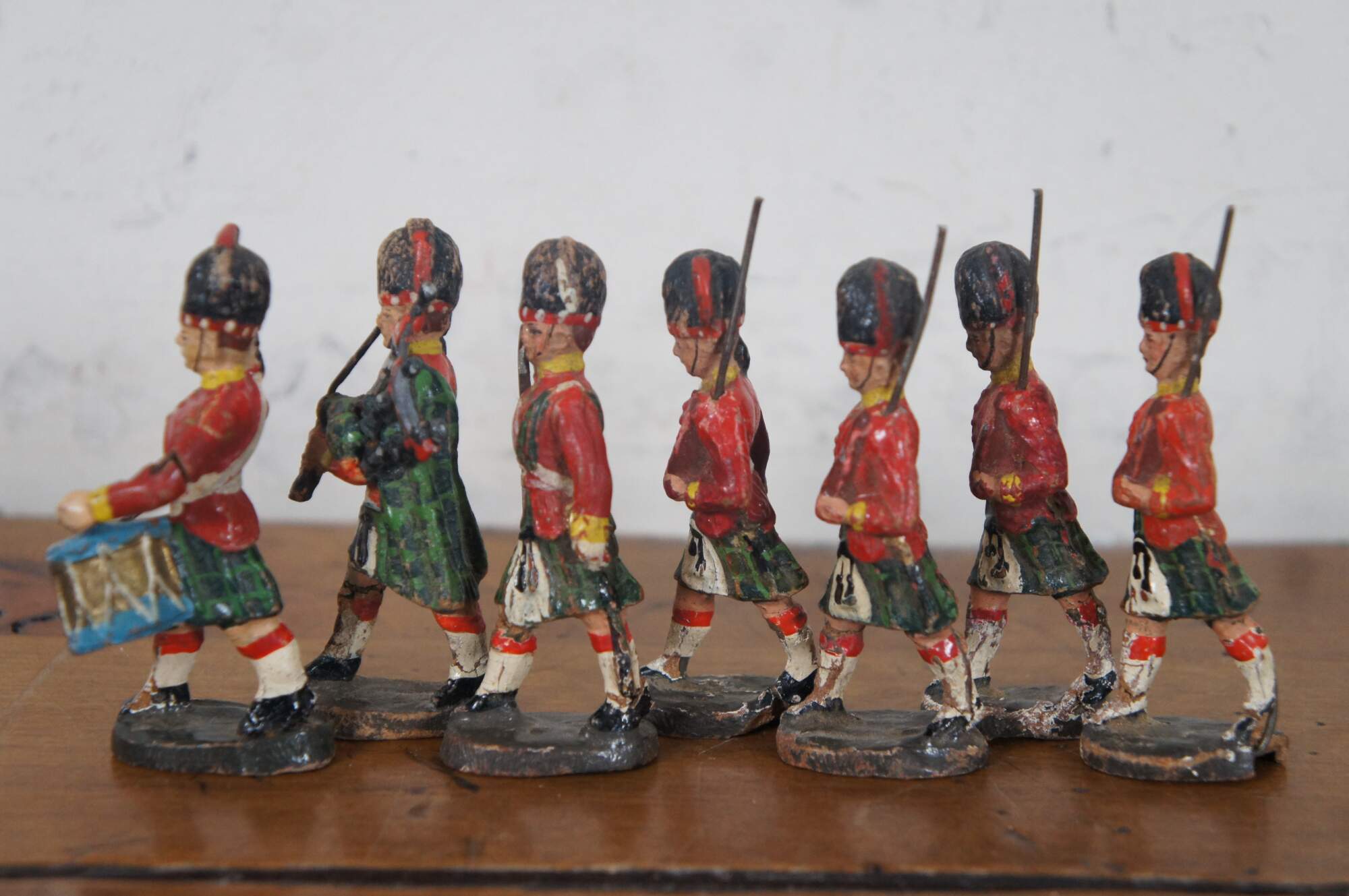 Set of seven vintage circa 1960’s Elastolin toy soldiers dressed as Scottish Highlanders in Blackwatch kilts and red coats.