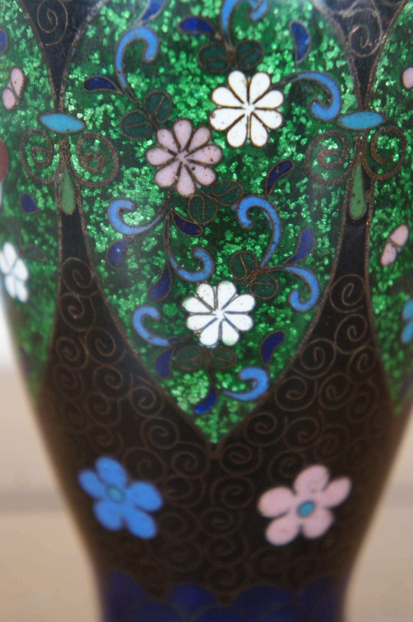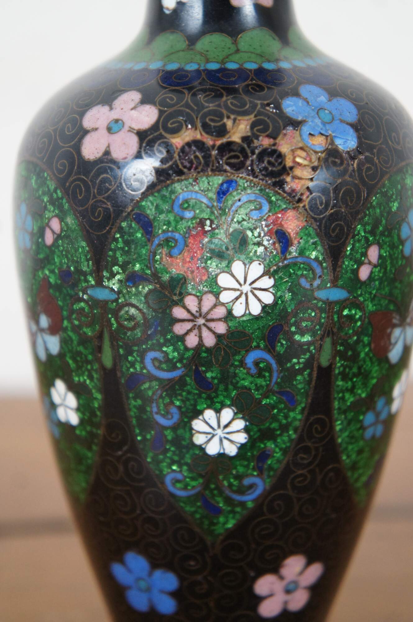 Antique Meiji era Japanese cloisonne bud vase in black with prominent pink, blue, and white flowers in and around tear drop shaped sections of green ginbari.