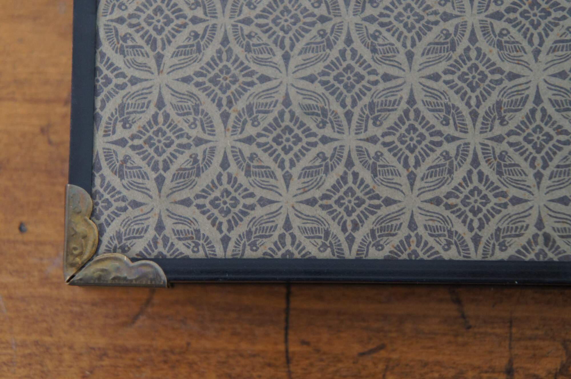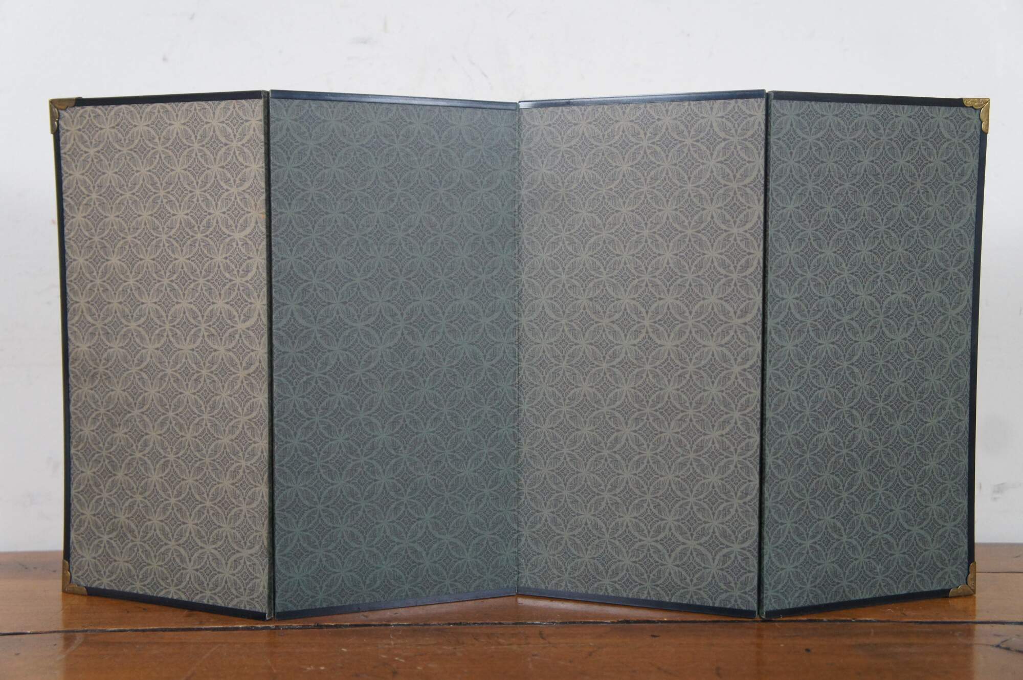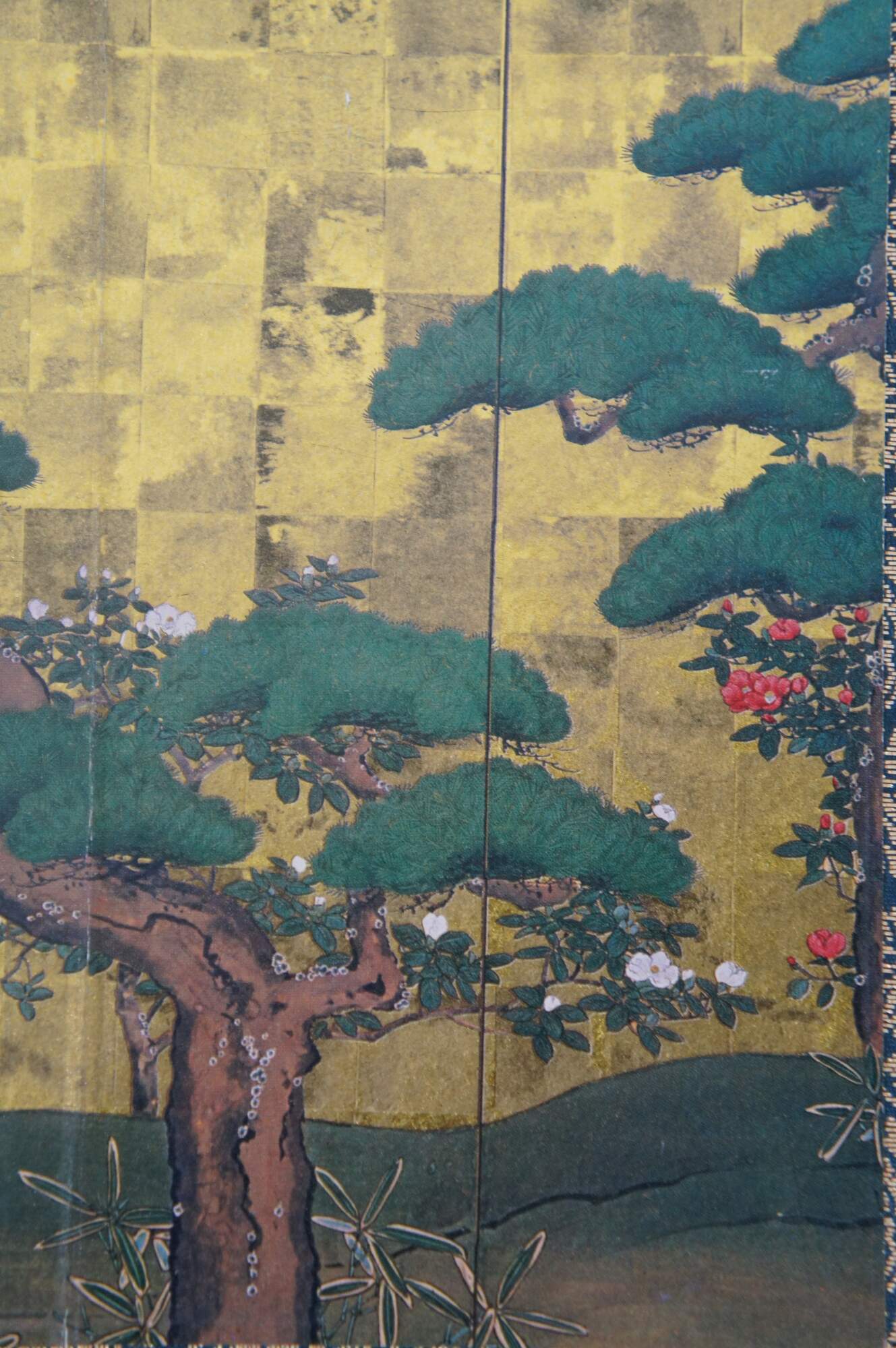 Vintage tabletop four panel Japanese privacy screen featuring cranes and a gnarled pine tree with a metallic gold background, surrounded by a fabric border and brass corners.