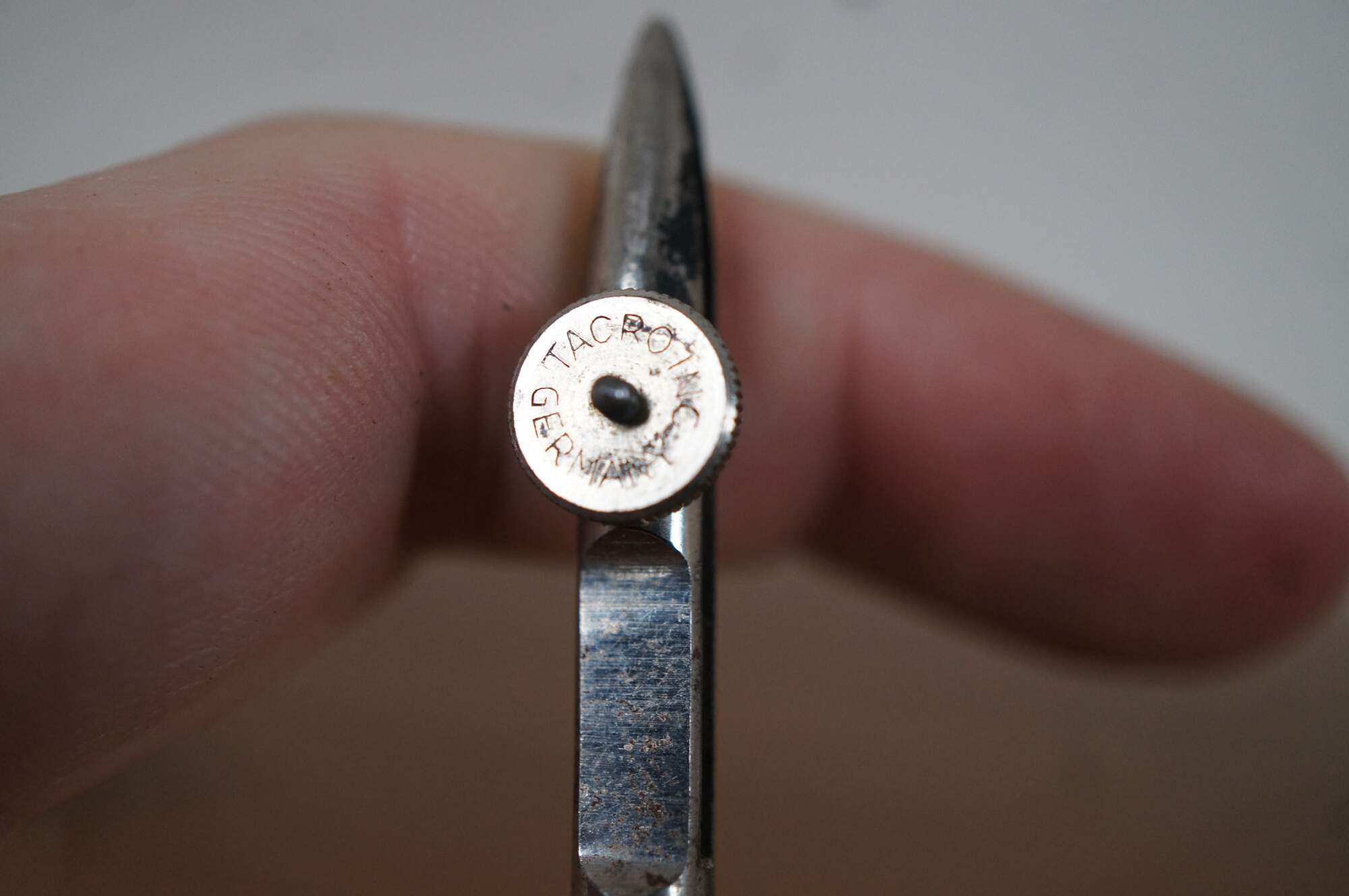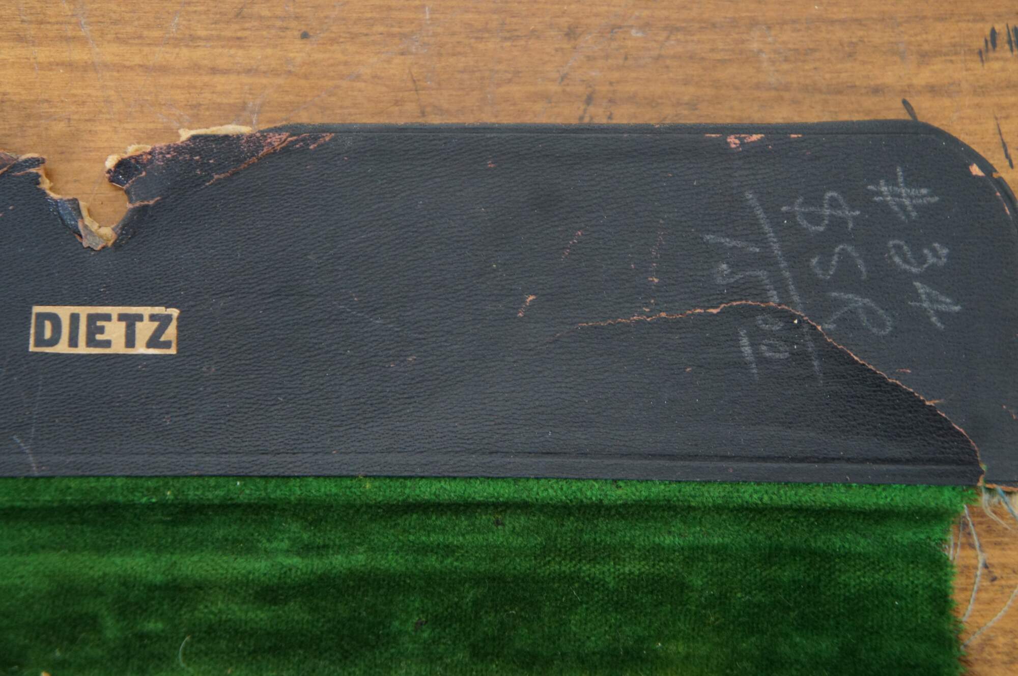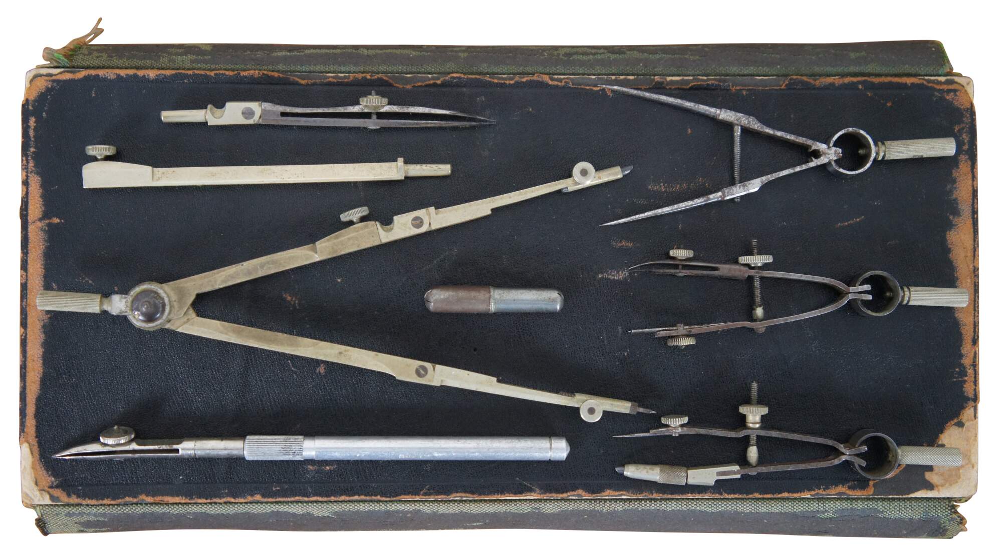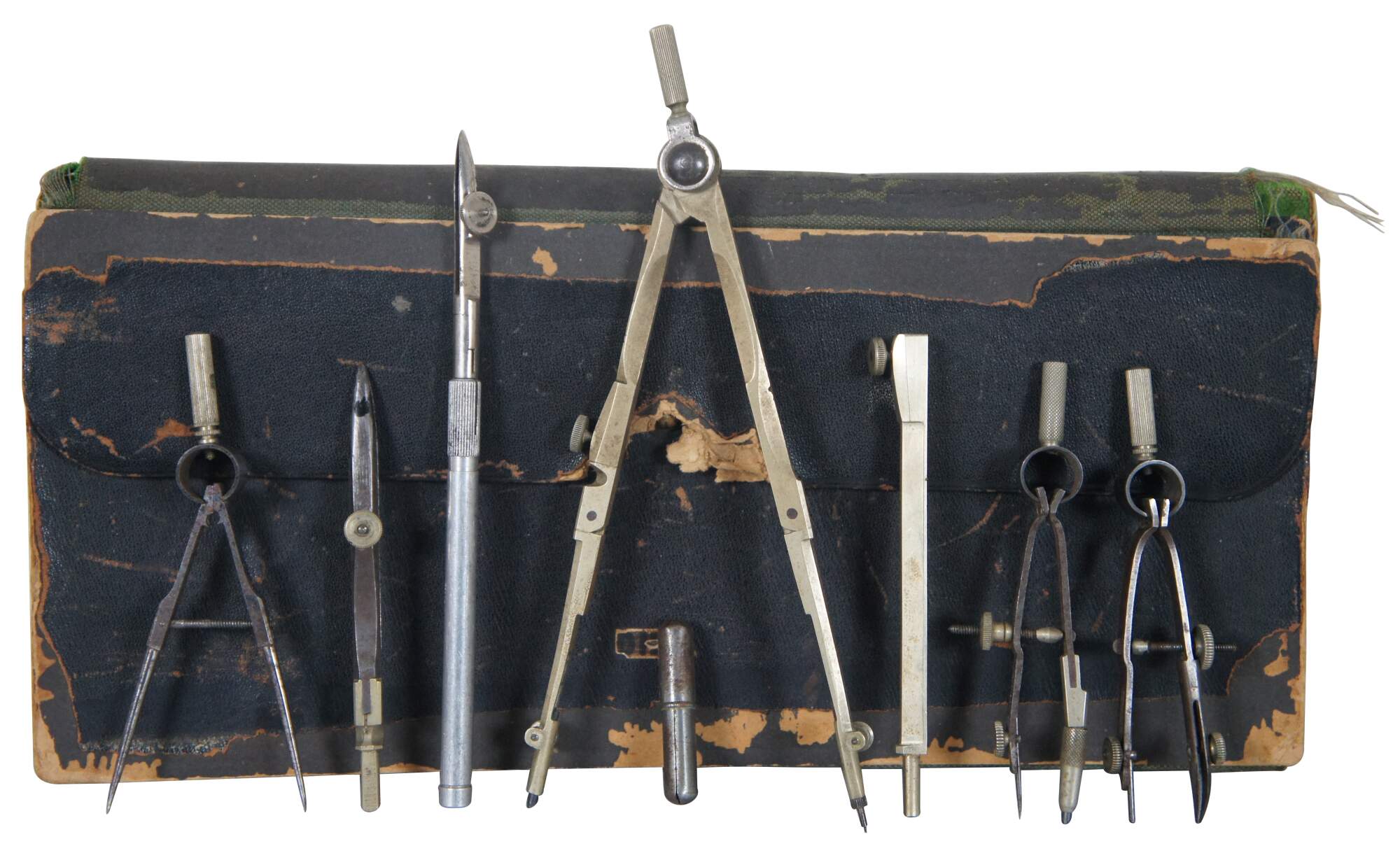 Vintage drafting tools / compass set in a wallet style leatherette case lined with green velvet. Tools by a variety of makers. Case marked Dietz.