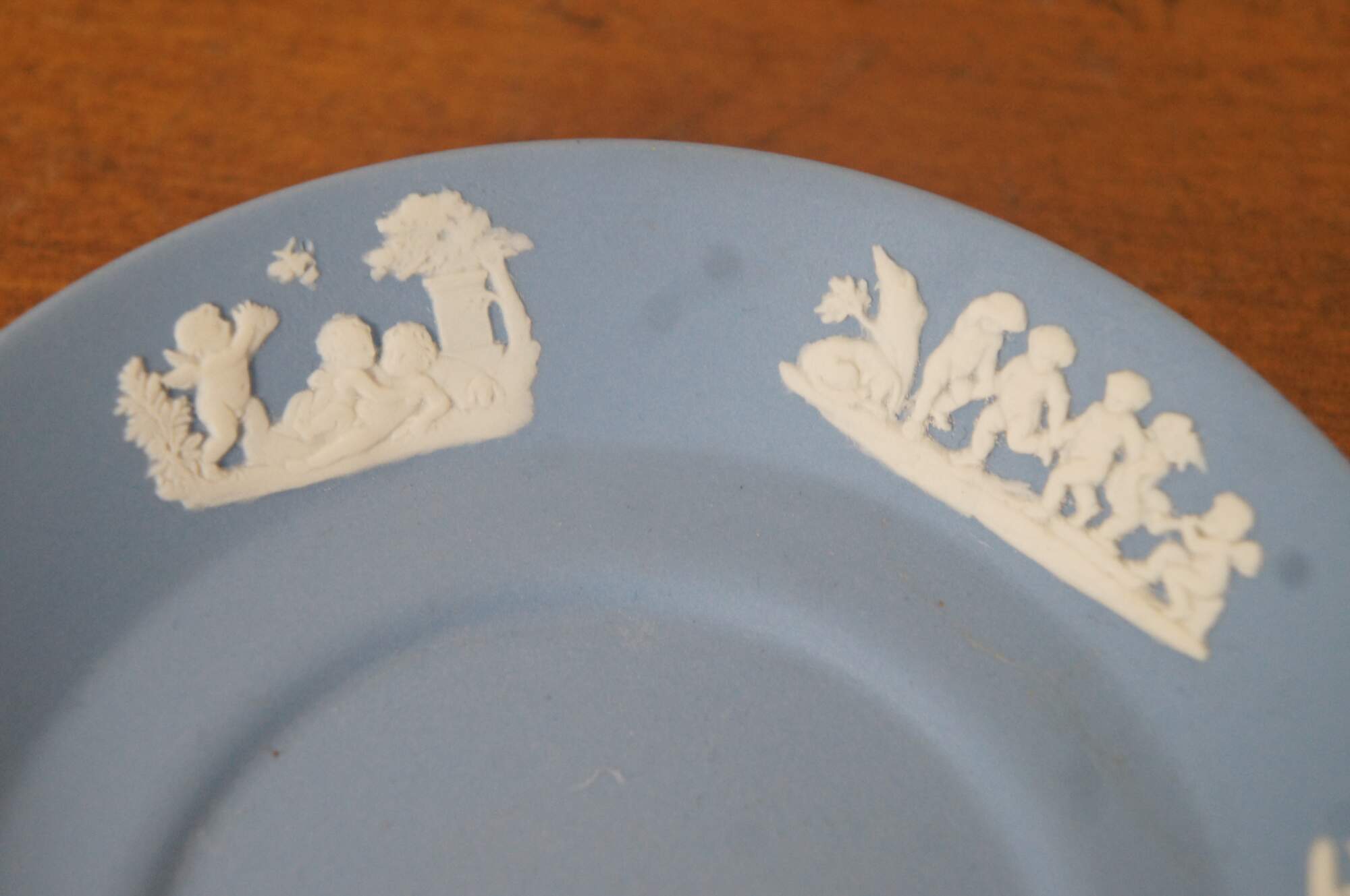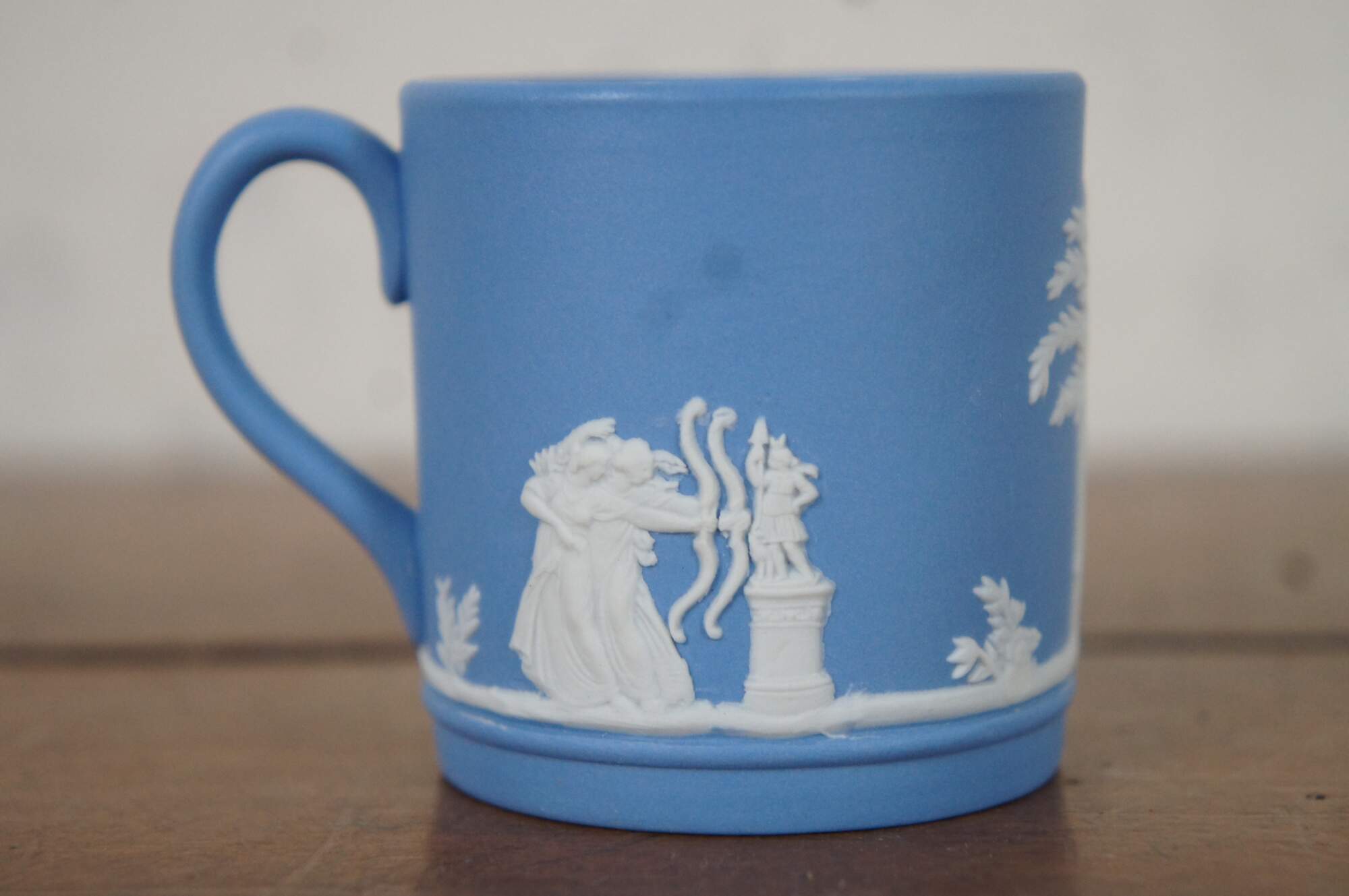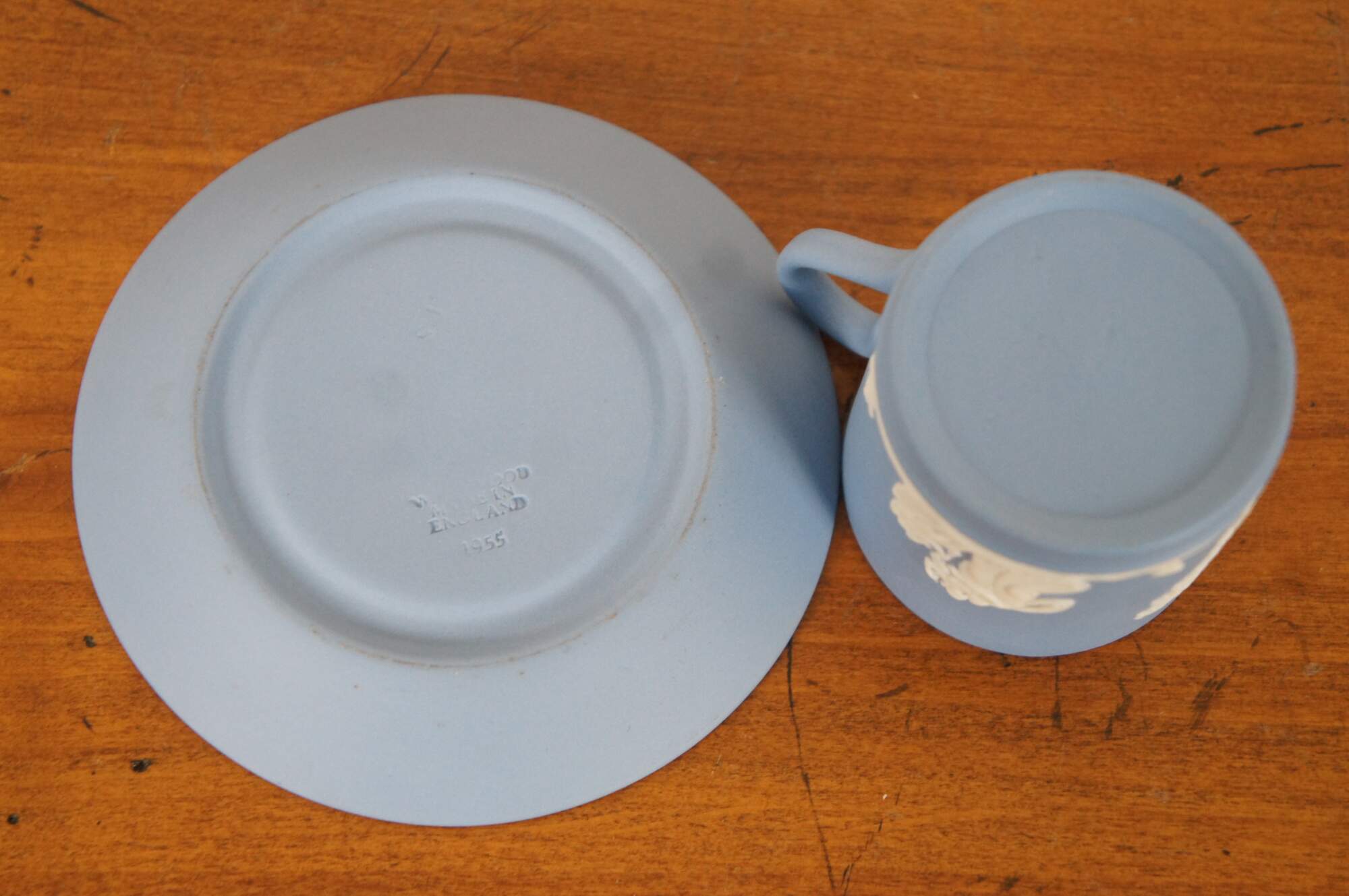 Vintage Wedgwood 1955 blue jasperware demitasse coffee cup and saucer with traditional applied cream neoclassical figures.