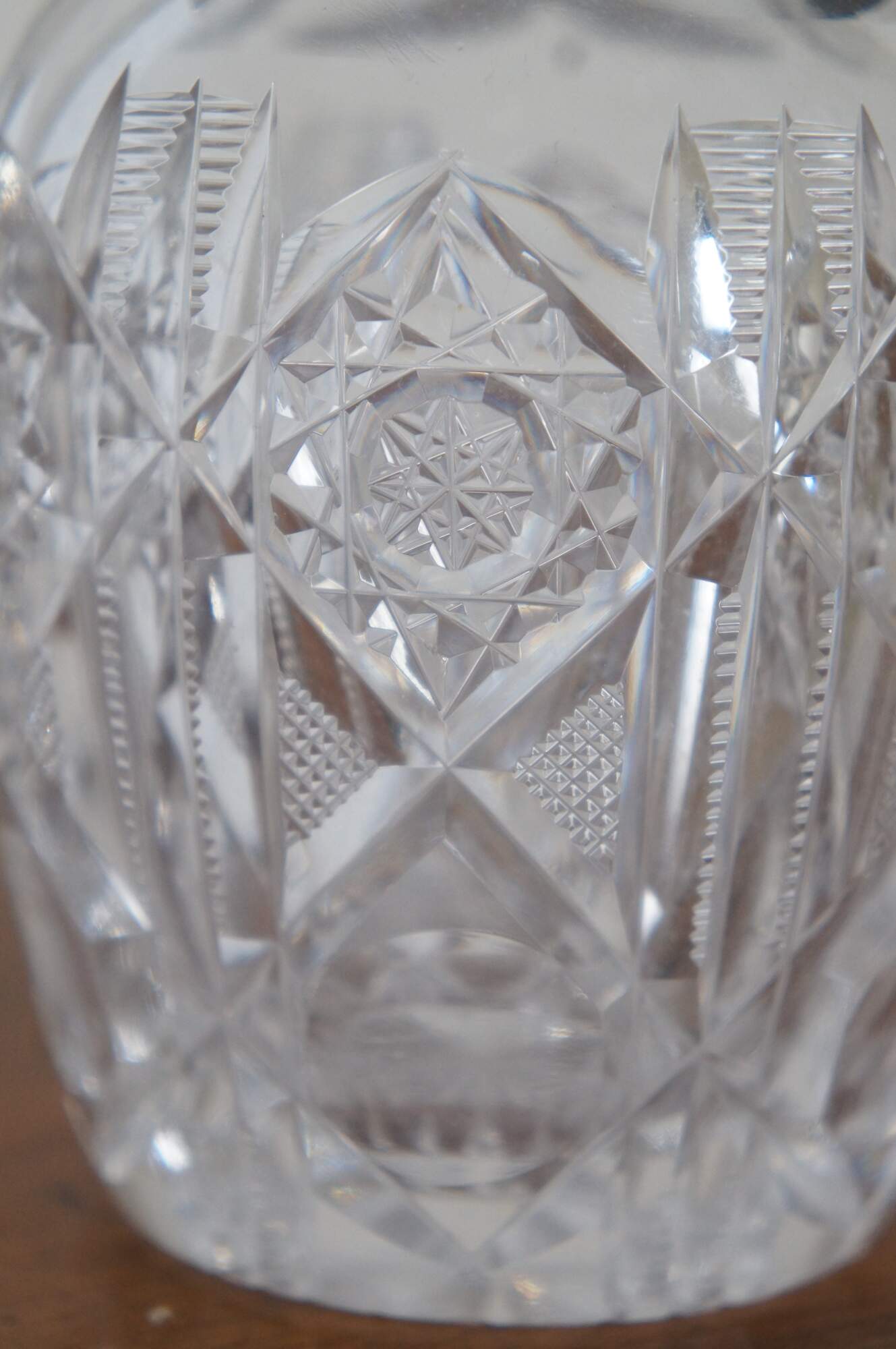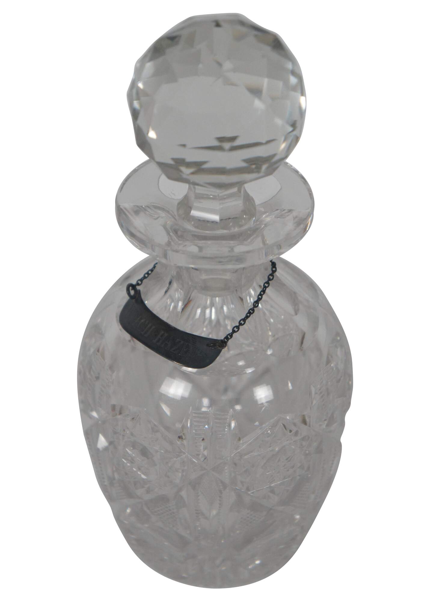 Antique cut glass vanity bottle and stopper with metal label marking the bottle for witch hazel, a popular astringent.