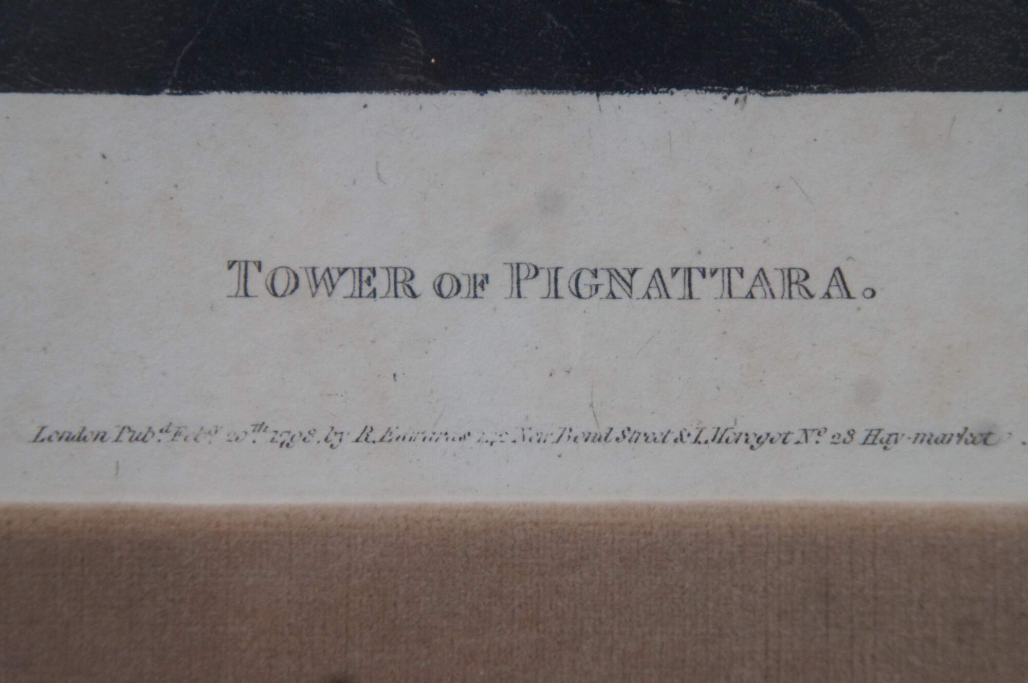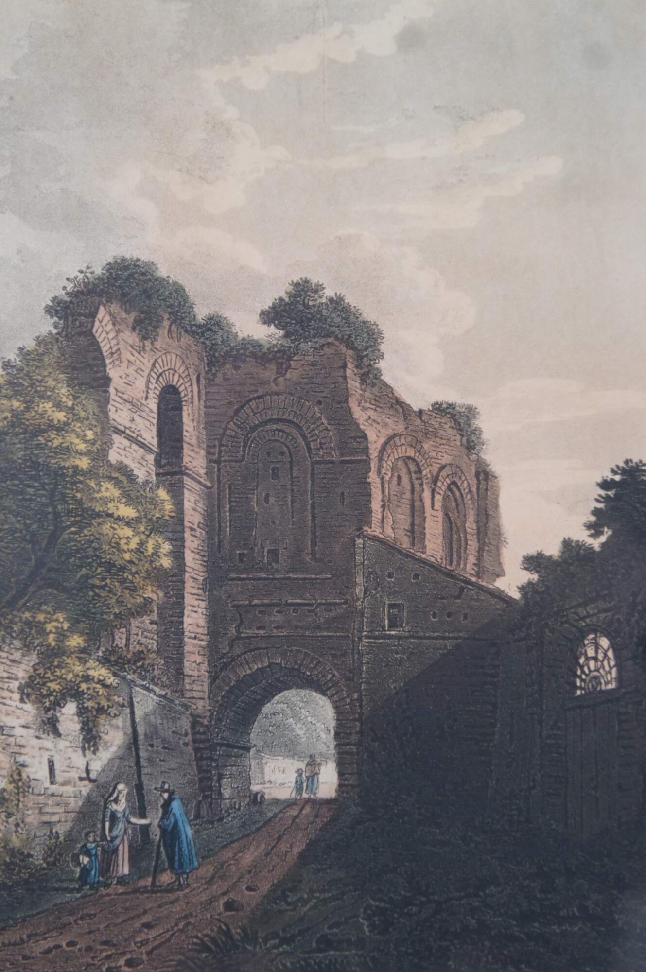 Set of four late 18th century hand colored engraving - “The Gate of St. Sebastian” published 1796 by James Merigot, “Tower of Pignattara” published 1798 by R. E(illegible), “Temple of Minerva Medica” publisher information faded away, and “The Arch of Dolabella” published 1797 by James Merigot. All labeled on reverse of frames as being “Marigot Views” by Rudolph Lesch Fine Arts Inc. From A Select Collection of Views and Ruins in Rome and its Vicinity, by James Merigot circa 1797.