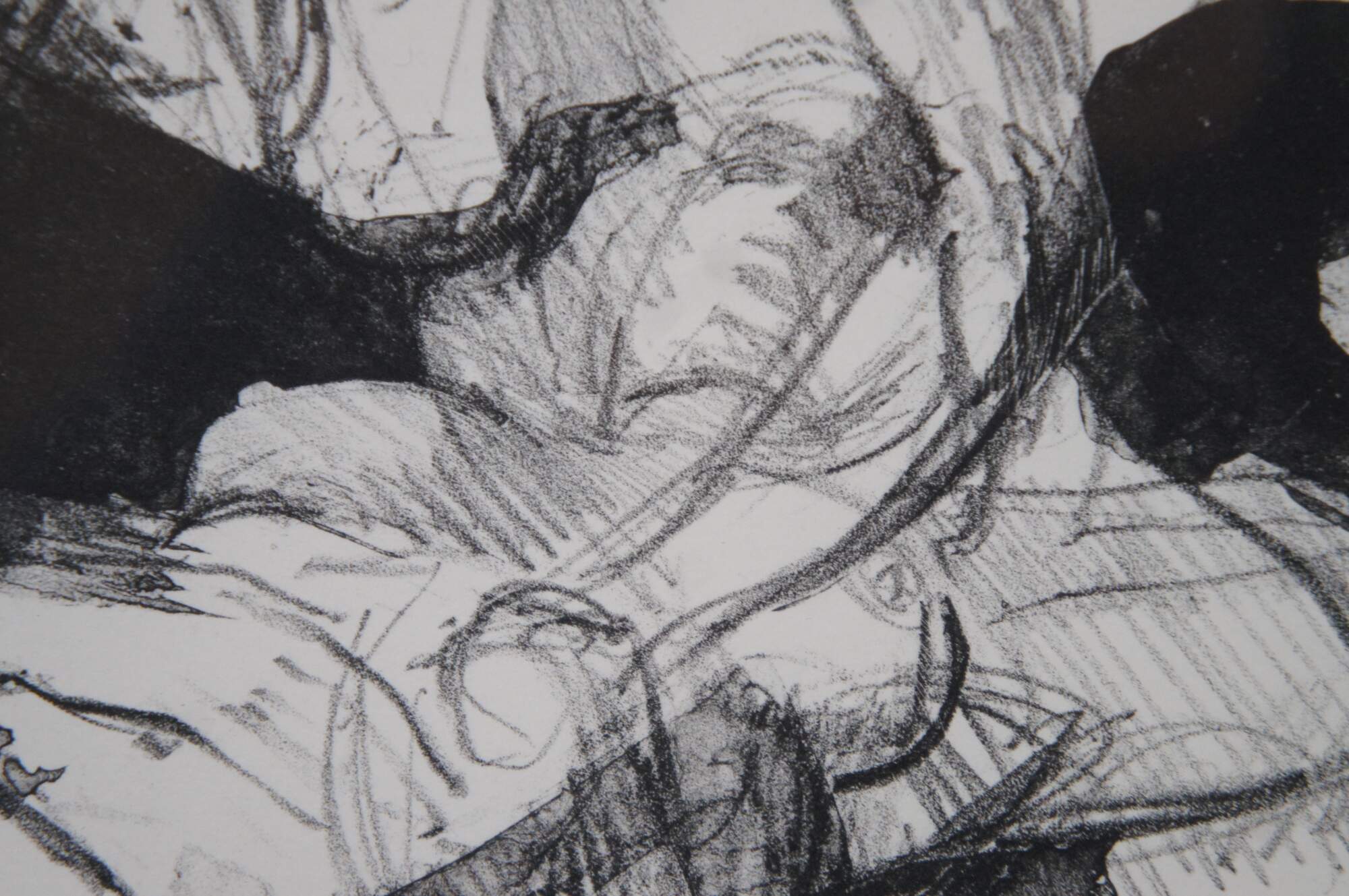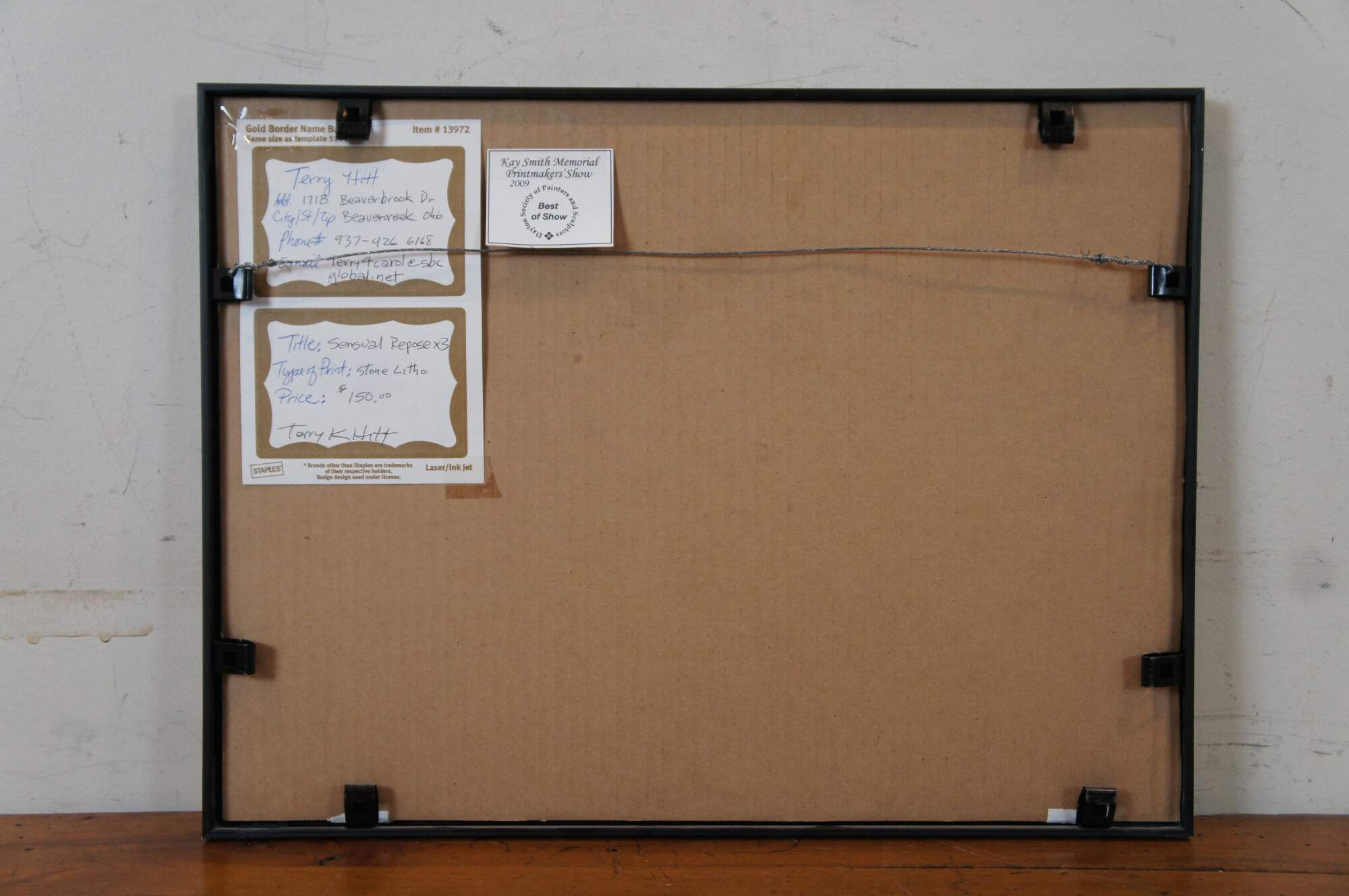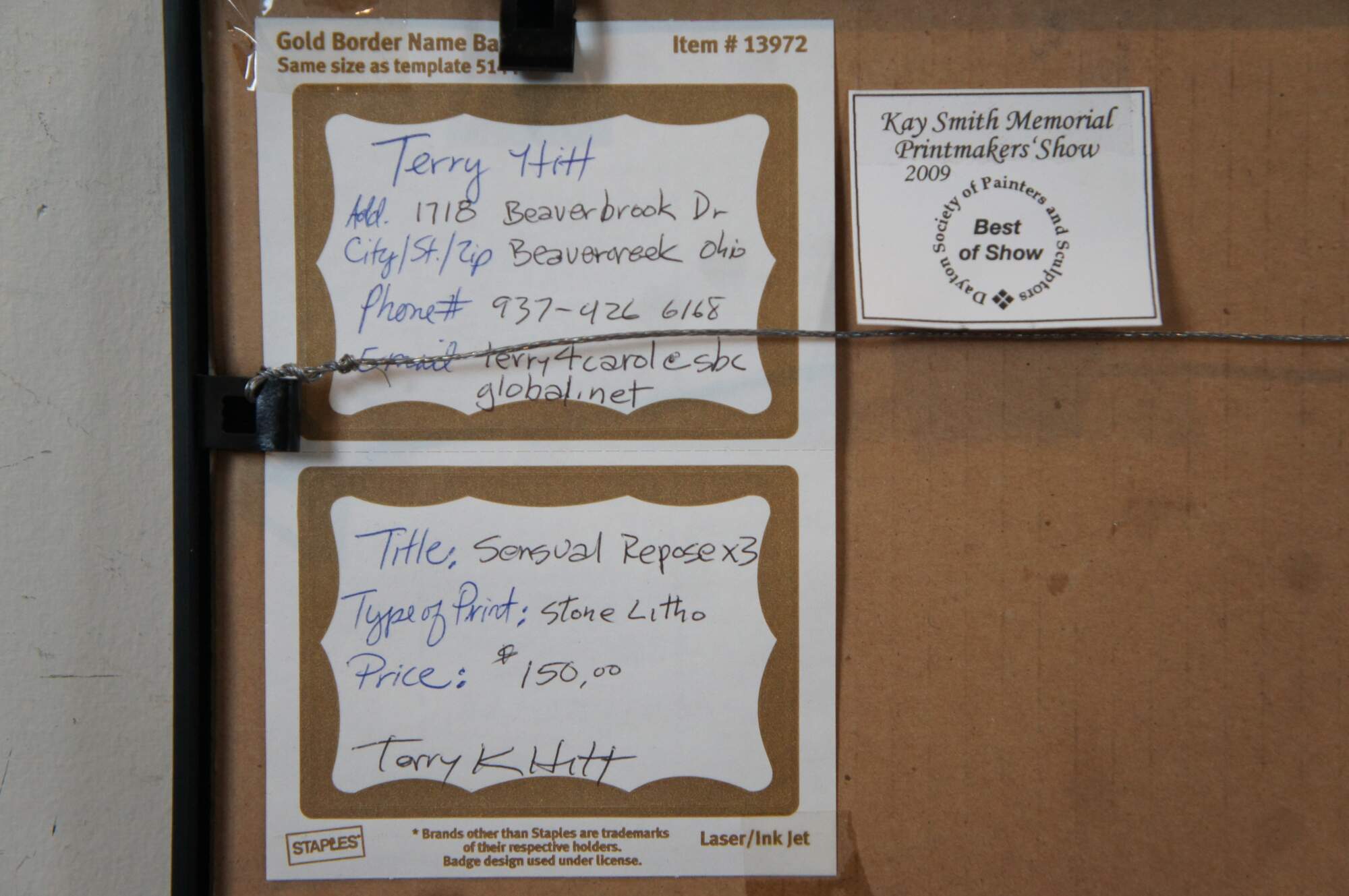Limited edition stone lithograph print by Beavercreek, OH artist Terry Hitt, titled “Sensual Repose X3,” pencil signed and numbered 5/6. Awarded Best of Show at the 2009 Kay Smith Memorial Printmakers Show. Features an abstract nude women, reposed in different positions that overlap.
