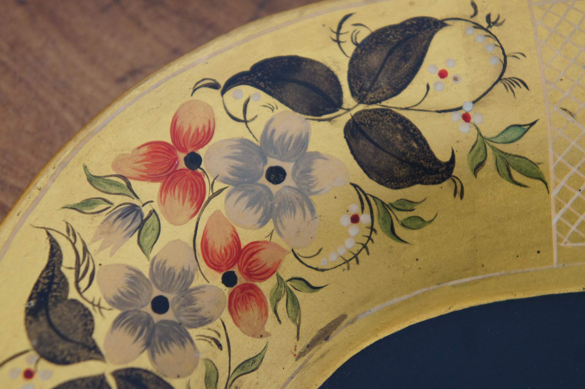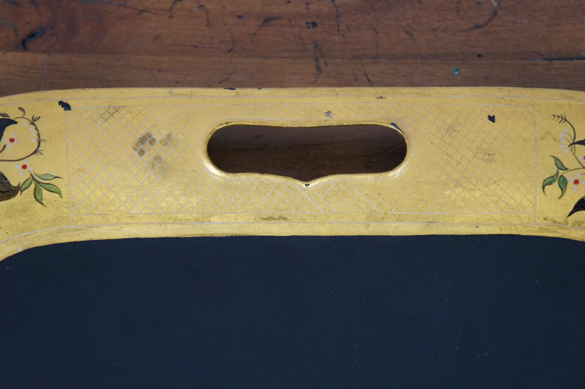 Primitive early 20th century black and yellow toleware tray. Features a handled pattern with stencilled fruit and flower motif.