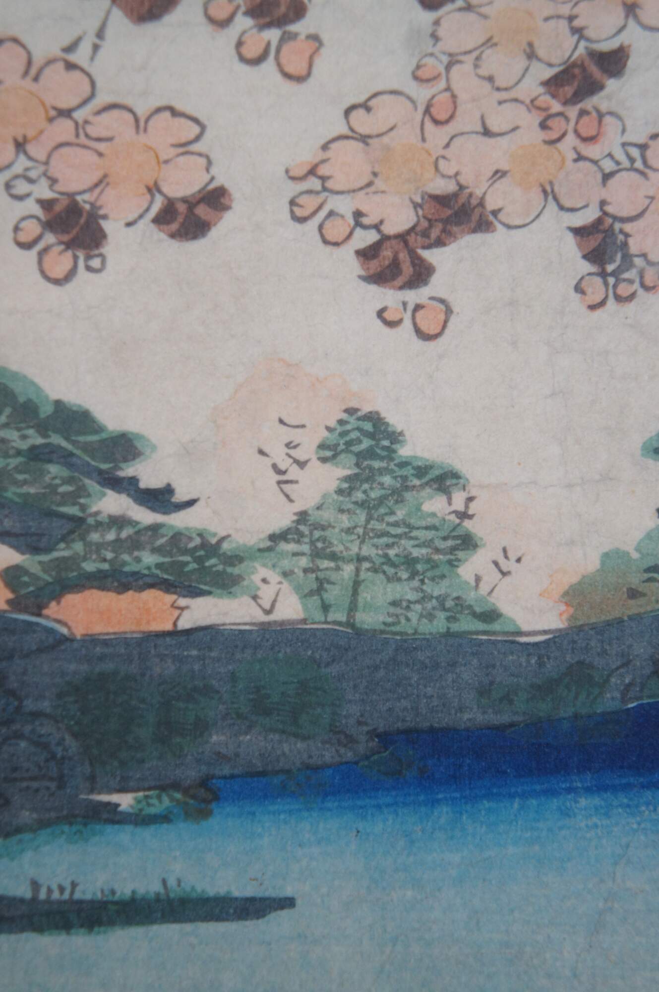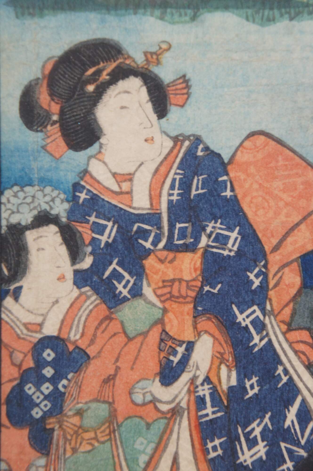 Antique 1858 Japanese woodcut print by Toyohara Kunichika, showing four elegantly dressed Geishas in a garden under cherry blossom trees.