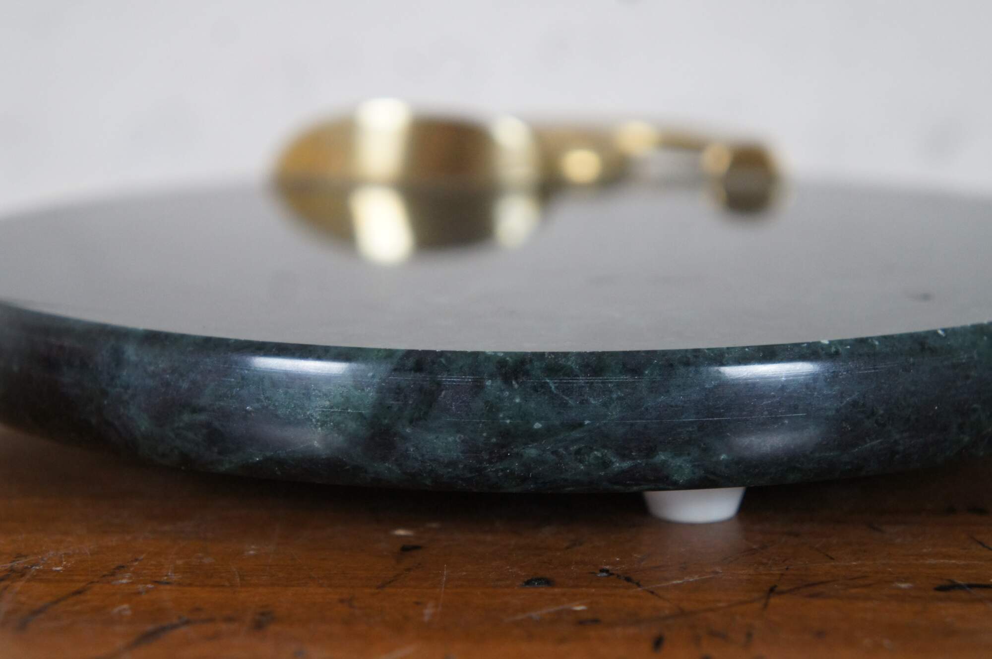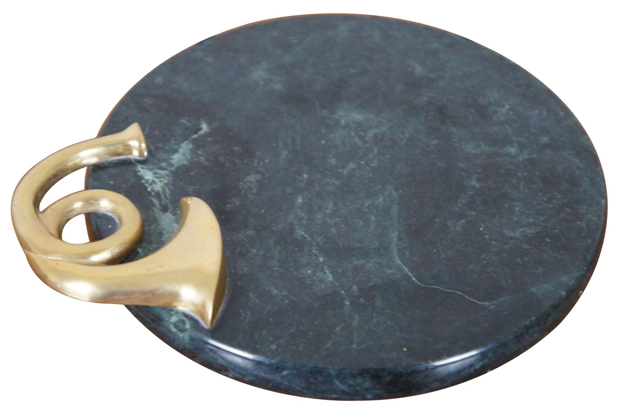 Vintage round green marble cheese plate / serving tray / champagne / wine / magnum bottle coaster featuring a musical orchestra theme a brass French Horn shaped handle and white plastic feet.