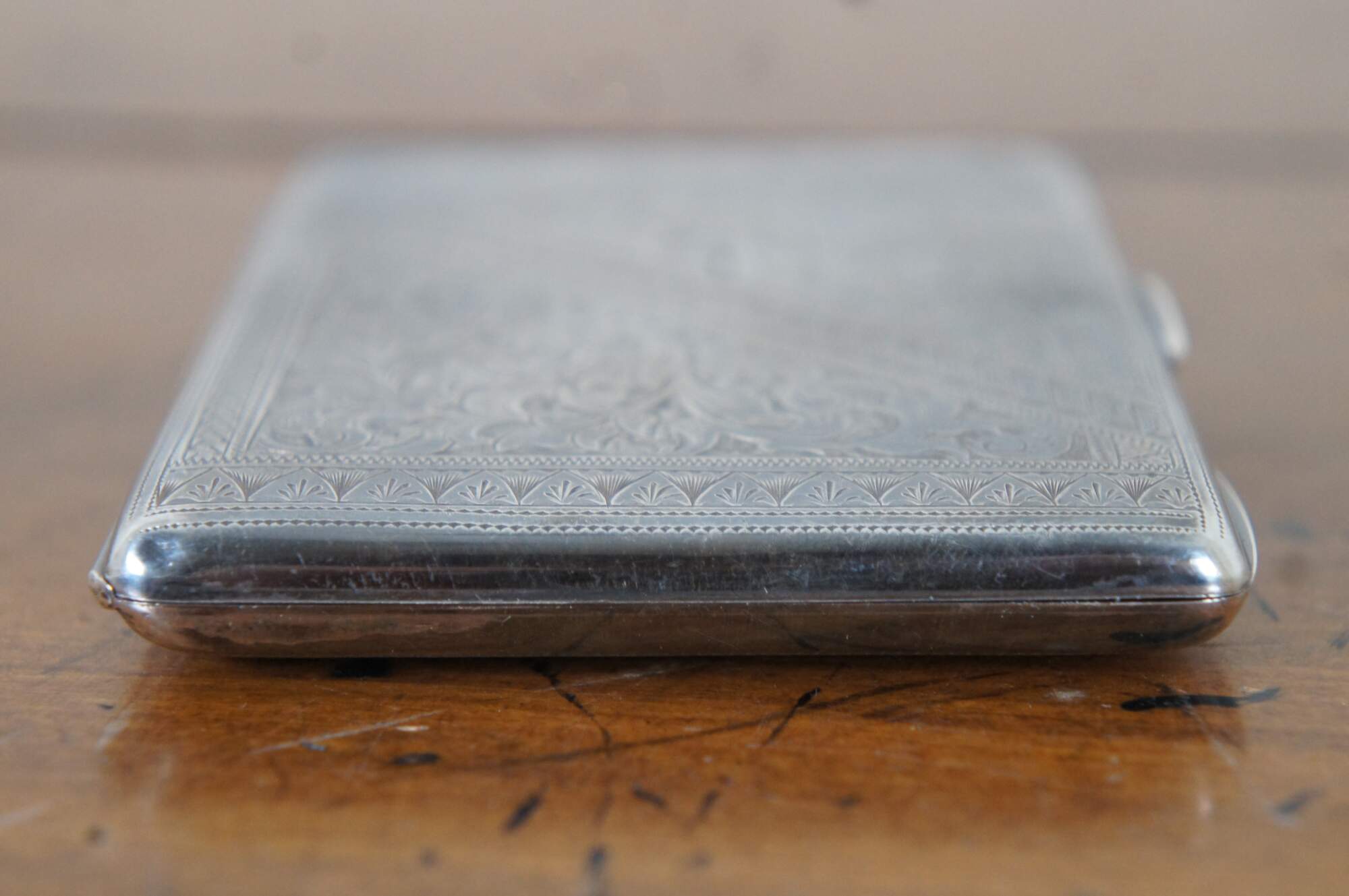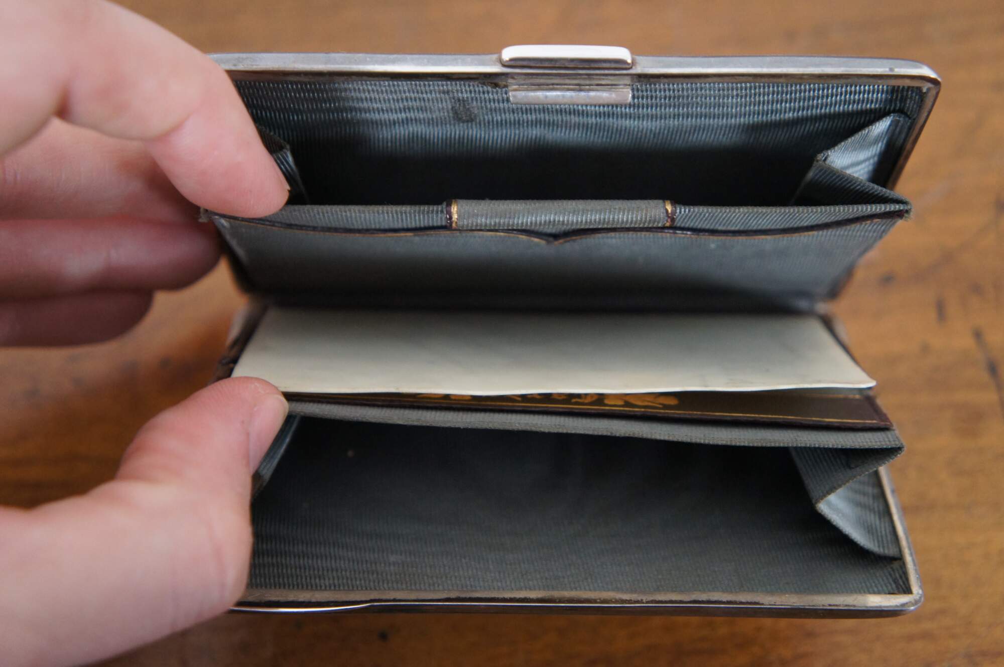 Antique 1891 sterling silver notebook / calling card / business card case / aide memoire with etched floral pattern exterior, cadet blue silk lining sporting two card holding compartments, a loop for a small pencil, gold stamped leather details, and a thin bone note pad (use demonstrated by affirmation left by previous owner (Diligence? is its own reward) and residue from other erased notes). Crafted in Birmingham, England by Hilliard & Thomason.