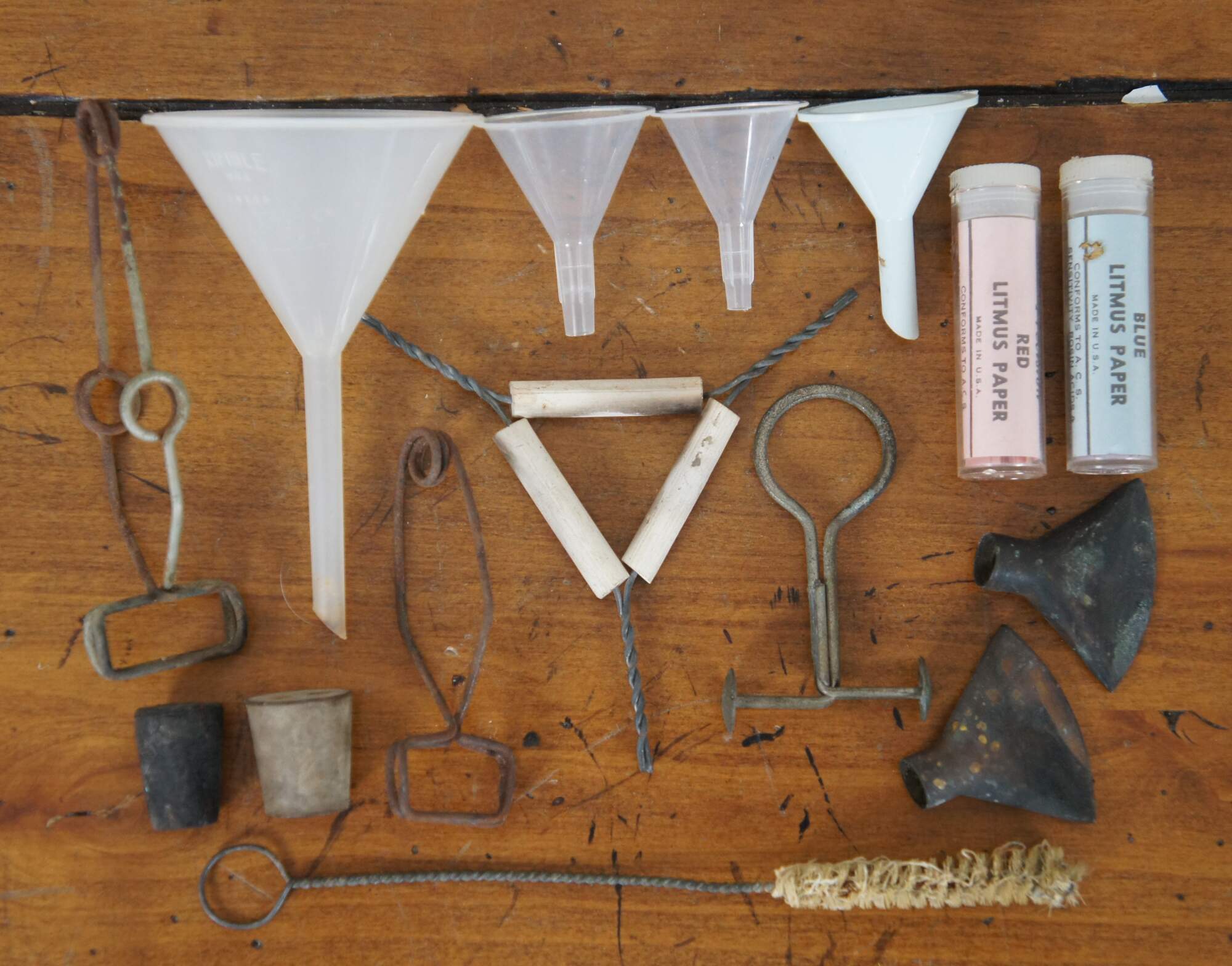 Vintage lot of Chemistry glassware. includes whitall tatum & co bunsen burner stand, pyrex glassware, beakers, porcelain, Kimble chemical thermometer, jars and other accessories