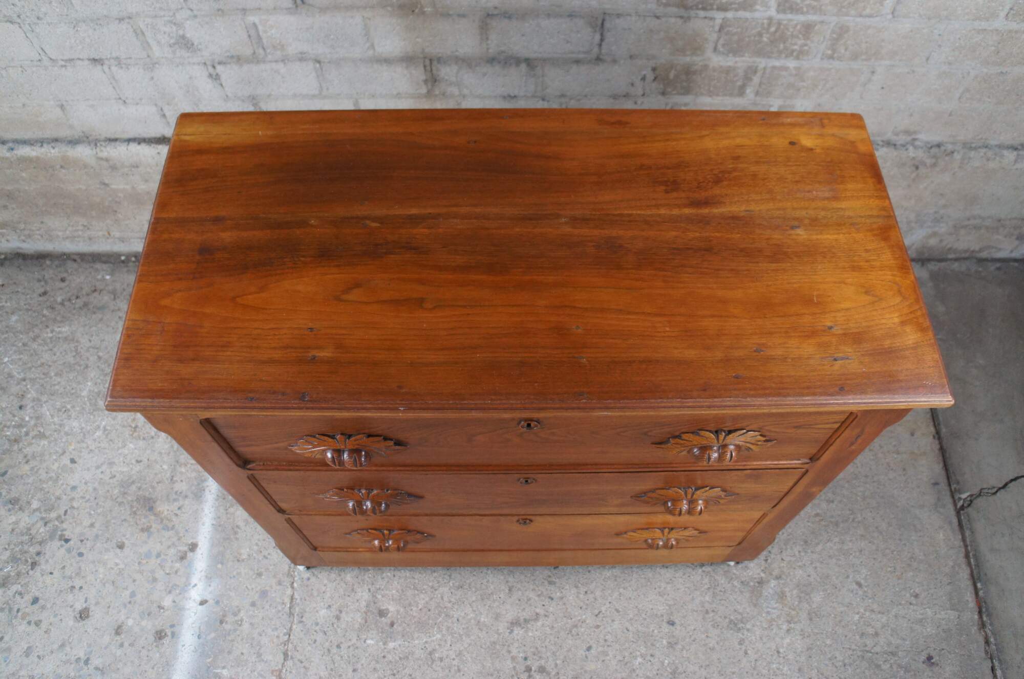 A beautiful American Victorian era dresser. Made from walnut with three dovetailed drawers and chamfered corners. The drawers are dovetailed via the Knapp Joint. Features carved fruit and nut pulls and porcelain casters.