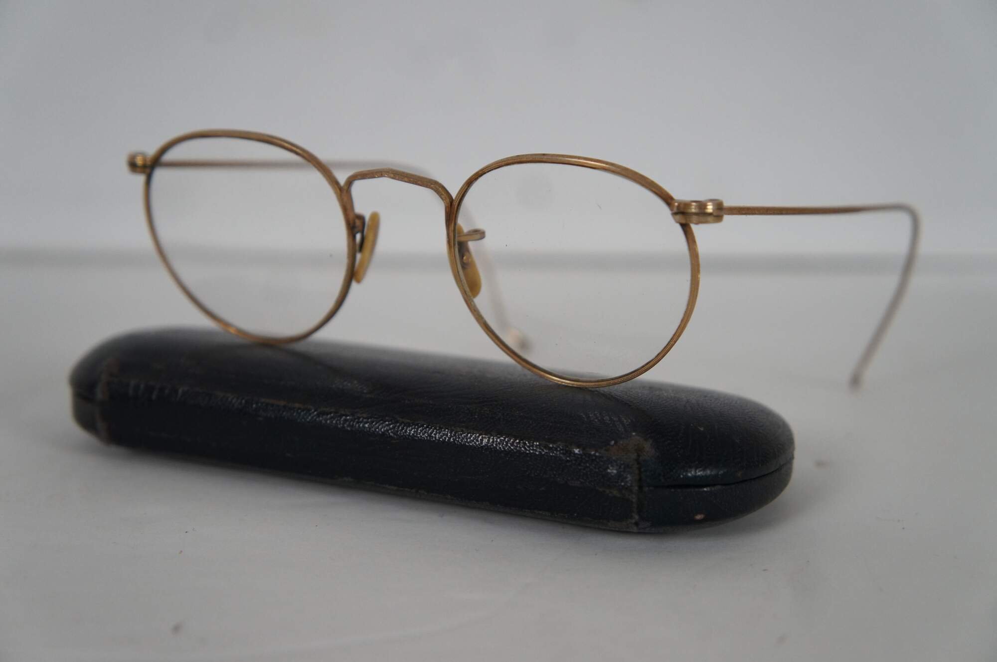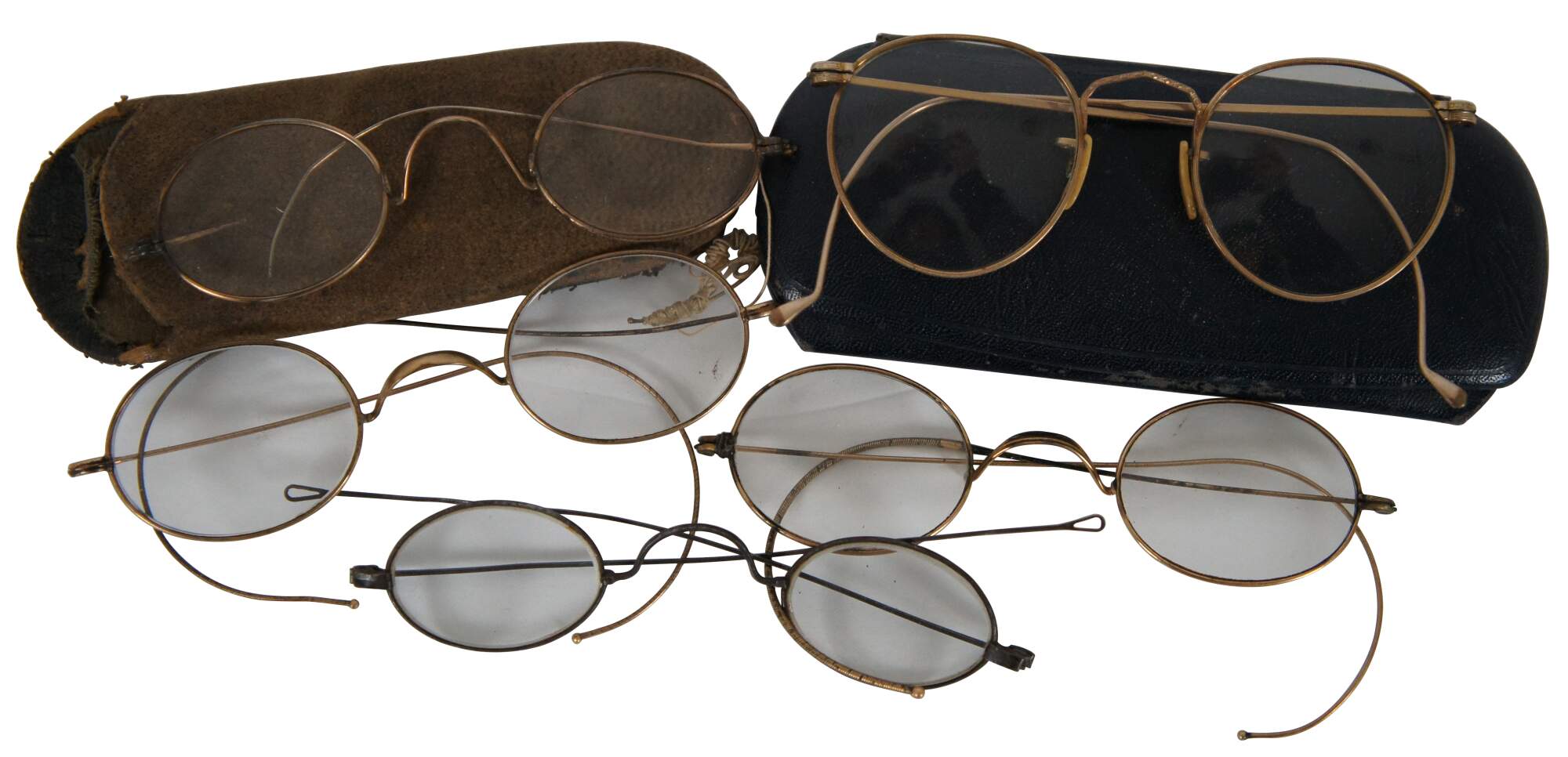 Lot of five antique wire frame eye glasses / spectacles of various lens strengths including one silver tone, four rolled gold / GF. Includes one suede leather slip case and one black leather flip front case.