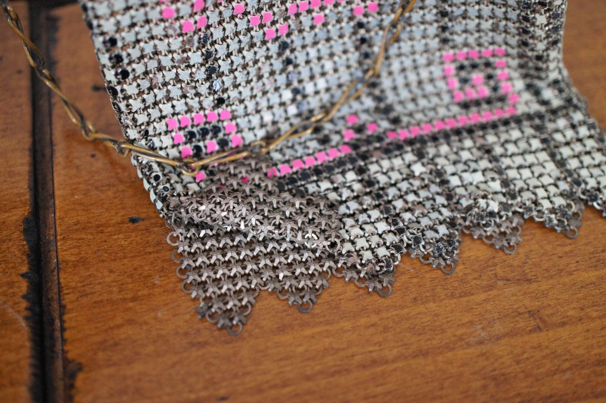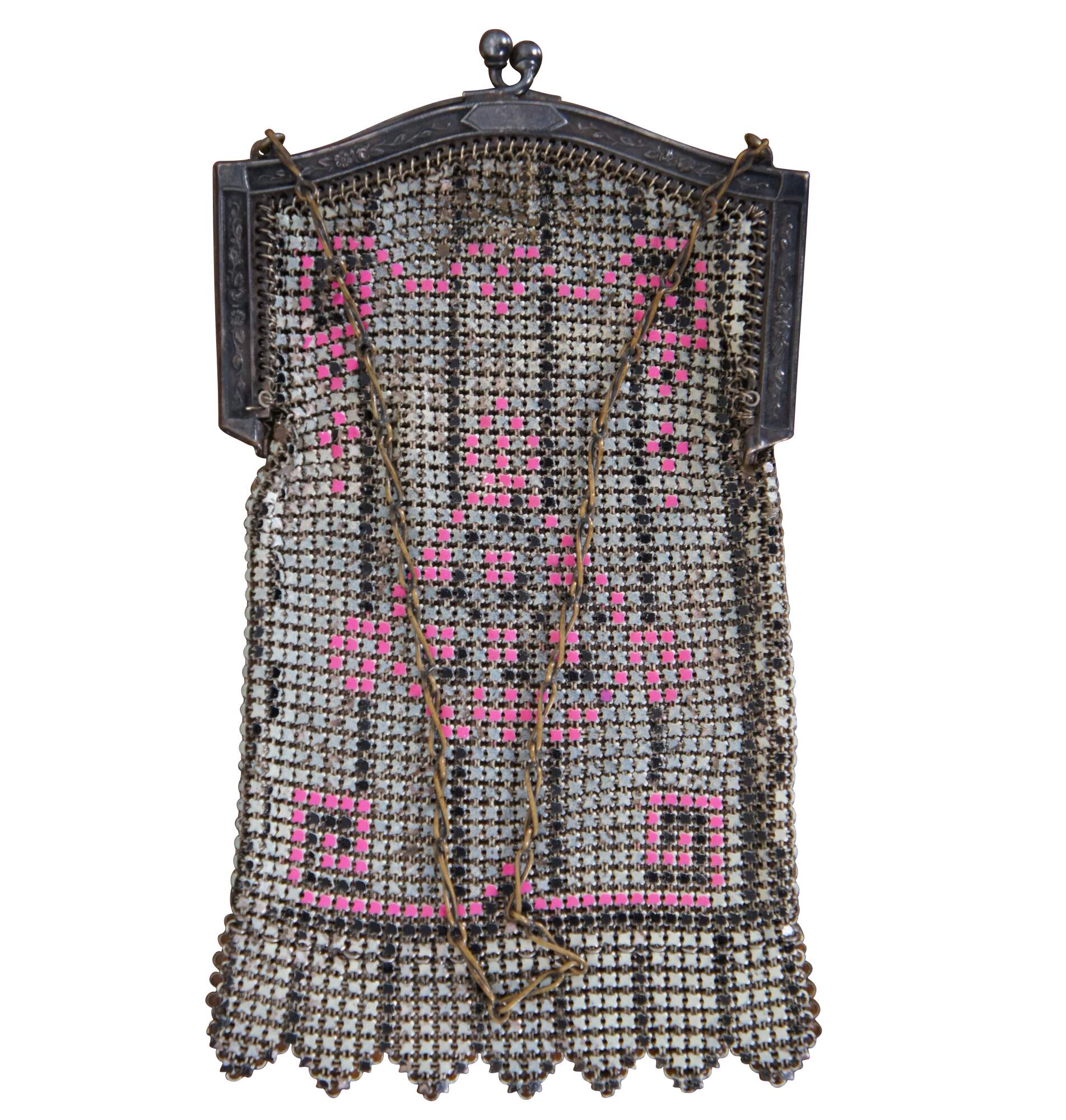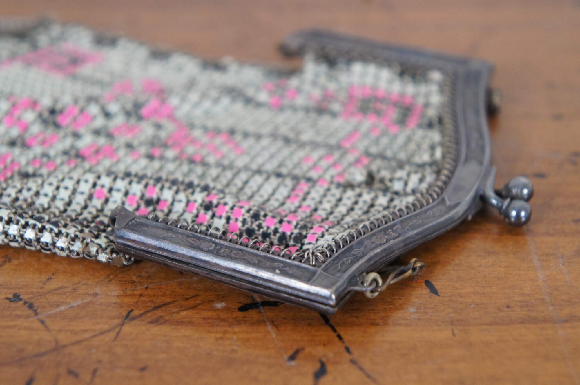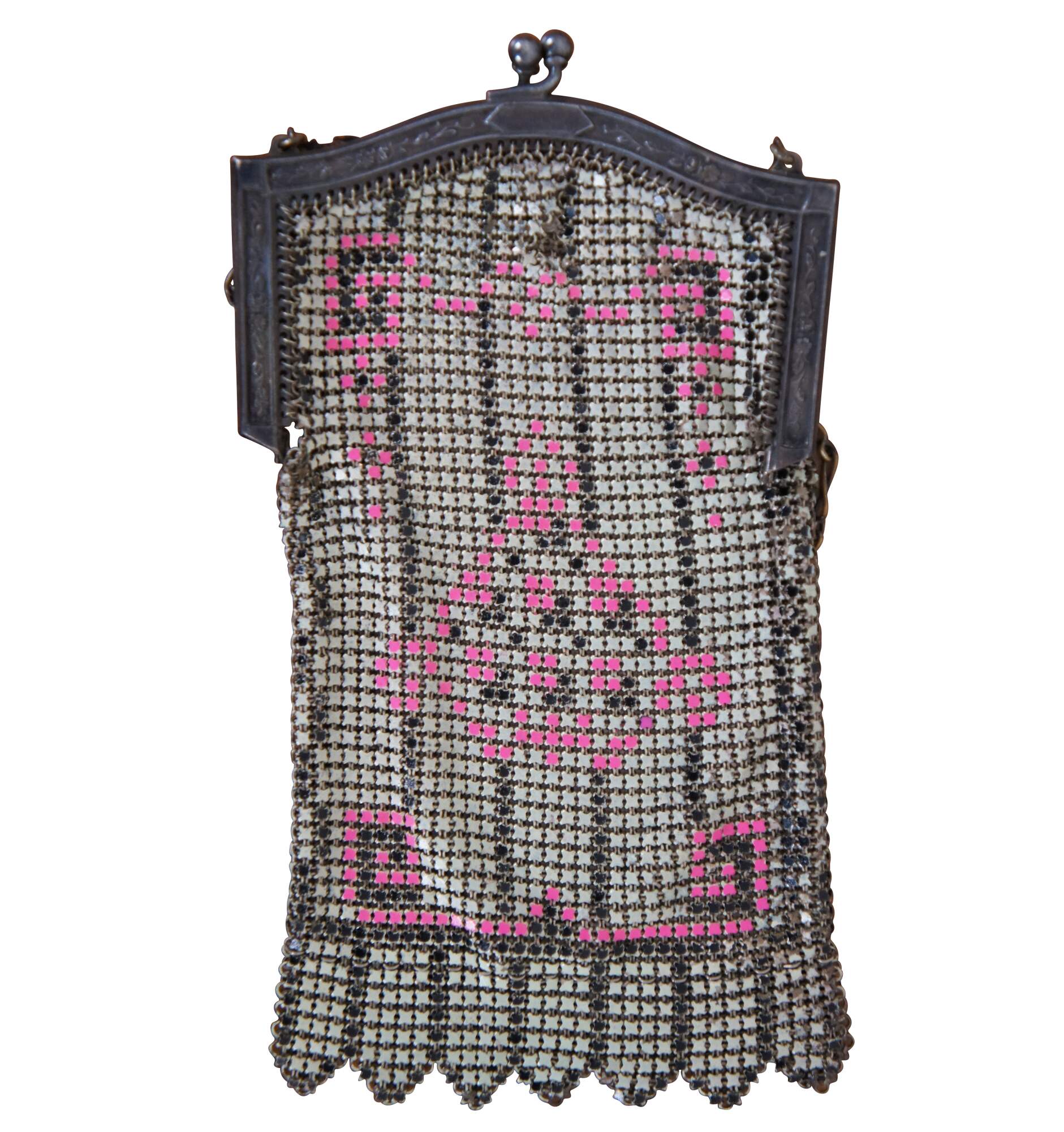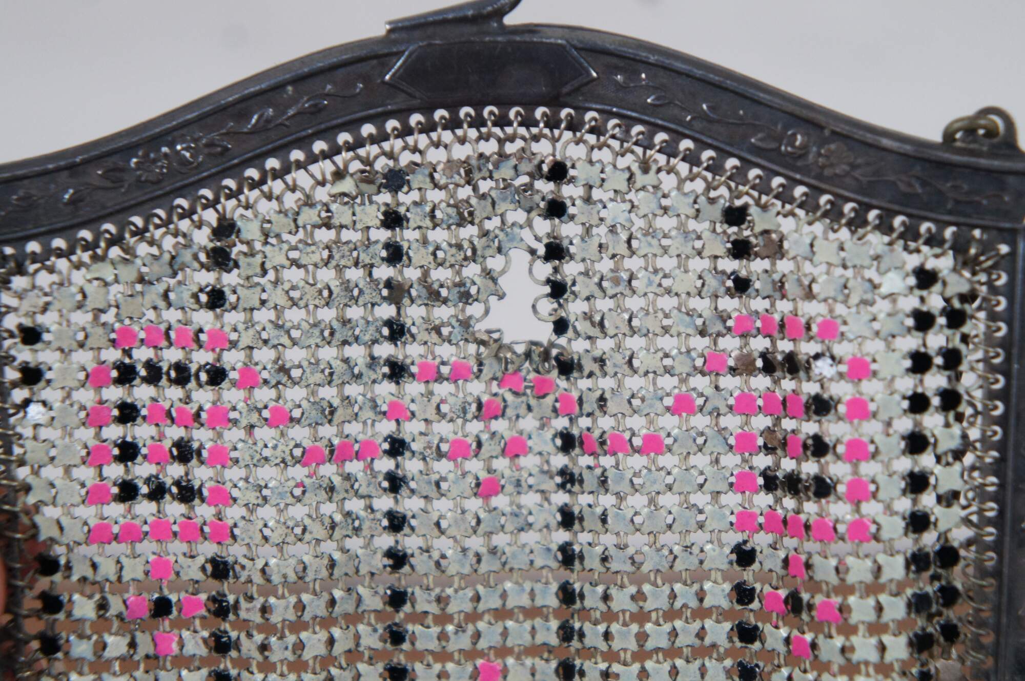 Antique Whiting Davis enamel mesh coin purse or handbag in beige/ off white with pink accents.