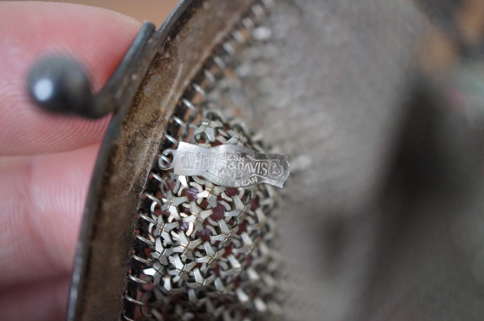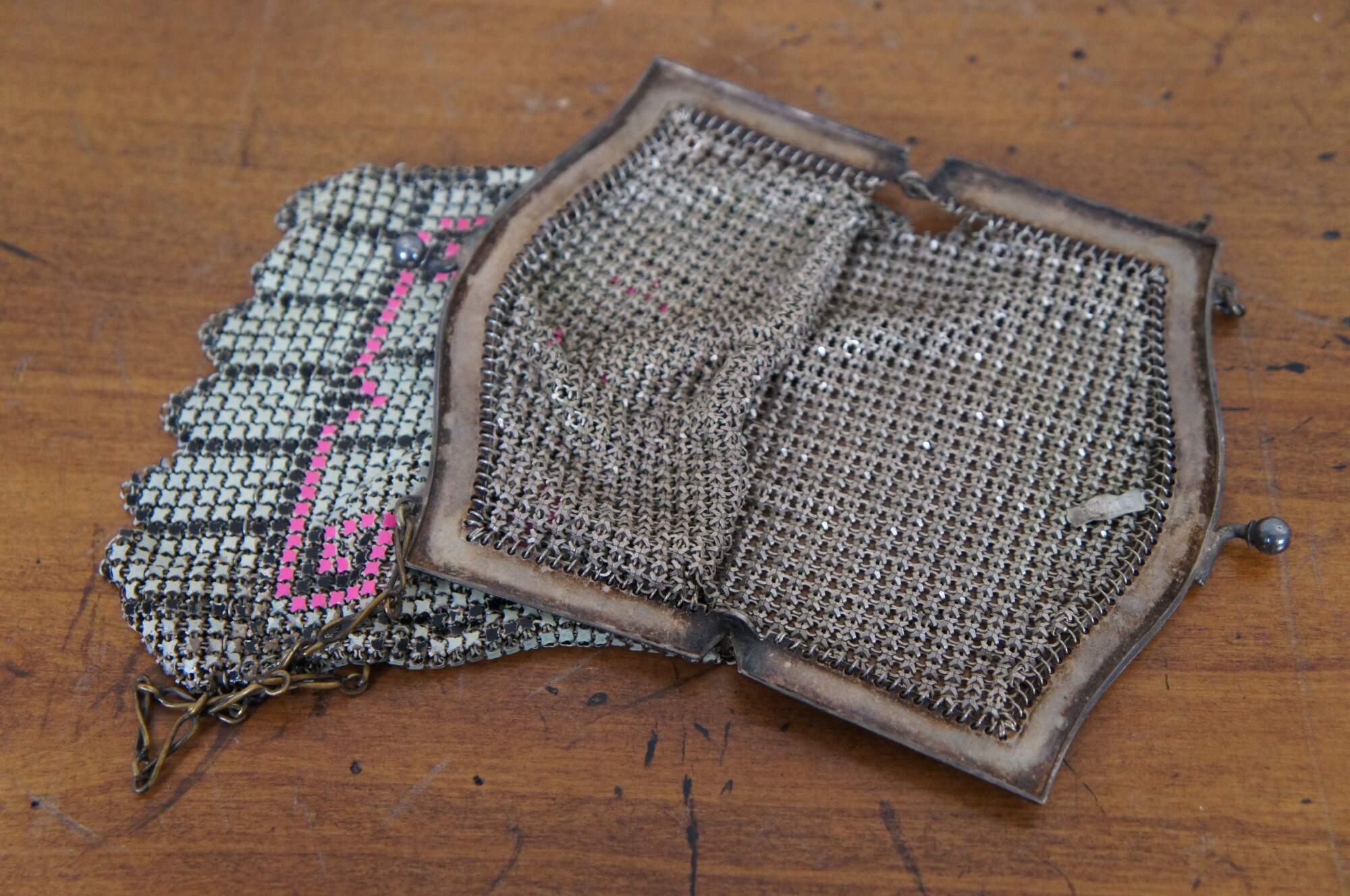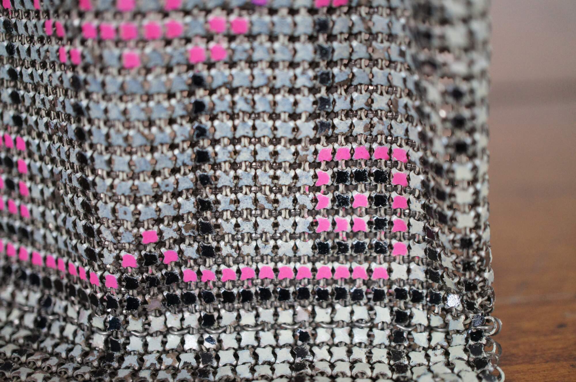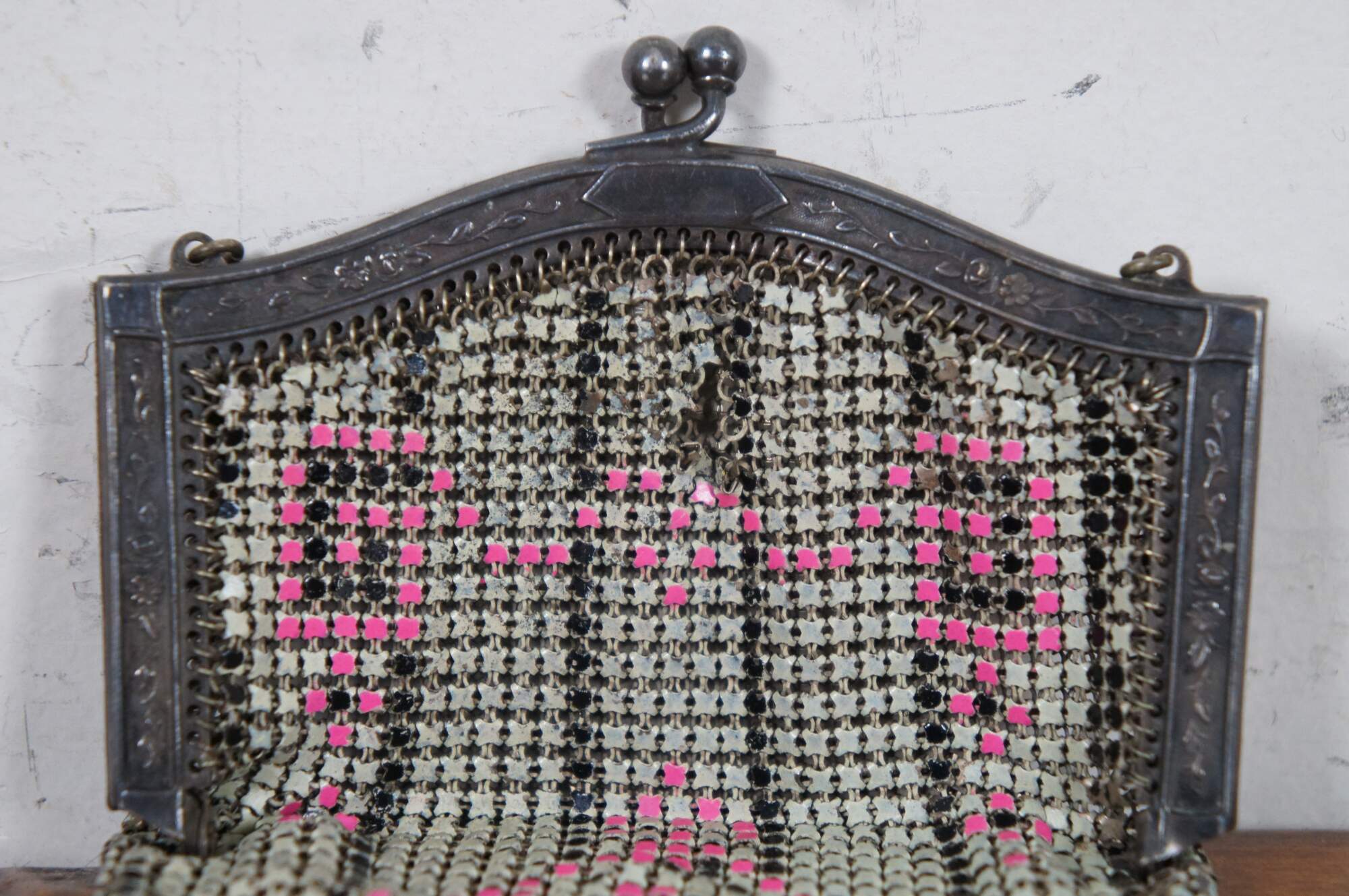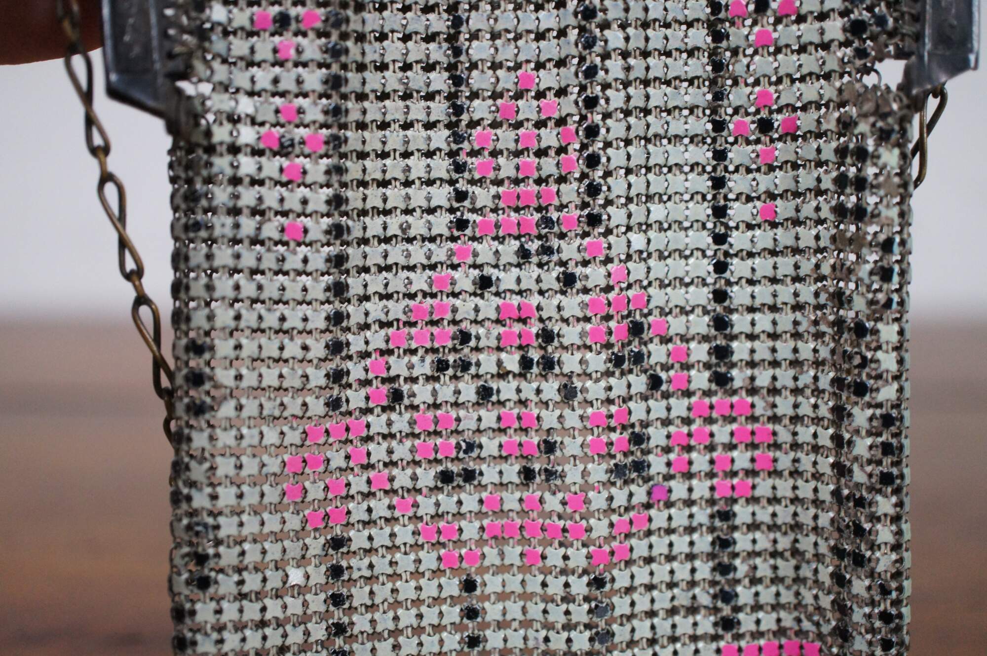 Antique Whiting Davis enamel mesh coin purse or handbag in beige/ off white with pink accents.